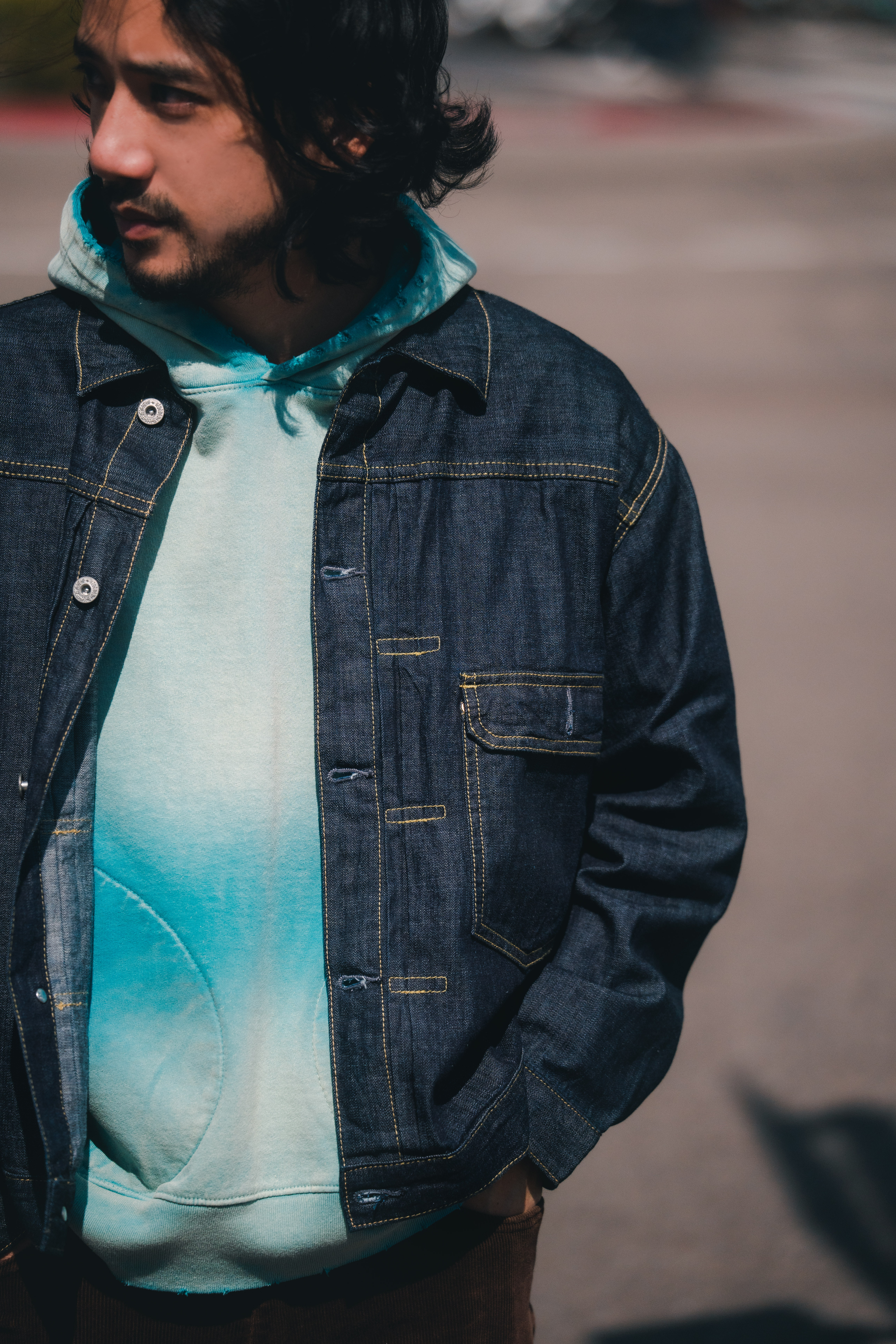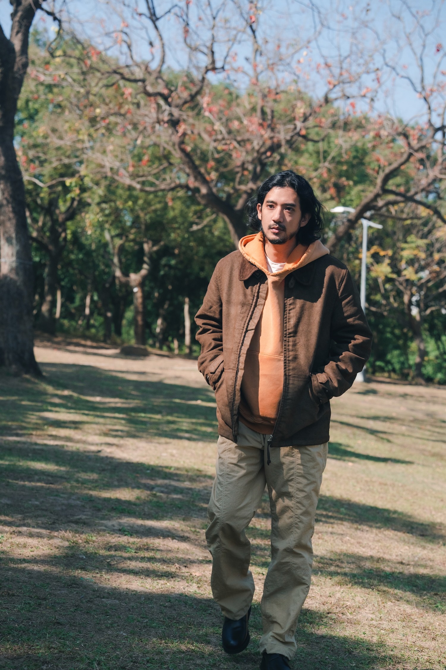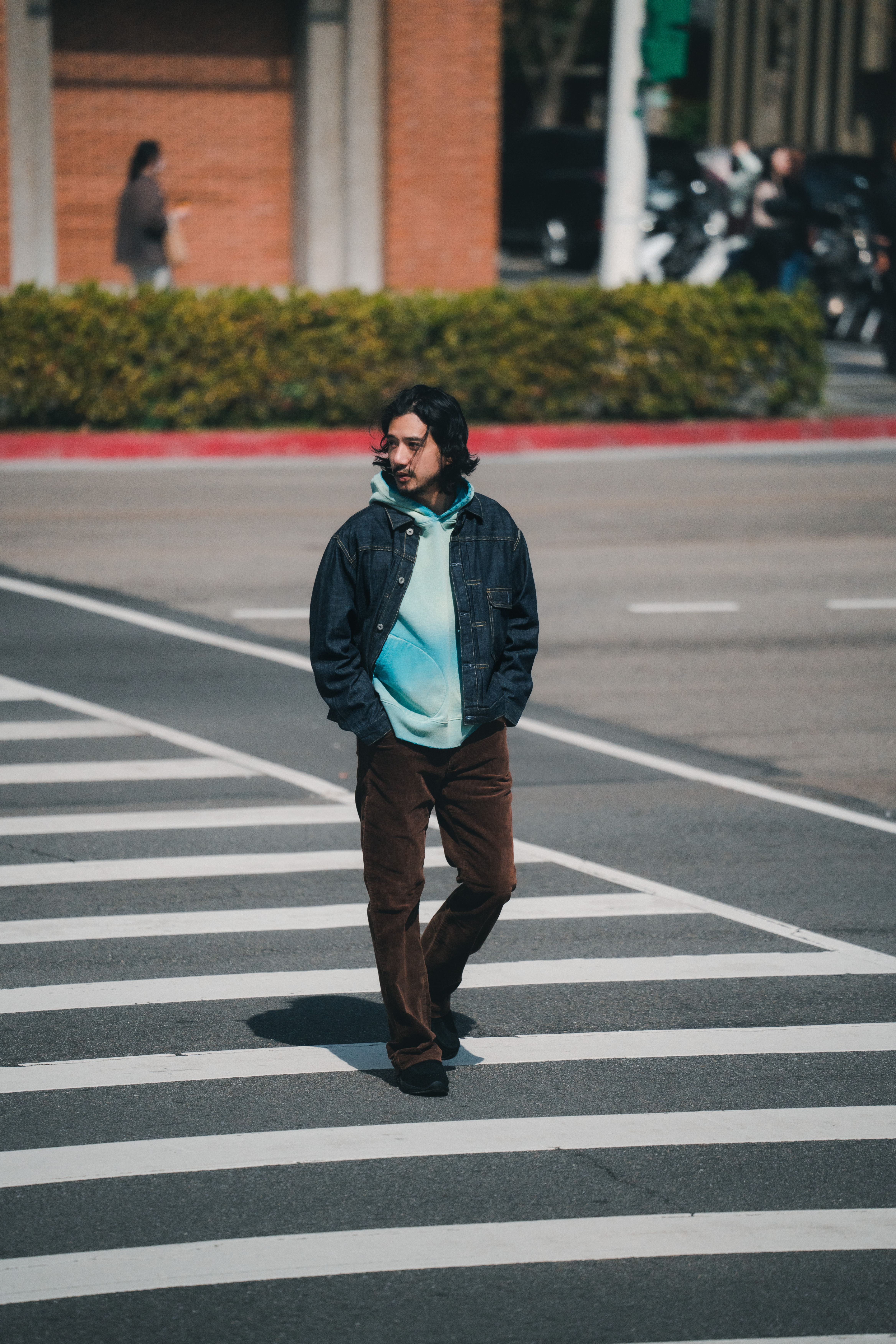 為了增強古著感的氛圍,我們選擇了咖啡色燈芯絨長褲,與上衣的刷舊相互呼應。再搭配 Houston 經典 Type 1 深藍色丹寧外套,整體呈現出和諧的對比感。