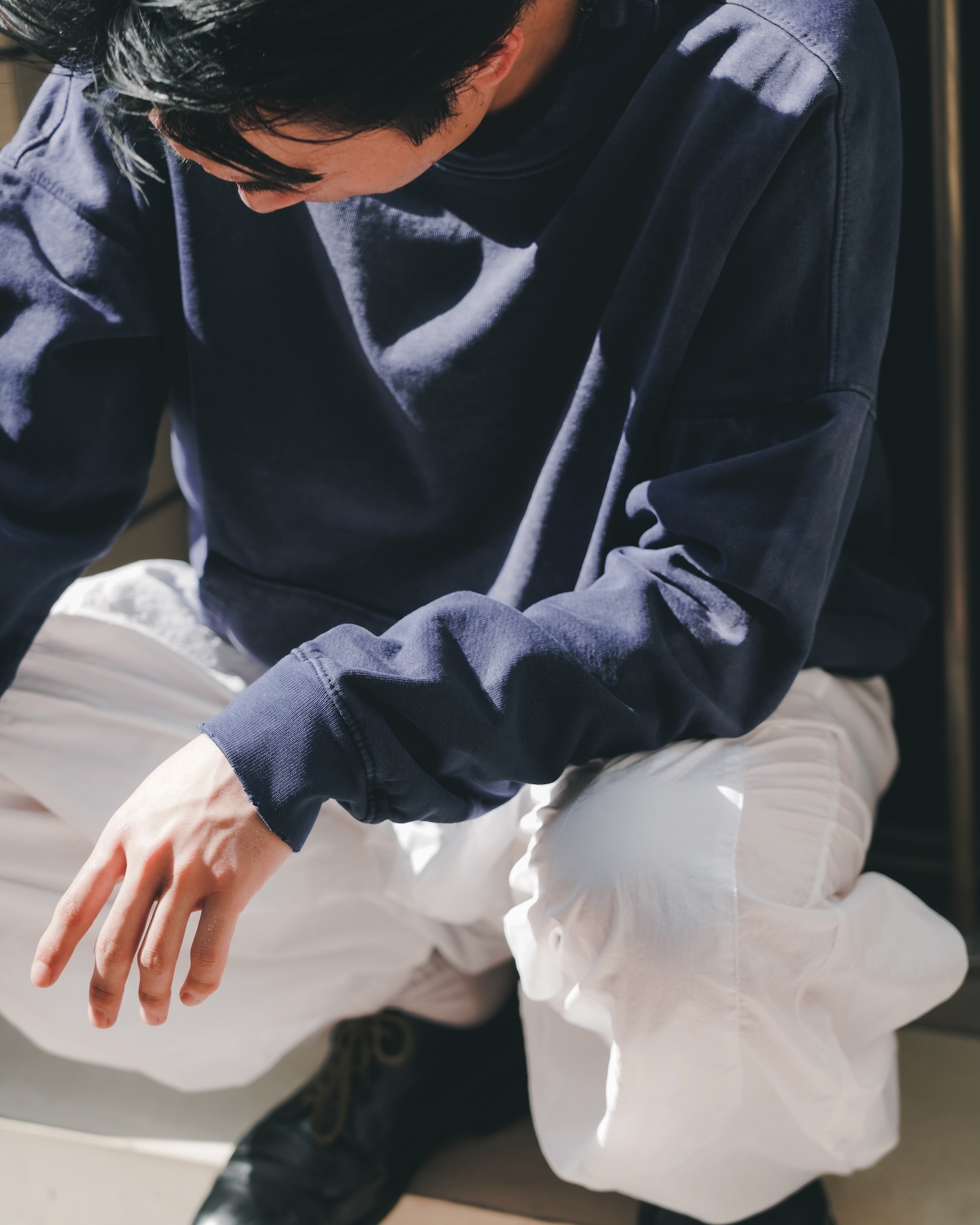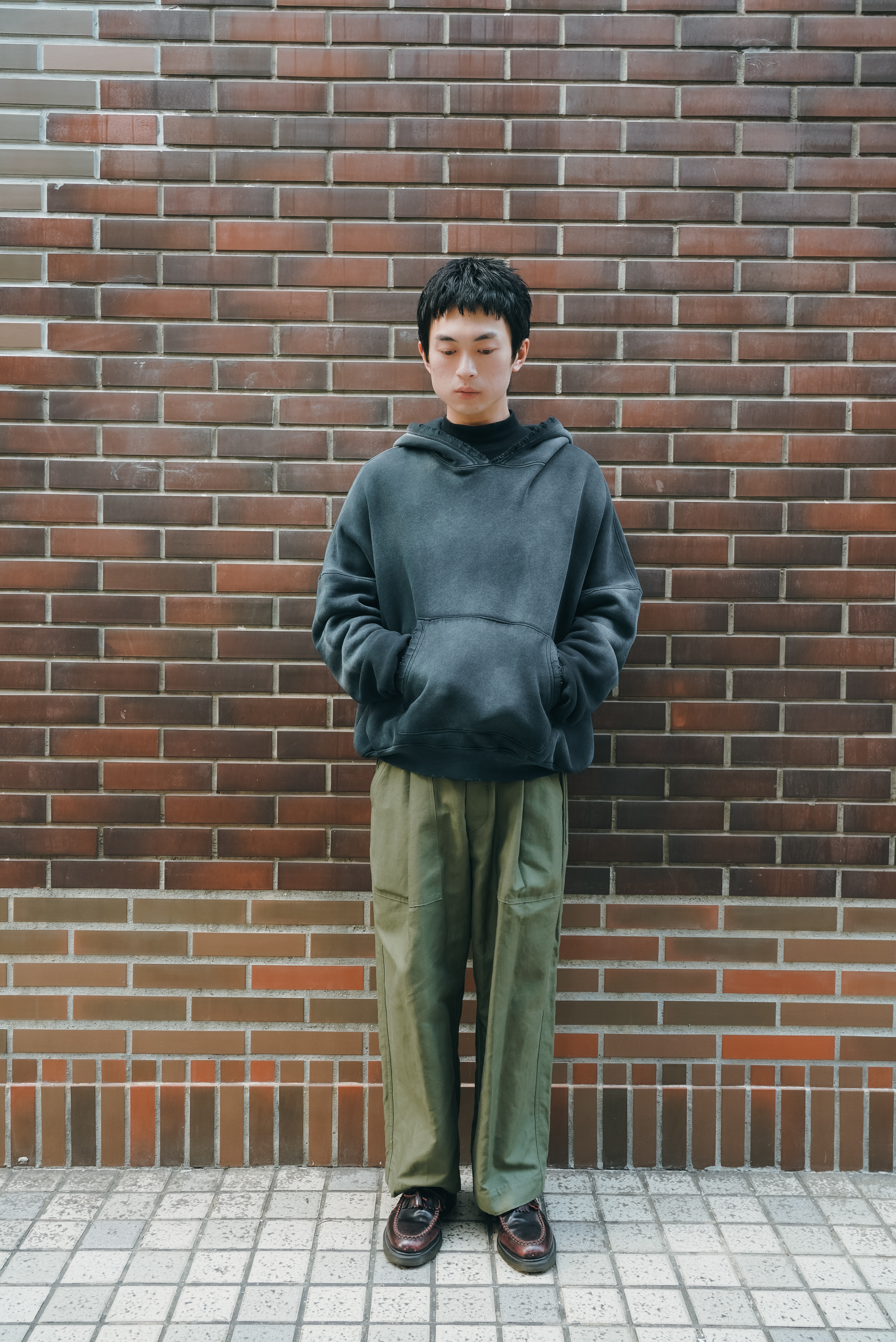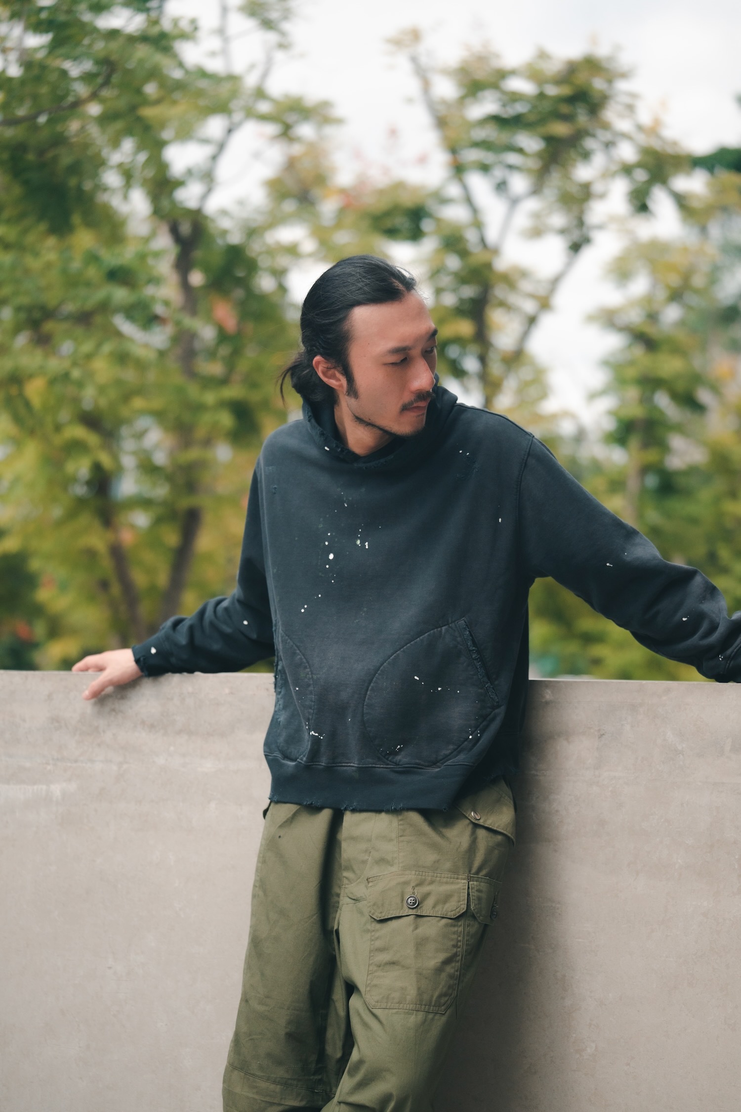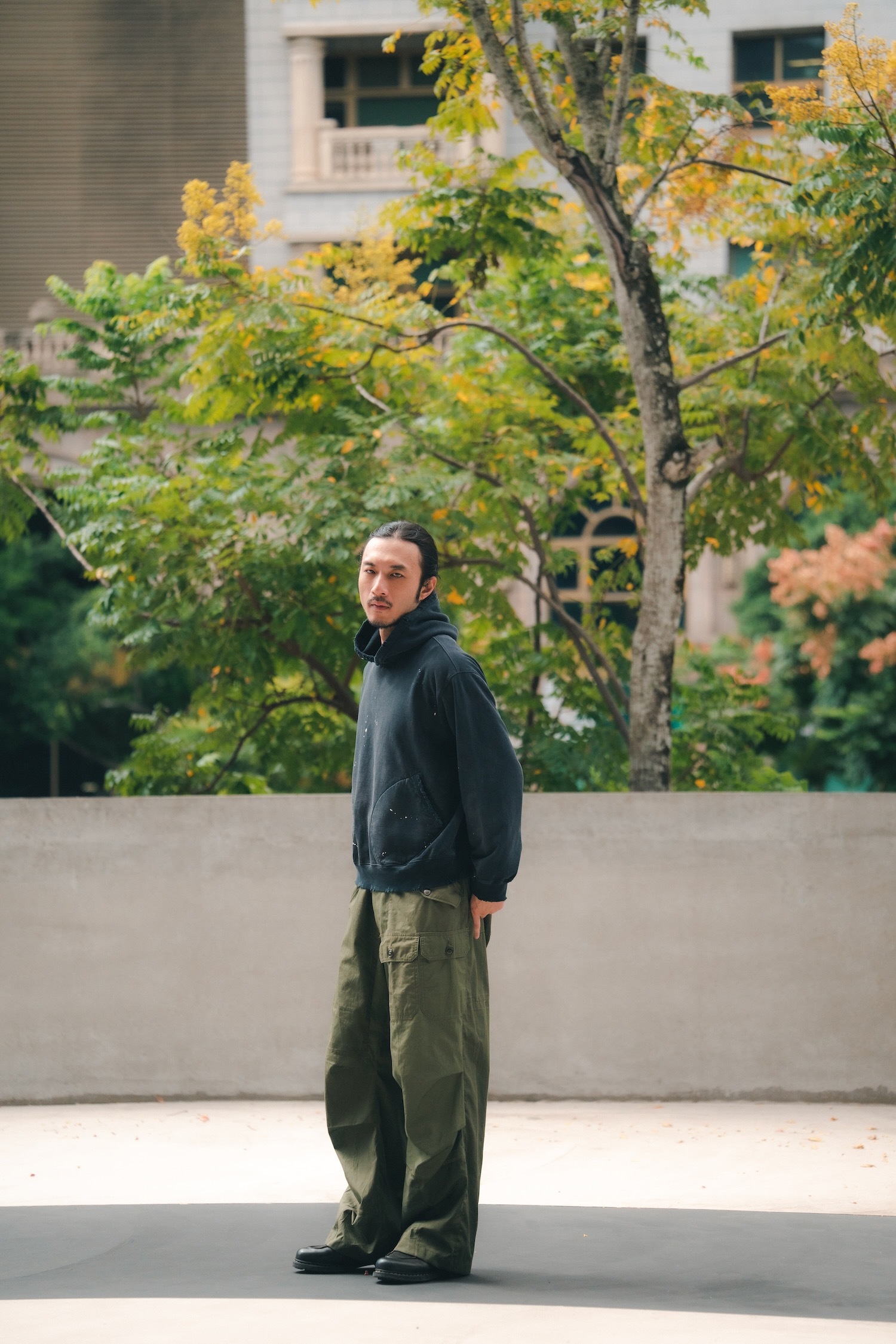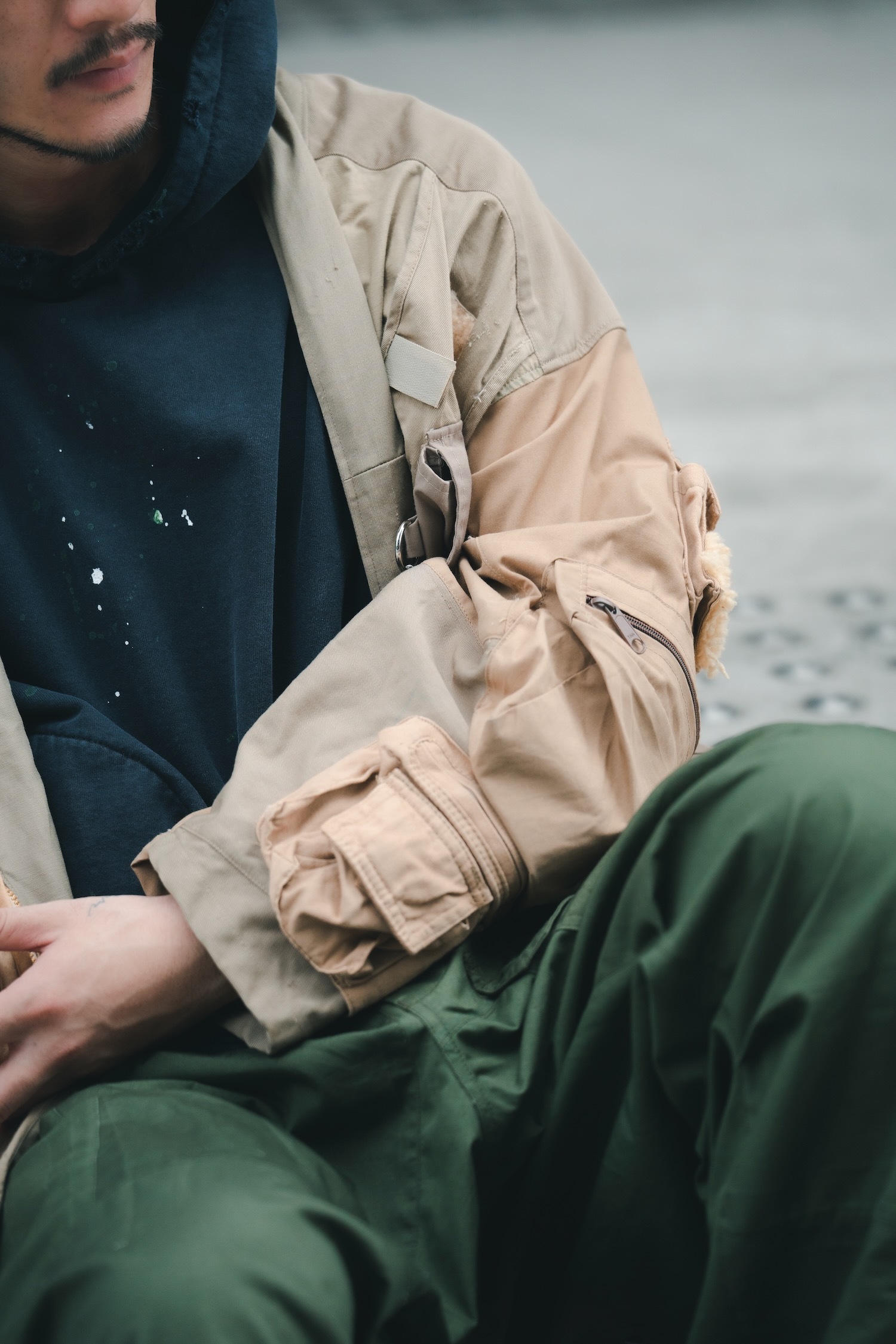 下身可選擇同樣刷舊的工作褲或軍褲,我們搭配了 Remake by Yi 的拼接軍褲,這款軍褲是由 Vintage 古著軍褲改製而成,