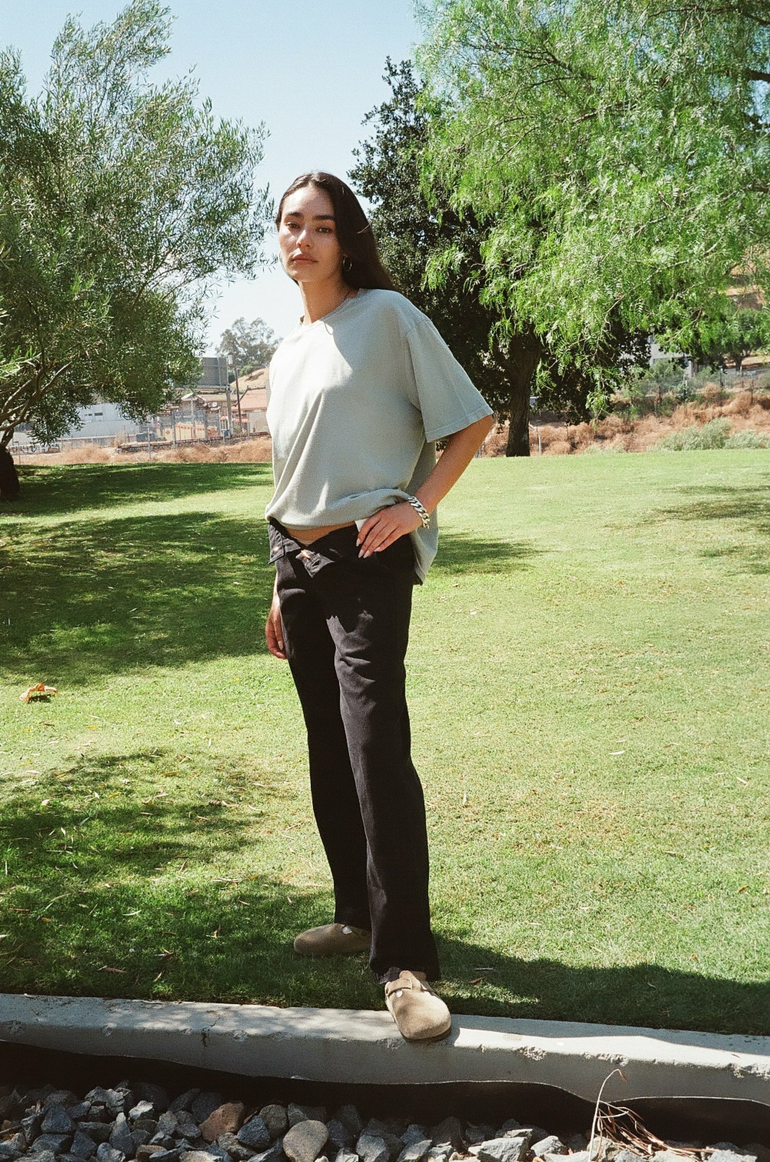 100% 純棉材質10 盎司厚實帆布 (Heavy Canvas),褲長設定短版,建議選擇長度至腳踝位置最好看,寬鬆直筒的Baggy版型基本上可以跟你大部分衣服搭配,這款上身就可以穿的很輕薄軟爛也OK了!