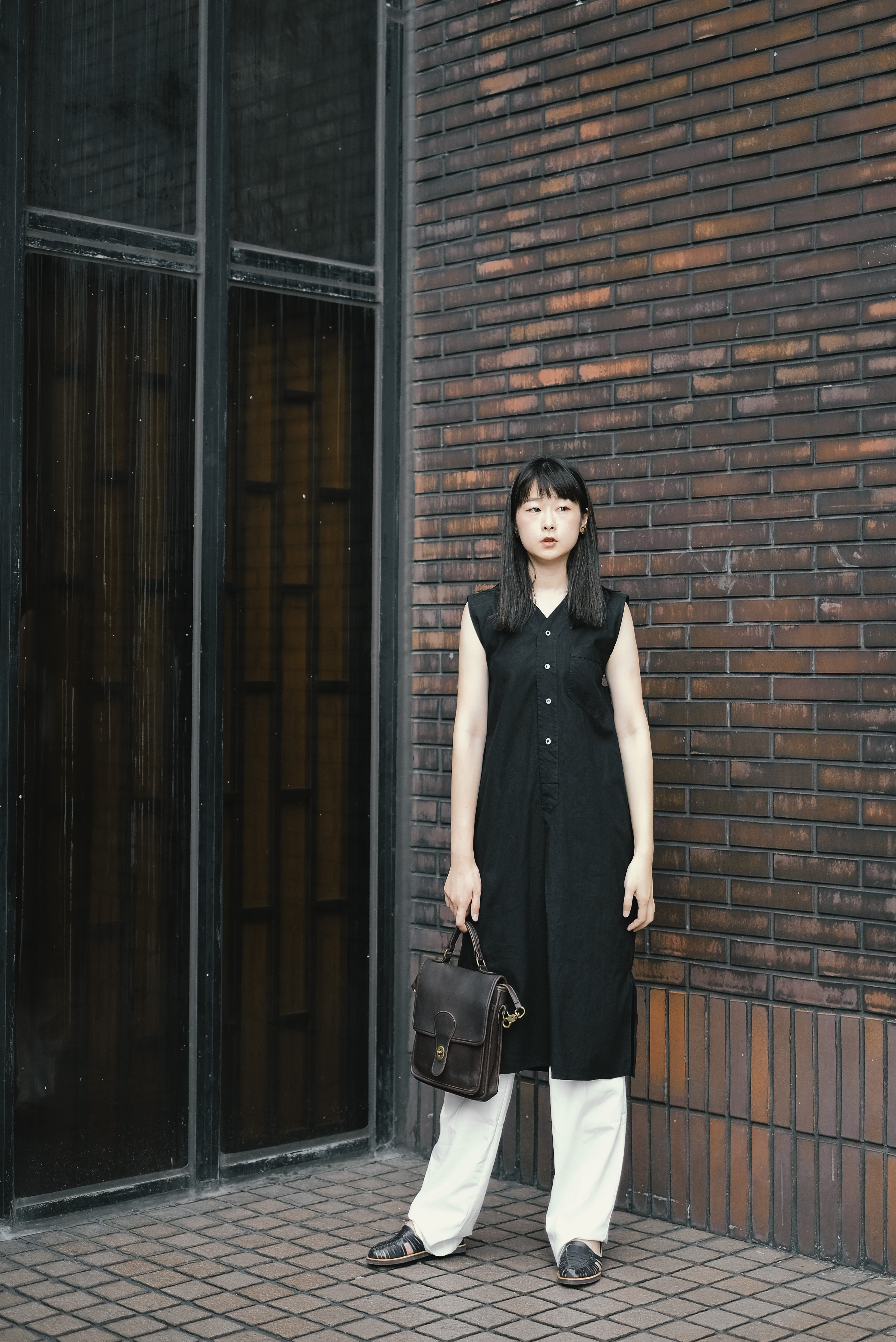 德國軍用長版衫的V型領口緩和了職場襯衫式的拘謹,剛剛好露出兩側的手臂和膝蓋以下的雙腳。