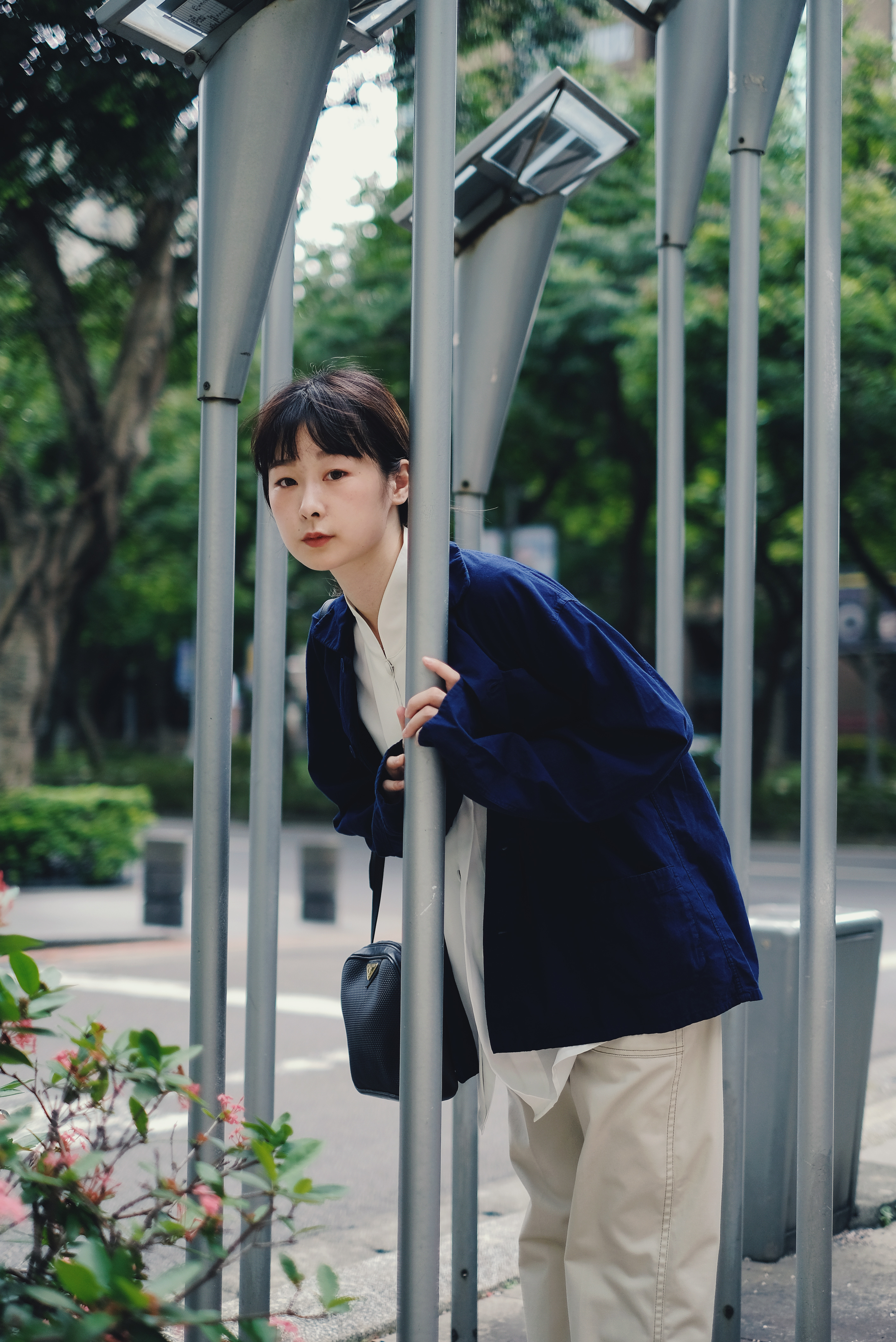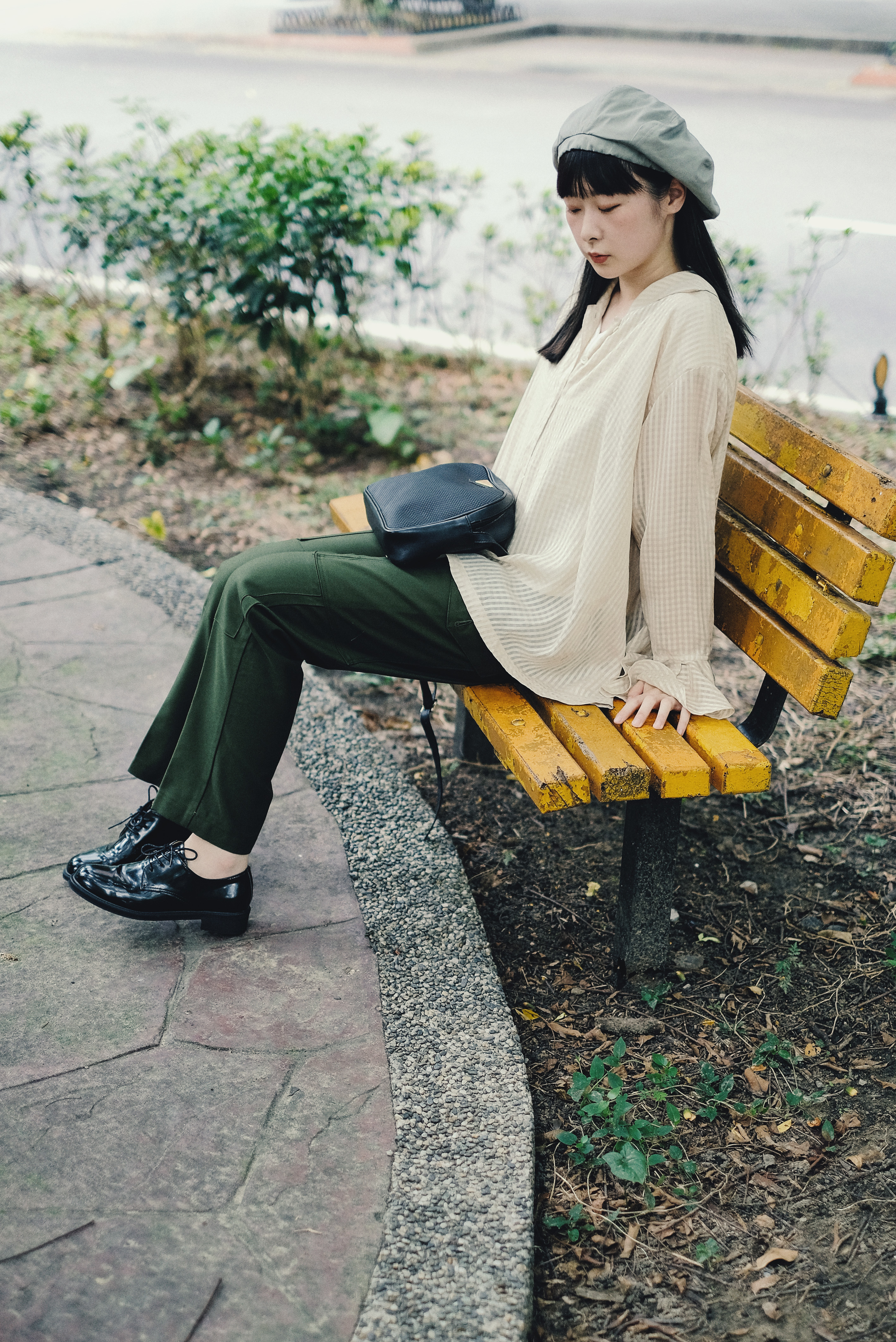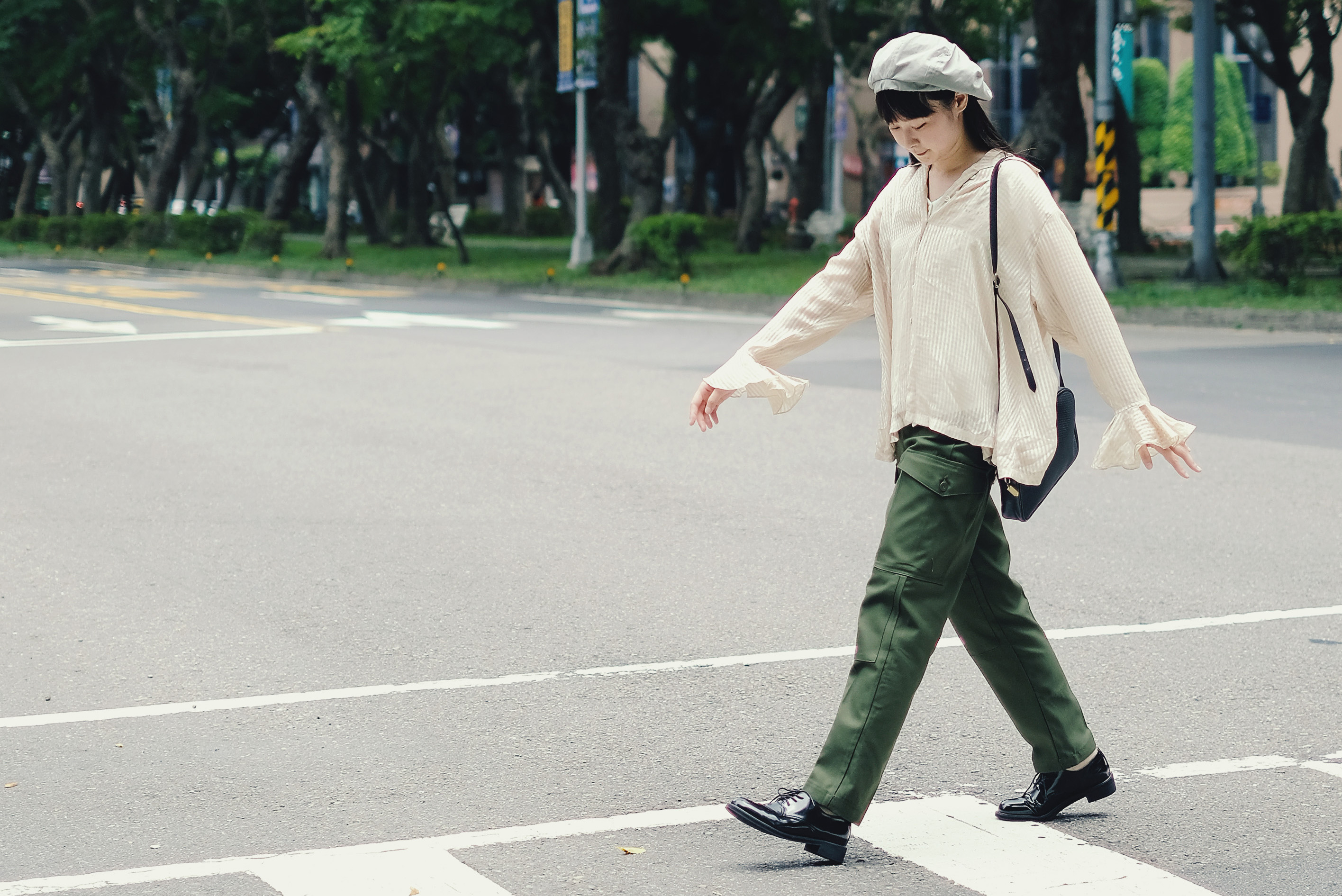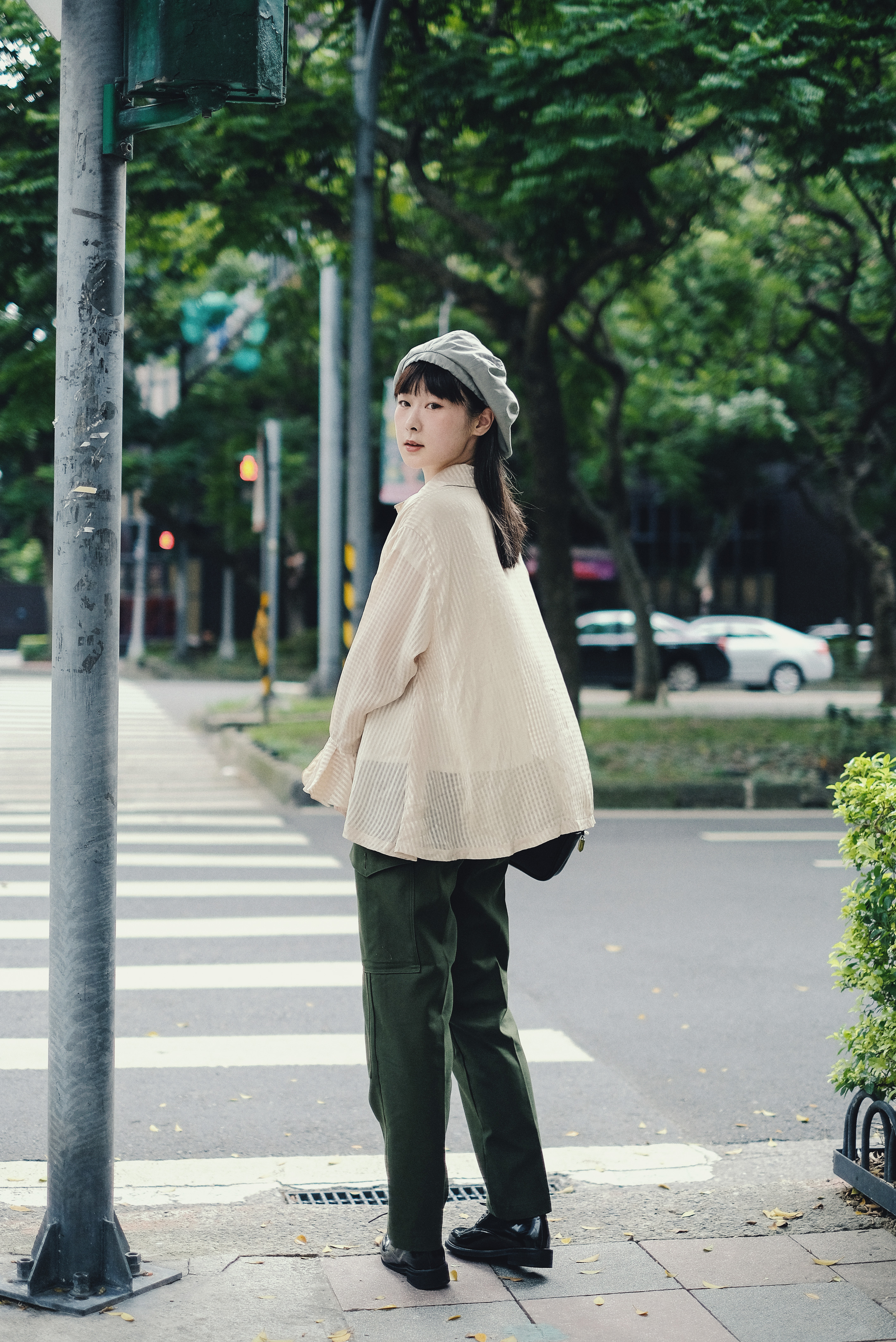 棉料在陽光底下閃著光澤,直挺的版型帶點西裝褲的率性,微高腰的褲頭拉長下身的比例。