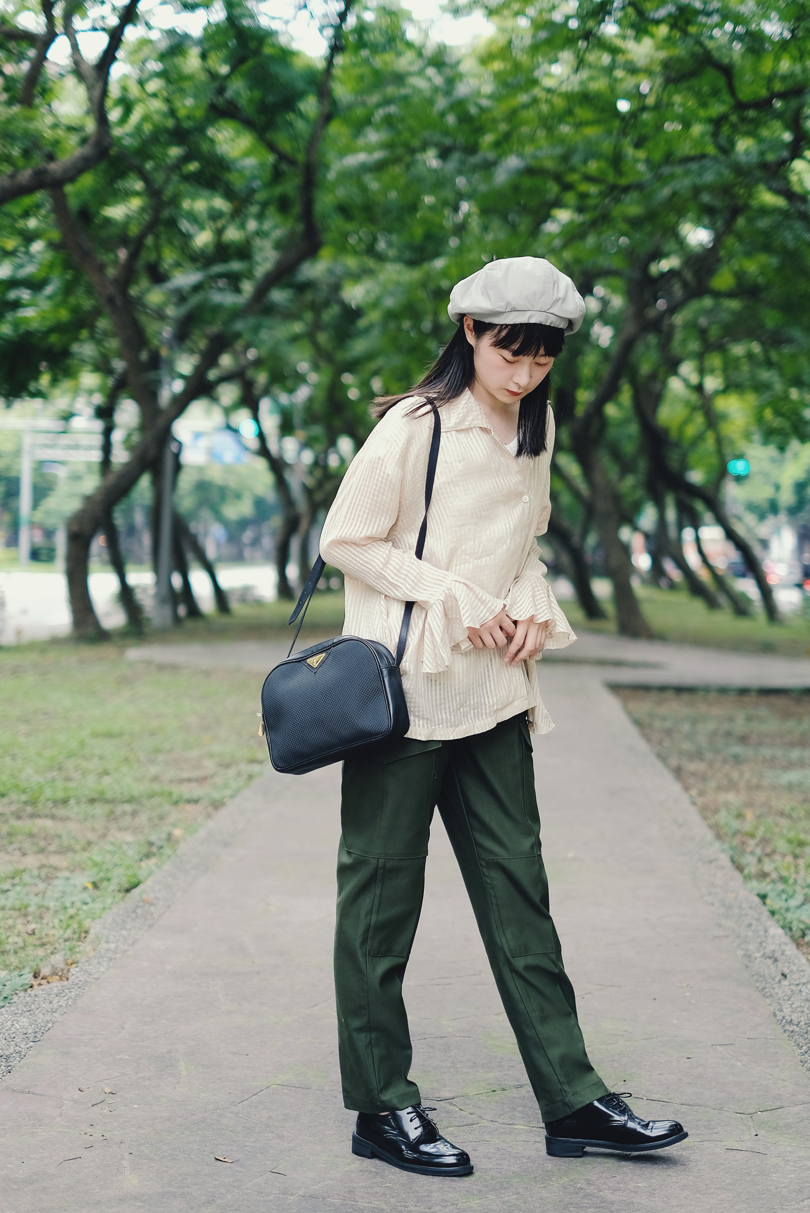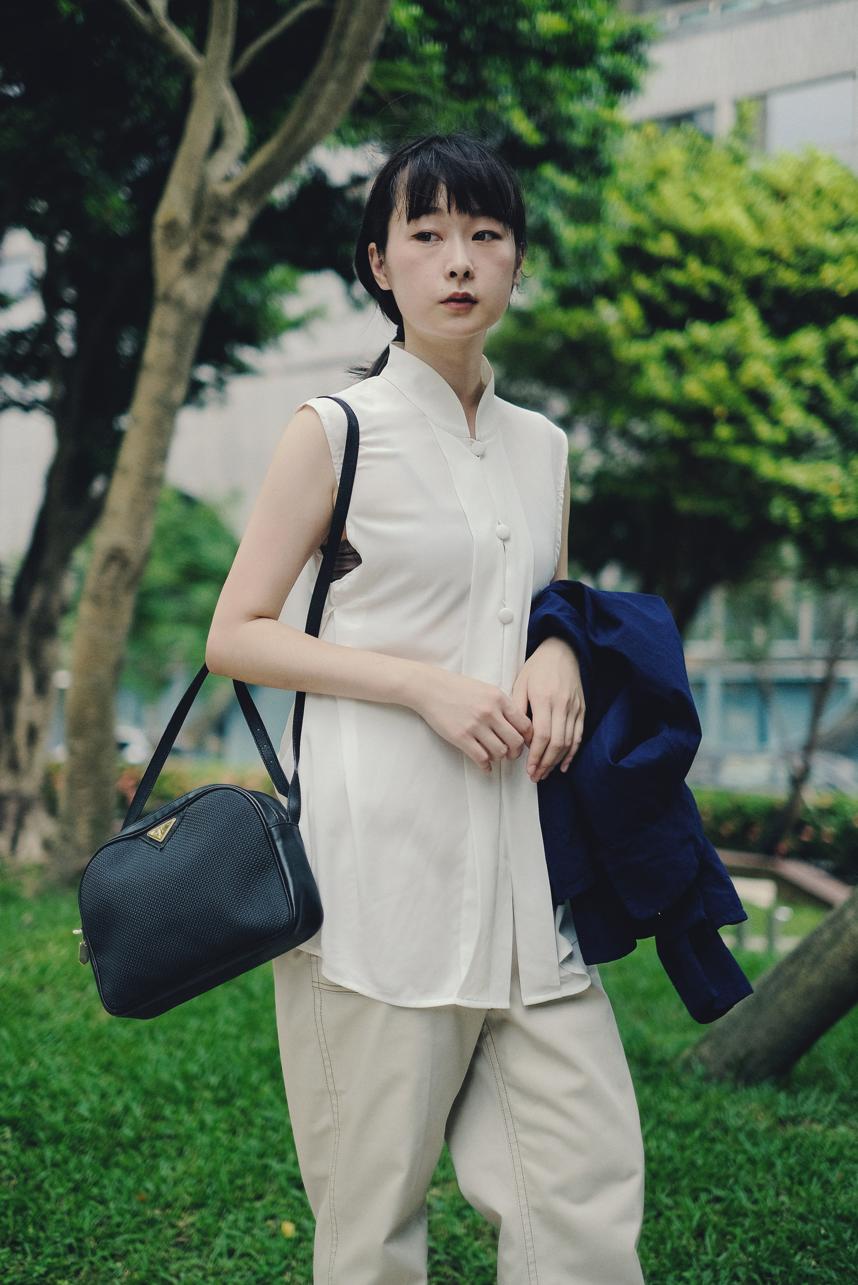 下身搭配淺色的古著長褲凸顯季節的輕盈,同時也將整體視覺沉澱下來,不讓穿搭過於輕佻。