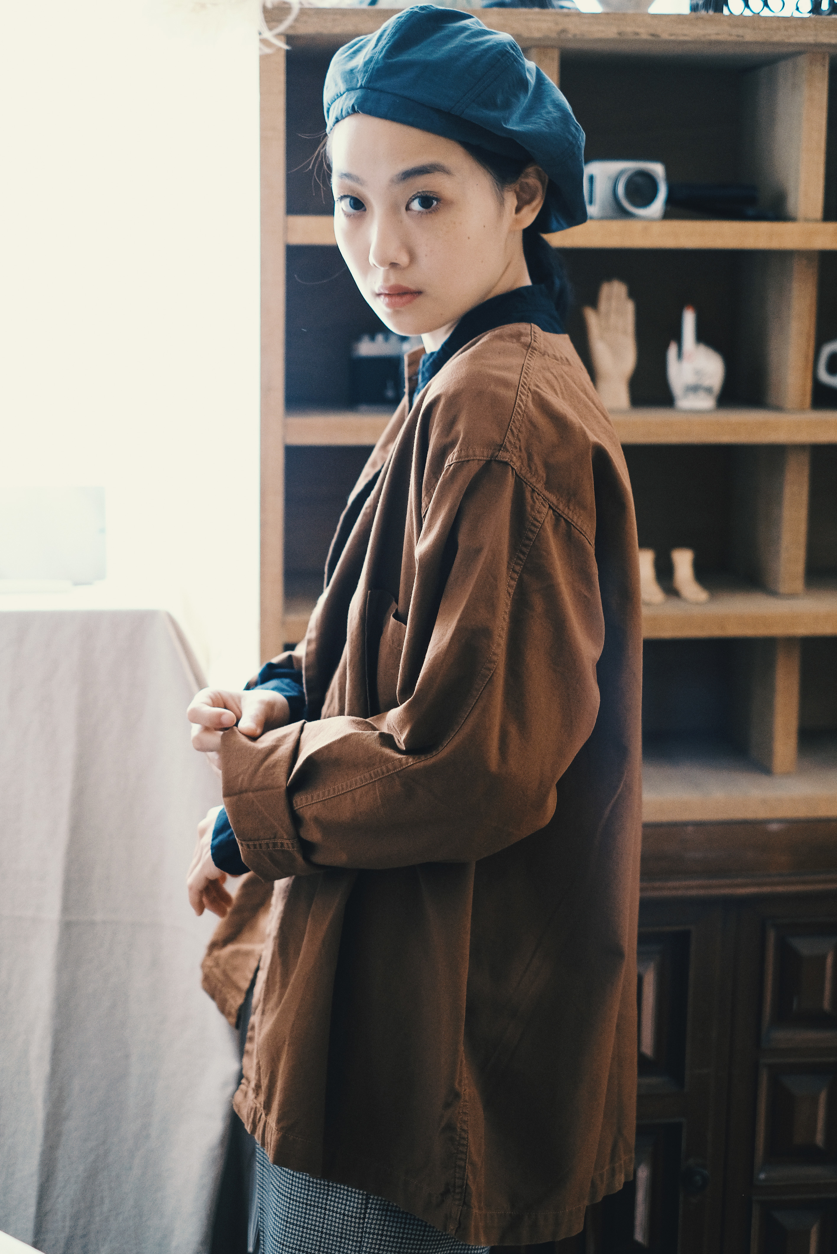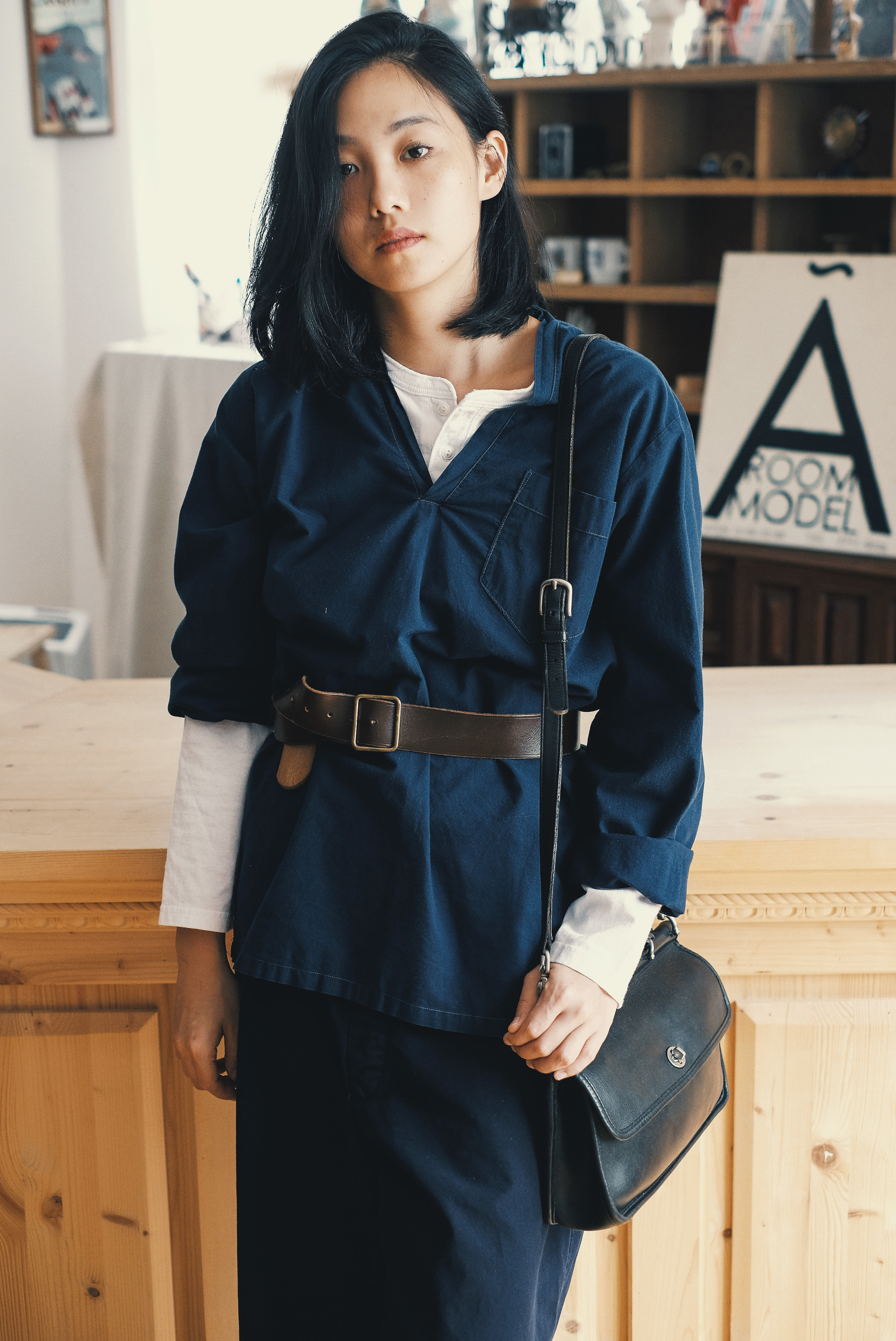 軍品在上班的愜意隨興穿搭也是不可或缺的耐用、實搭單品。由A ROOM MODEL染製的瑞典pullover顏色飽滿,在光線中閃著奕奕的靈氣,即便穿著寬鬆,仍然散發著軍裝堅挺的力道。下擺的雪褲一樣經工作室巧手染製,延續軍用雪褲的高機能性與較寬鬆的褲型,前以鈕扣織帶固定褲頭,後以鬆緊帶延伸腰線,鎖定了硬挺的版型,卻因雪褲的蓬鬆感不顯得嚴肅,遊走在正式與寬鬆舒適之間,體現穿搭的細節。