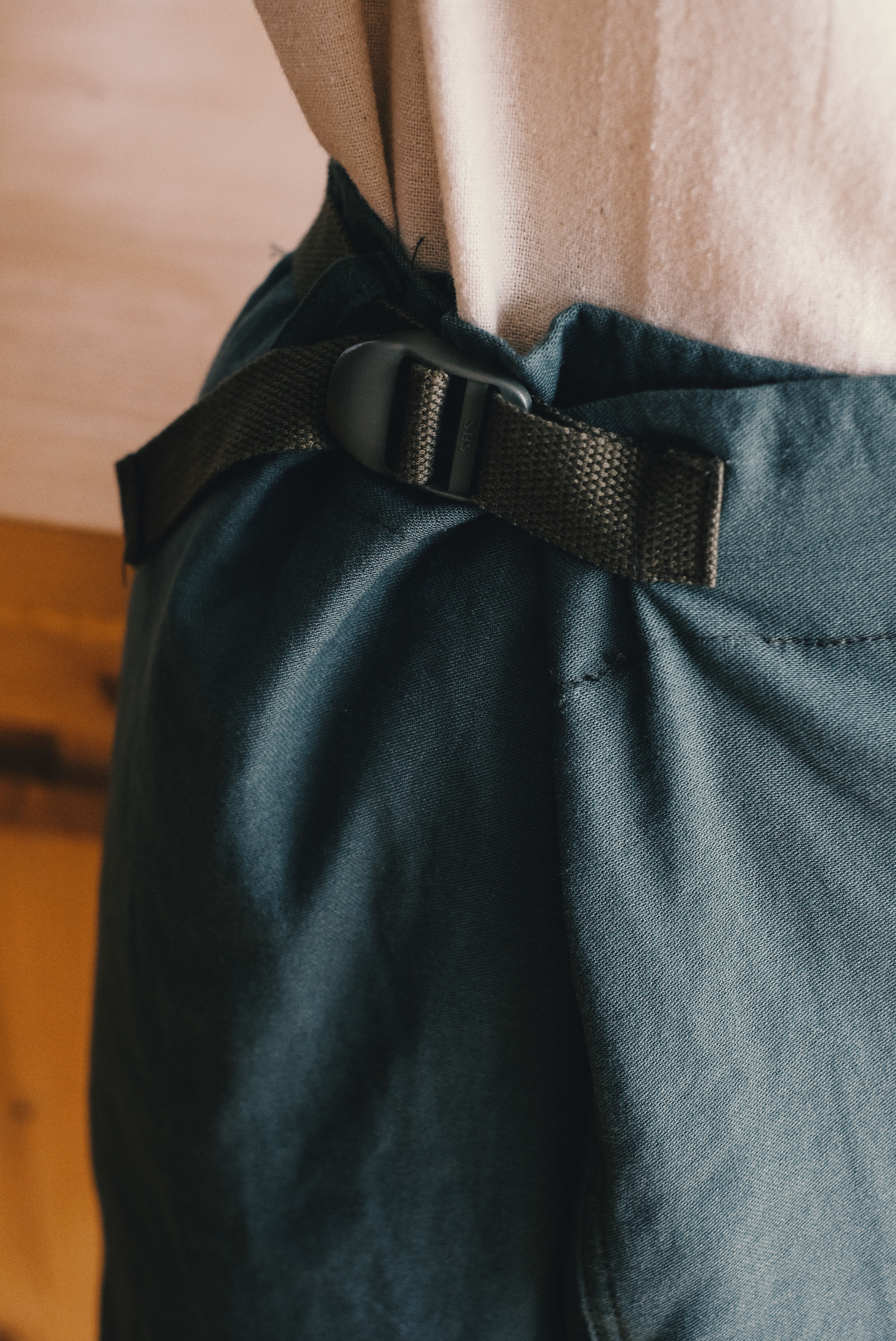 帶有A字輪廓的A ROOM MODEL改製美軍布料長裙,透過雙側釦可以隨意調整腰線,挺直的斜紋布不會貼著雙腳,避開了夏天可能的黏膩感、也為初秋增添了視覺份量,以俐落蓬鬆的線條加強身形的立體感。也可以稍稍調整褲頭,傾斜的腰線增加層次感,讓女性化的長裙不會因為大面積顯得呆板,而是流露出別出心裁的迷人氣息,讓人忍不住回頭多看幾眼。