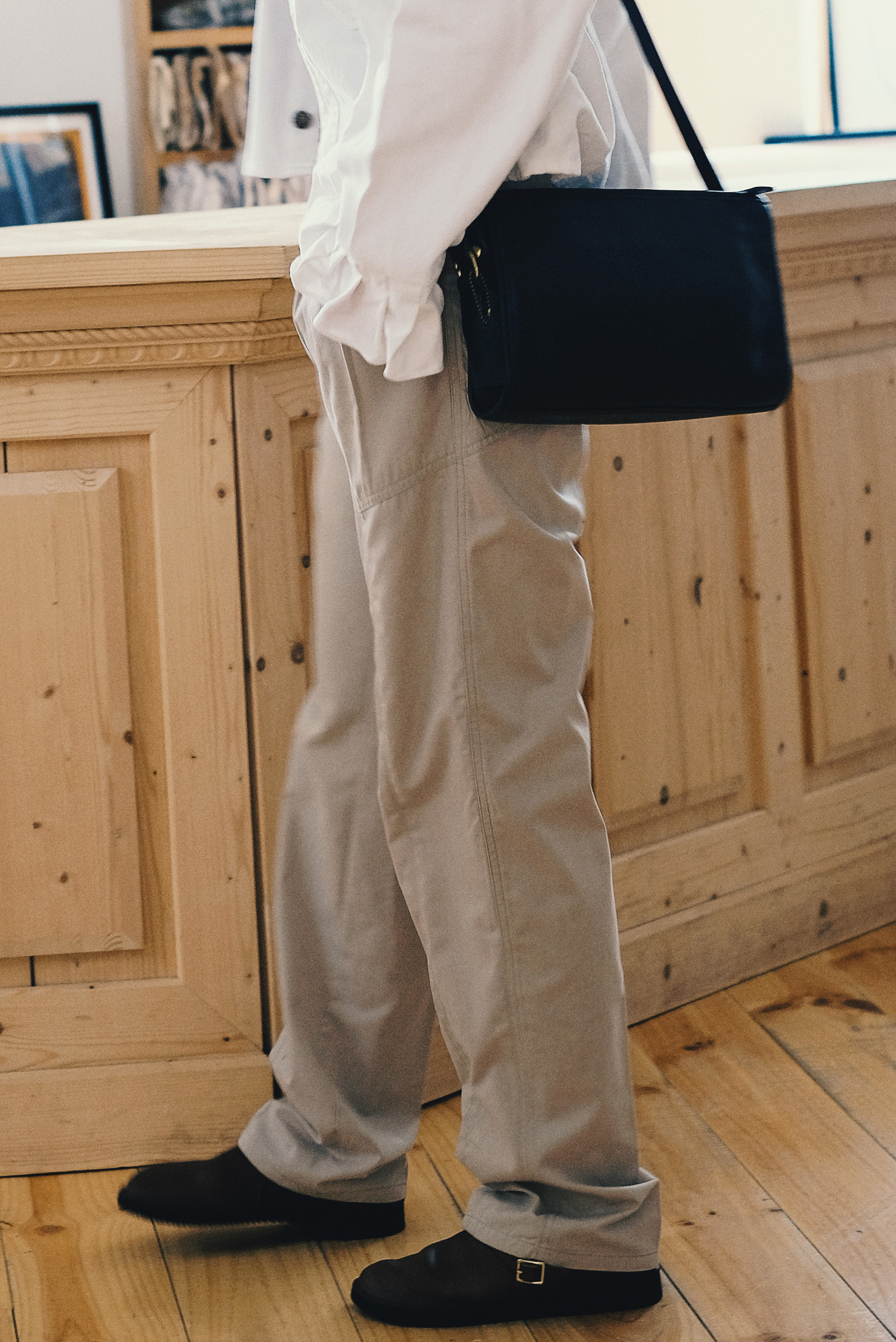 上身以DANTON條紋T-Shirt搭配明亮的白色寬褲;作為工裝品牌的DANTON,版型設計絲毫沒有美式工裝的粗曠,而是著重在實用別緻的設計,製作紮實並講究細節。換上法軍公發的皮鞋、罩上翻領的襯衫外套,融合休閒與正裝,讓穿搭不會因為T-Shirt和寬褲使形象過於休閒,同時也不過度拘泥於職場的正式感,展現不受框架限制