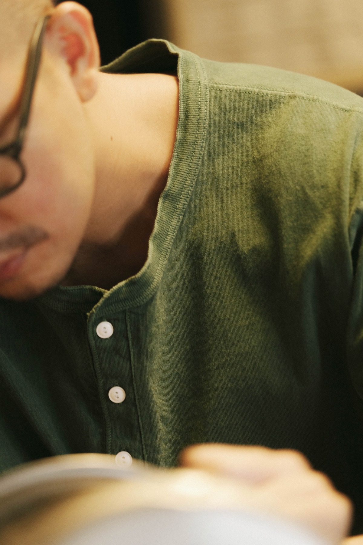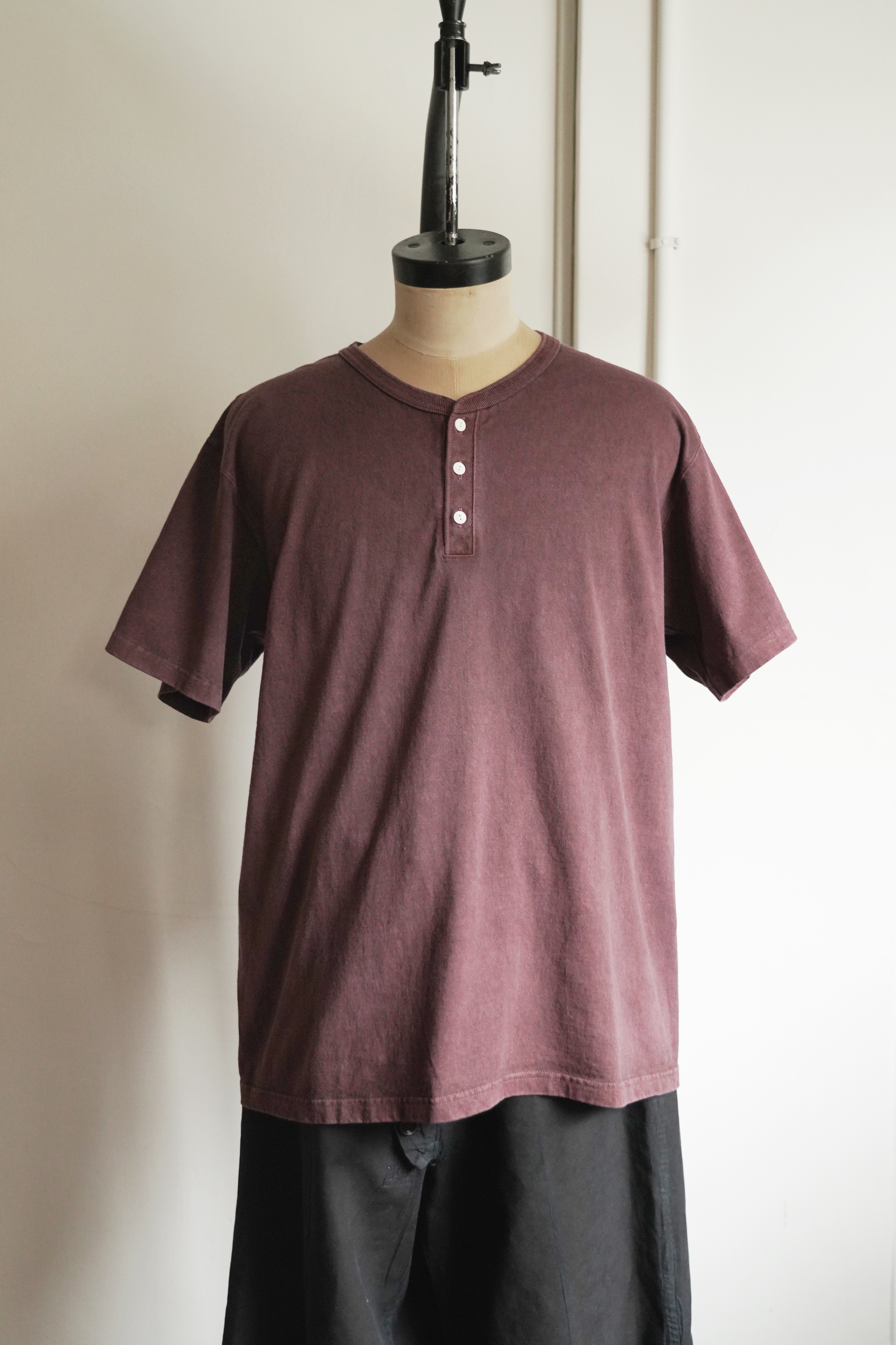 亨利領一向是在T-shirt的休閒與襯衫的正式間取得中間值的選擇,既有T-shirt的版型,又保有襯衫扣子的特色。100% 有機棉製成的天竺棉,有優雅而溫和的石南花般的顏色和質地,獨有的伸縮性、彈性、柔軟,且薄而輕的質料,即使在炎熱的季節也具有出色的透氣性,因為良好的質地在與皮膚的接觸上柔軟、且無壓力,版型以經典運動衫的規格設計,留出適度的空間感,在面料獨特的凹凸紗線、S形接縫的4針縫製、與領口及羅紋處等,都是需要更為耗時的技術才能呈現的細節巧思。
