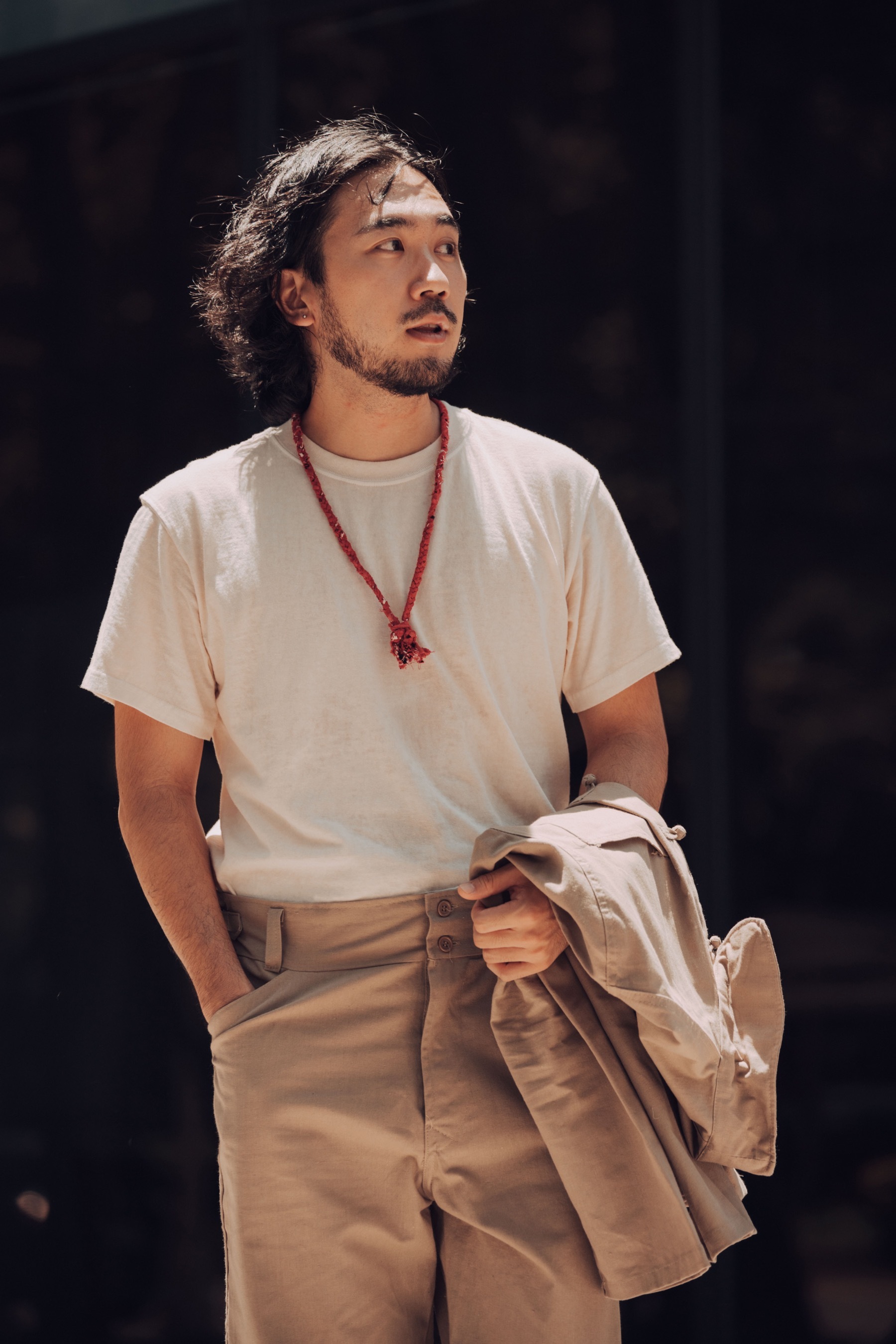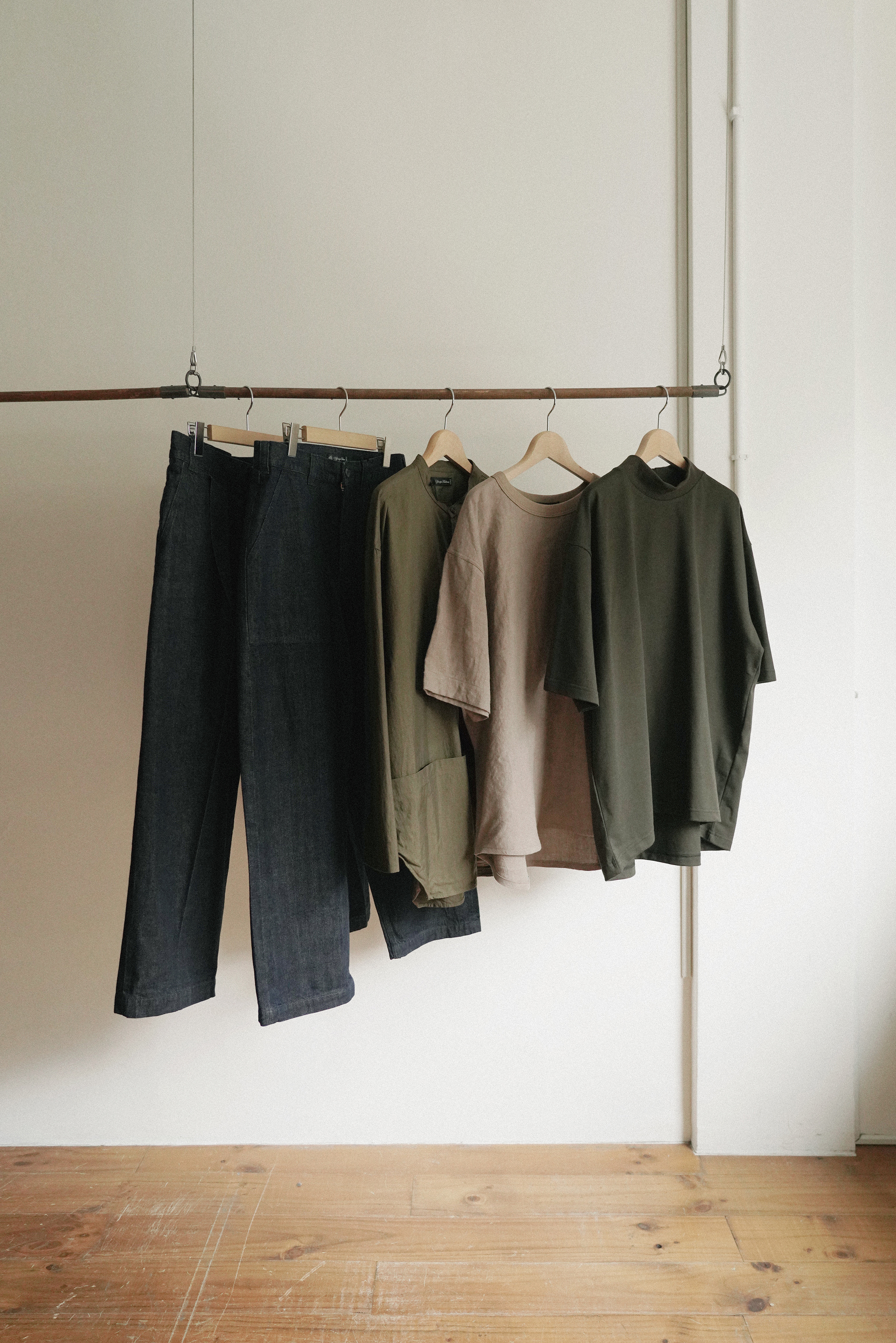 假設今天突襲一個男生的房間,可能會看到什麼畫面呢?桌上立著杯盤狼藉來不及收的飲料瓶、食物包裝袋、衛生紙之外;椅子上披著好幾天沒洗的T-shirt,一路垂到地上;地上擺著幾雙顏色不同不成對的球狀襪子;床上放著還沒摺好收進衣櫃的亨利領上衣、短褲;衣櫃掛著一些tee、長褲、薄外套。有點亂亂髒髒的但很舒服,這大概也是你房間夏天的光景。