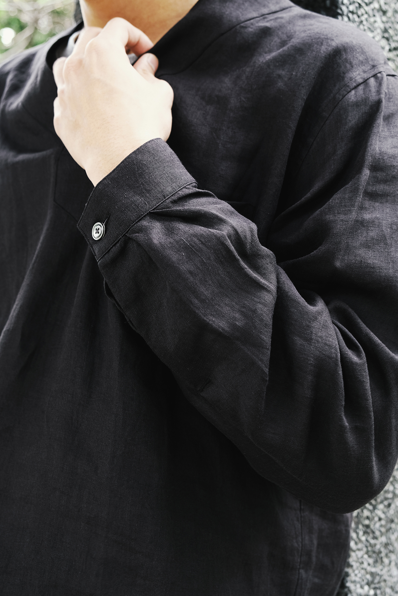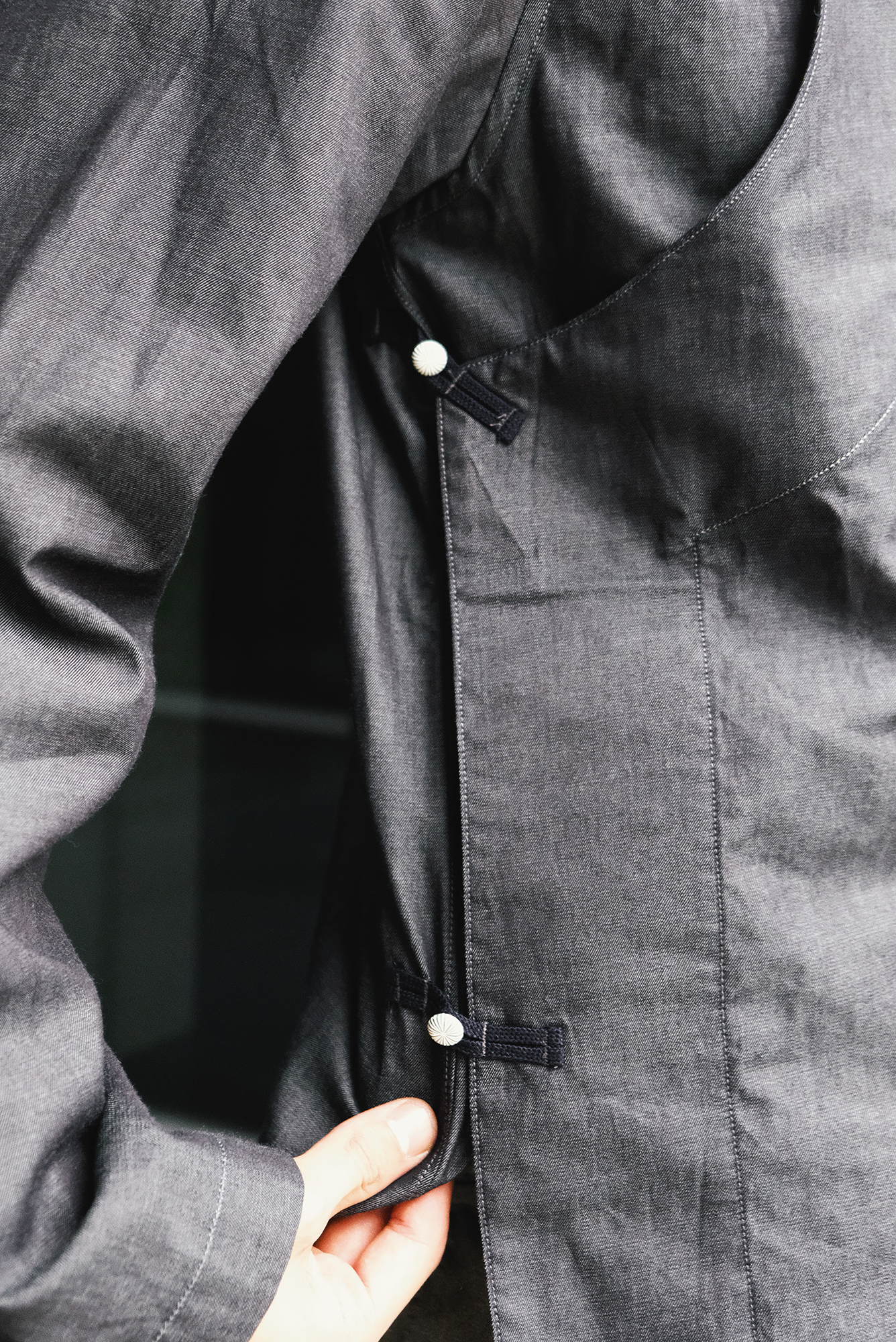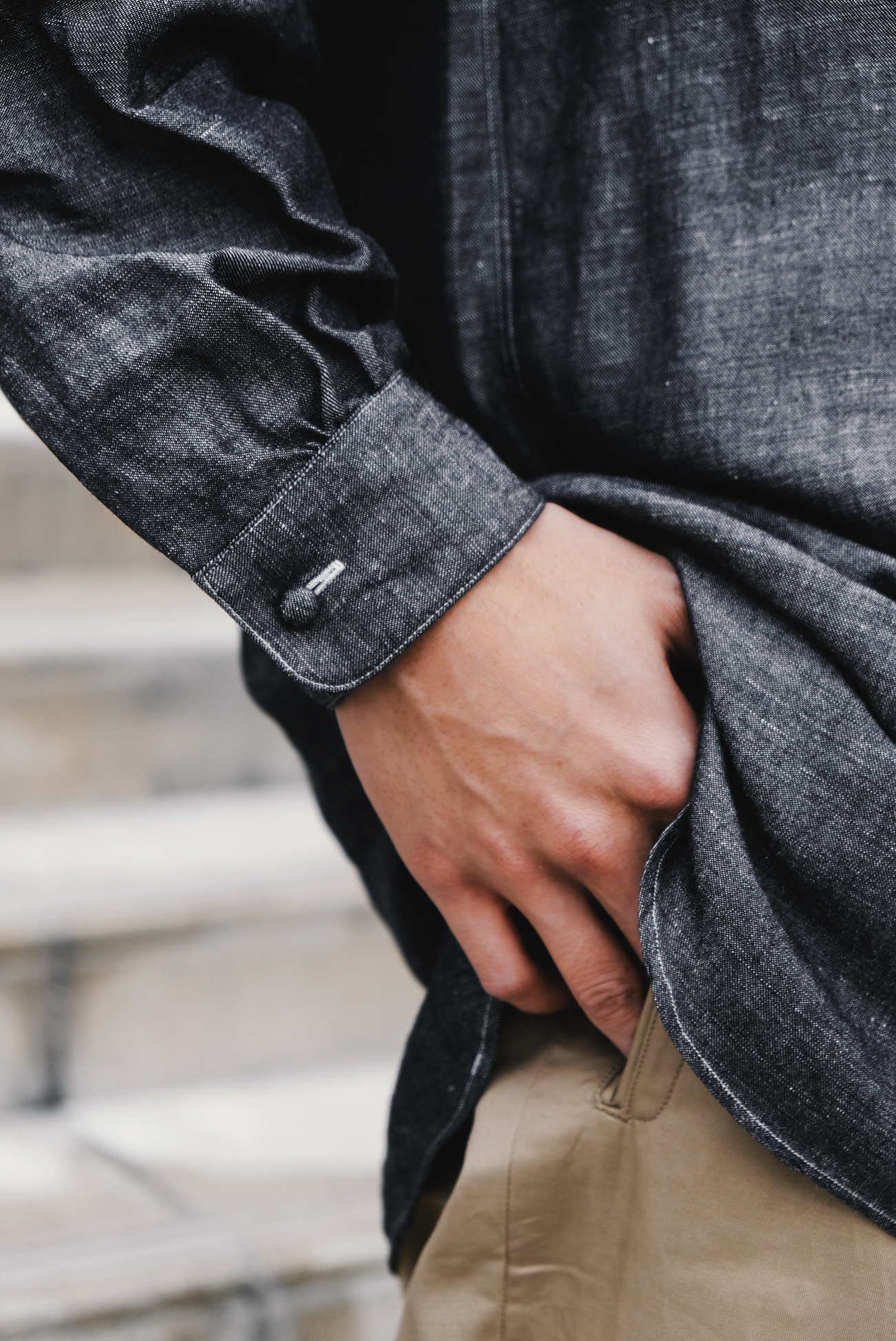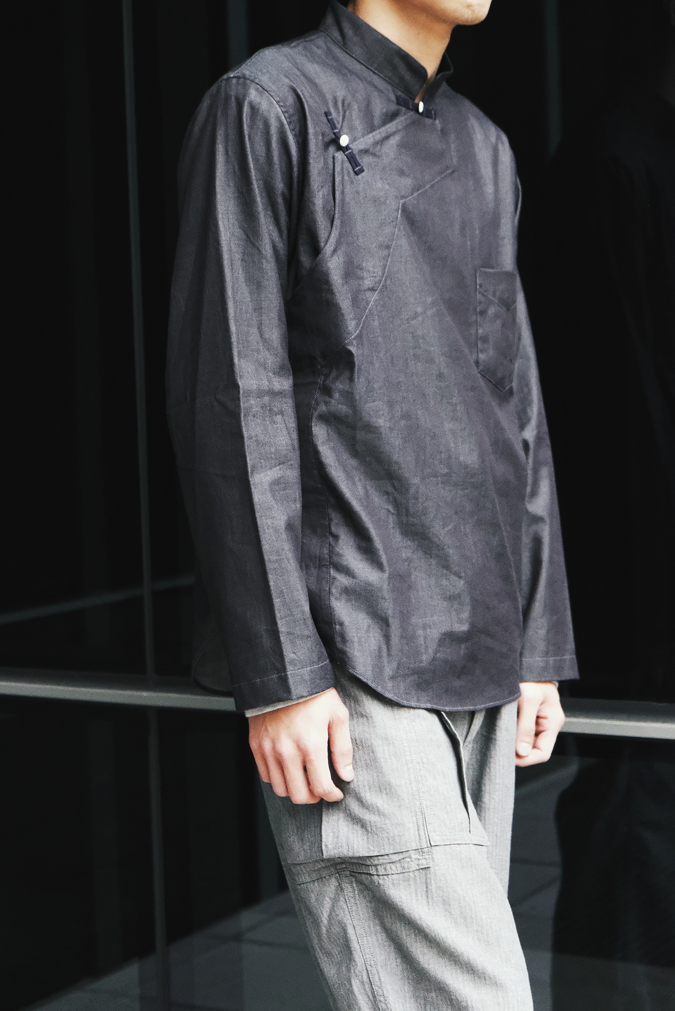 03. - Chrysanthemum Buckle Stand Collar Chinese shirt:這款襯衫採用東方衣著的開襟版型,除了斜扣規格外,還添入了較現代的前口袋設計。面料選用有亮面感的牛津布,也是一種會隨著時間推移擁有不同光澤的布料,讓你從細節凸顯獨特的穿著品味。