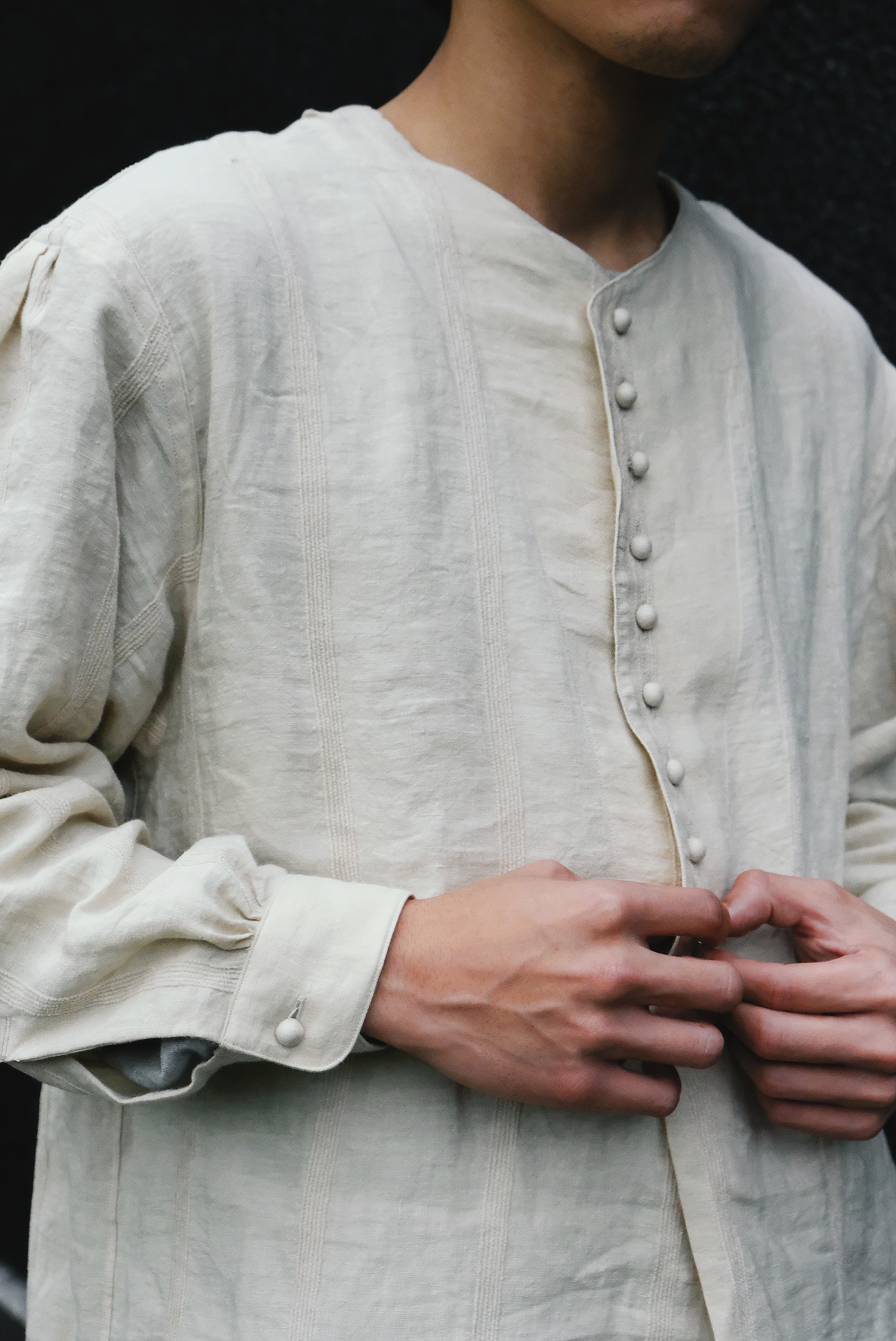 02. Linen Straight Stripes Pullover:承襲品牌遊走於正式與休閒的特性,此件無領襯衫於開襟部分選用成排的核桃扣,營造出略顯愜意的紳士優雅;材質則是高密度的亞麻混人造絲,質地柔軟,又擁有天然透氣性,而微長版的設計,也讓春夏造型更顯層次。