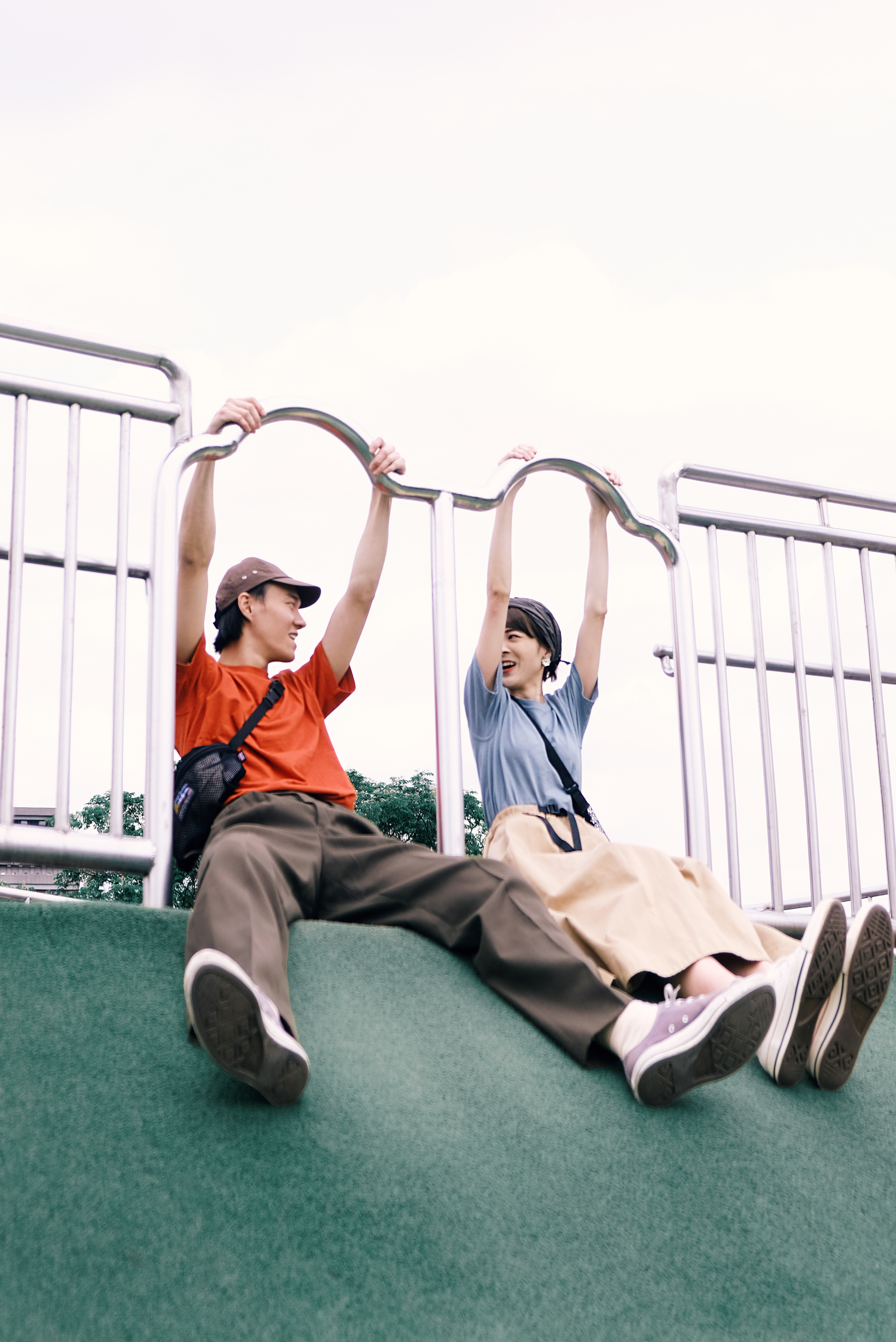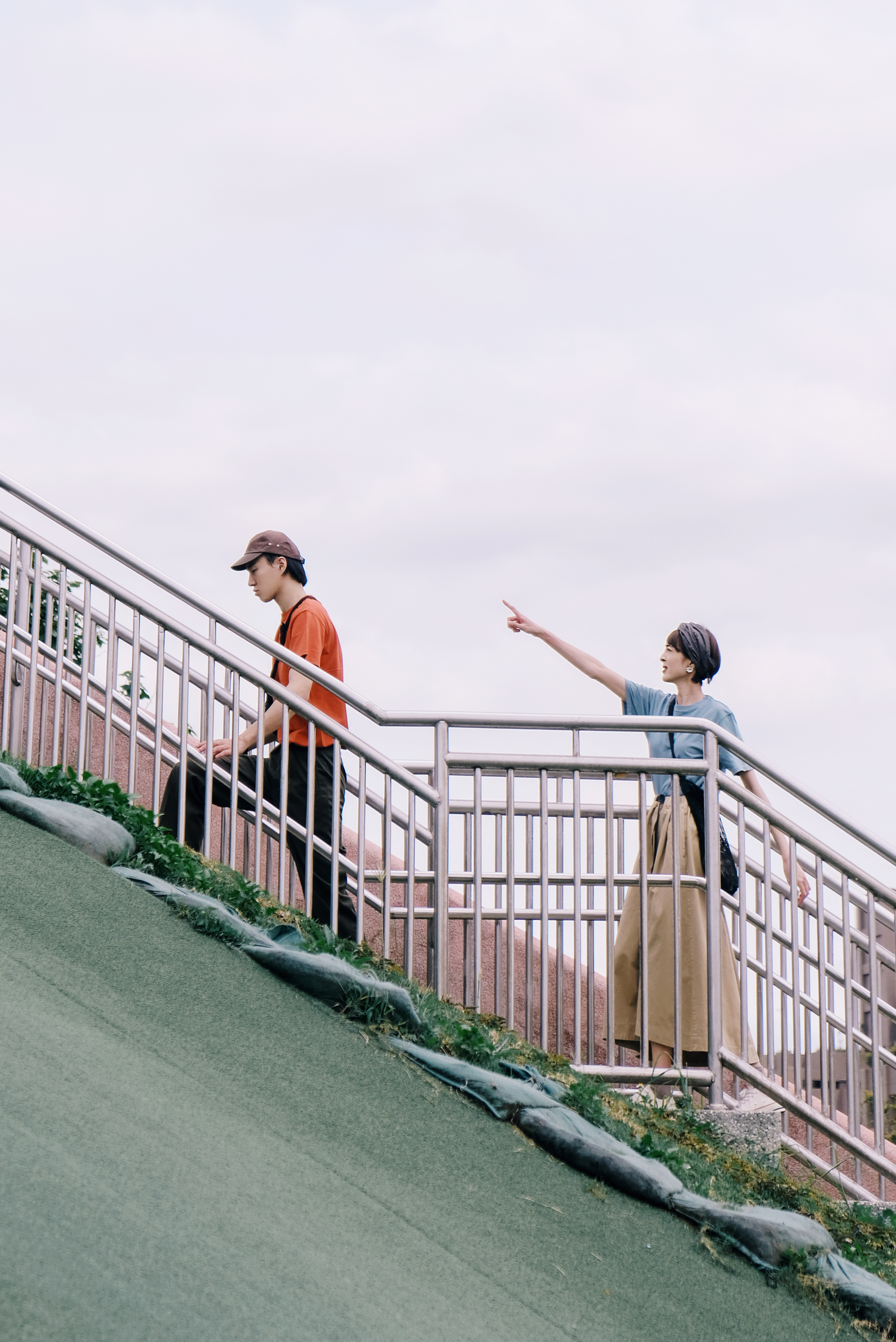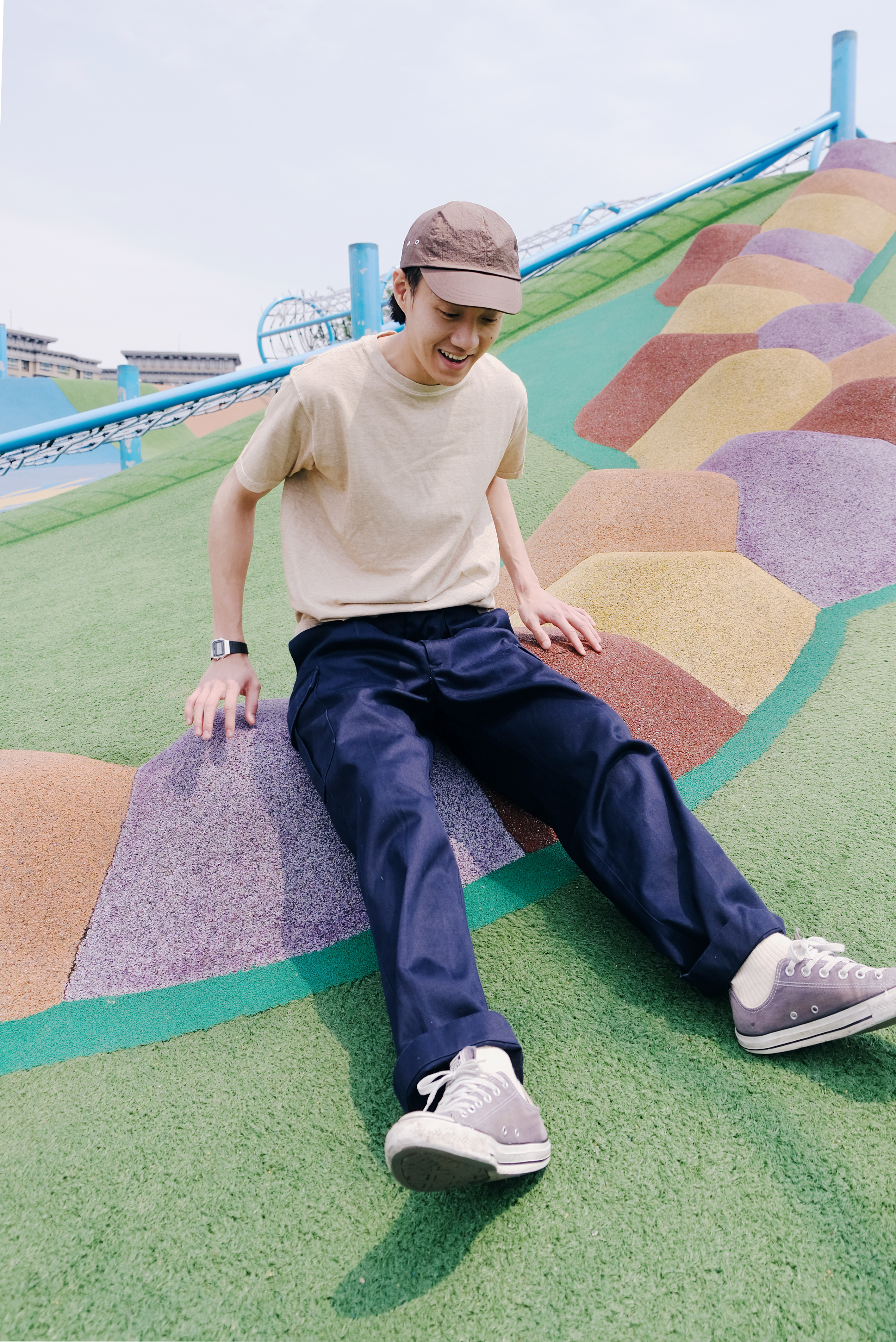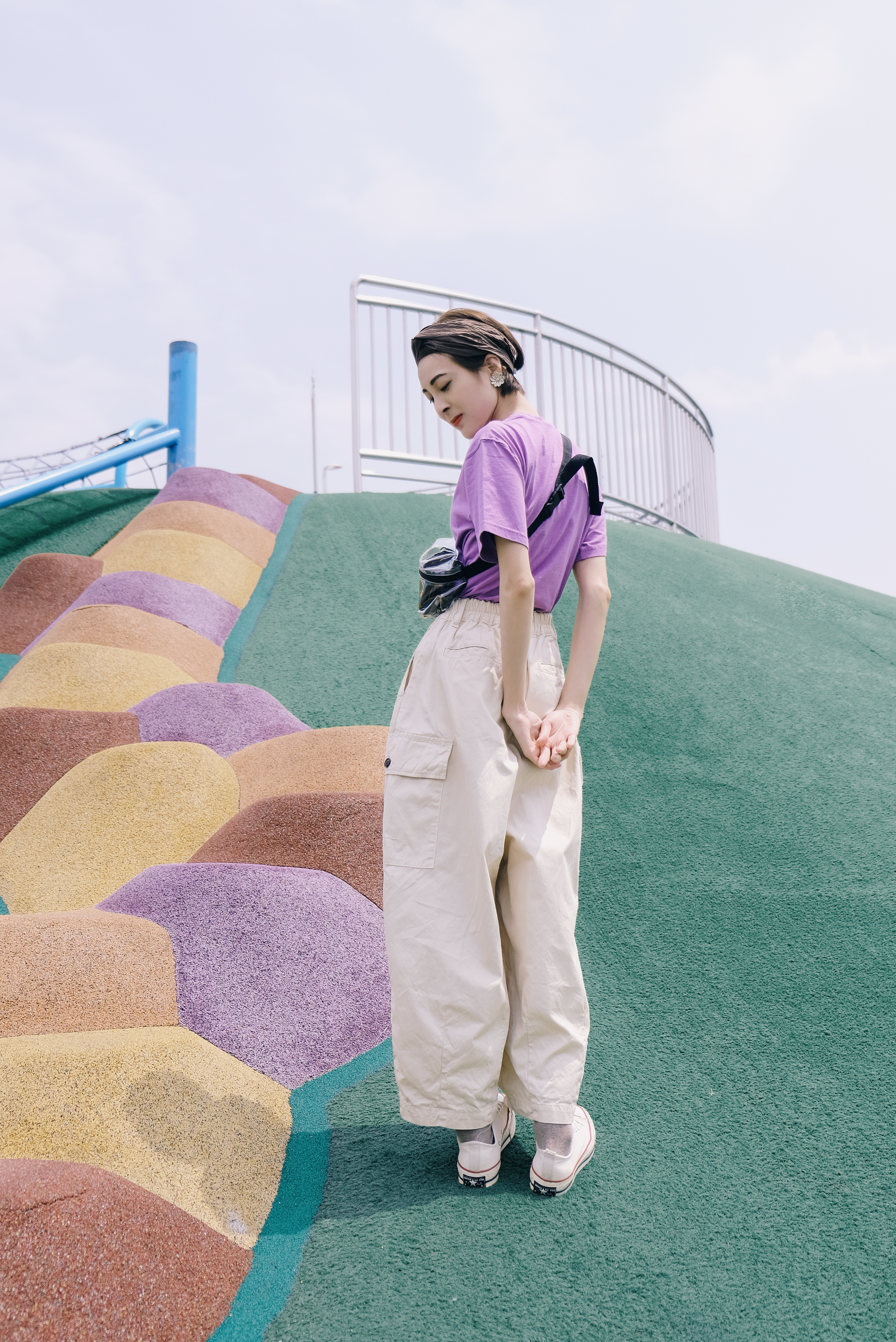 在前往超長的滑梯前,必須要爬上這段綿長的樓梯。爬得時候一邊想著還要多久呢,一邊感受離天空越來越近的興奮感,;在此同時更深深了解──穿搭除了好看,材質果然很重要!