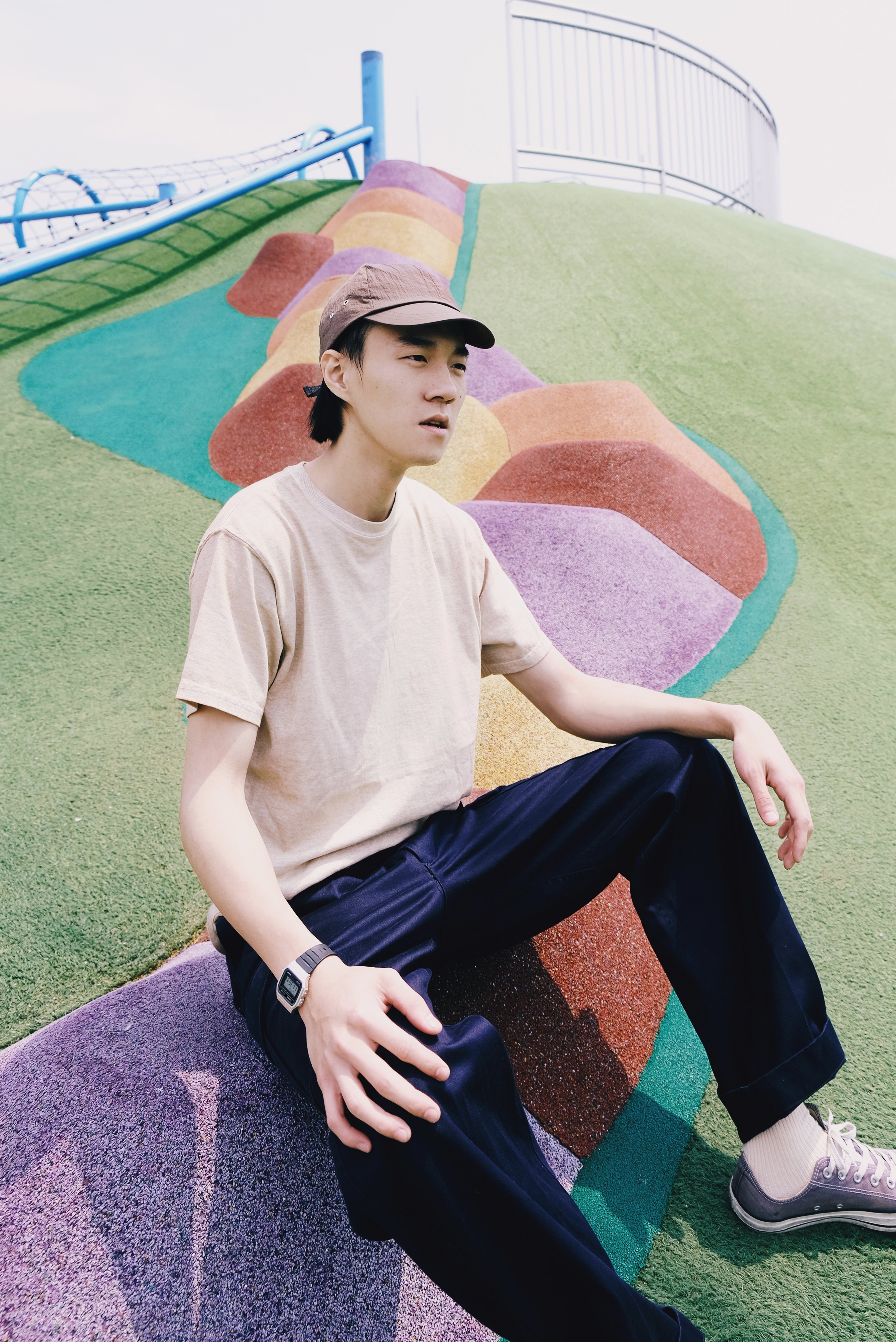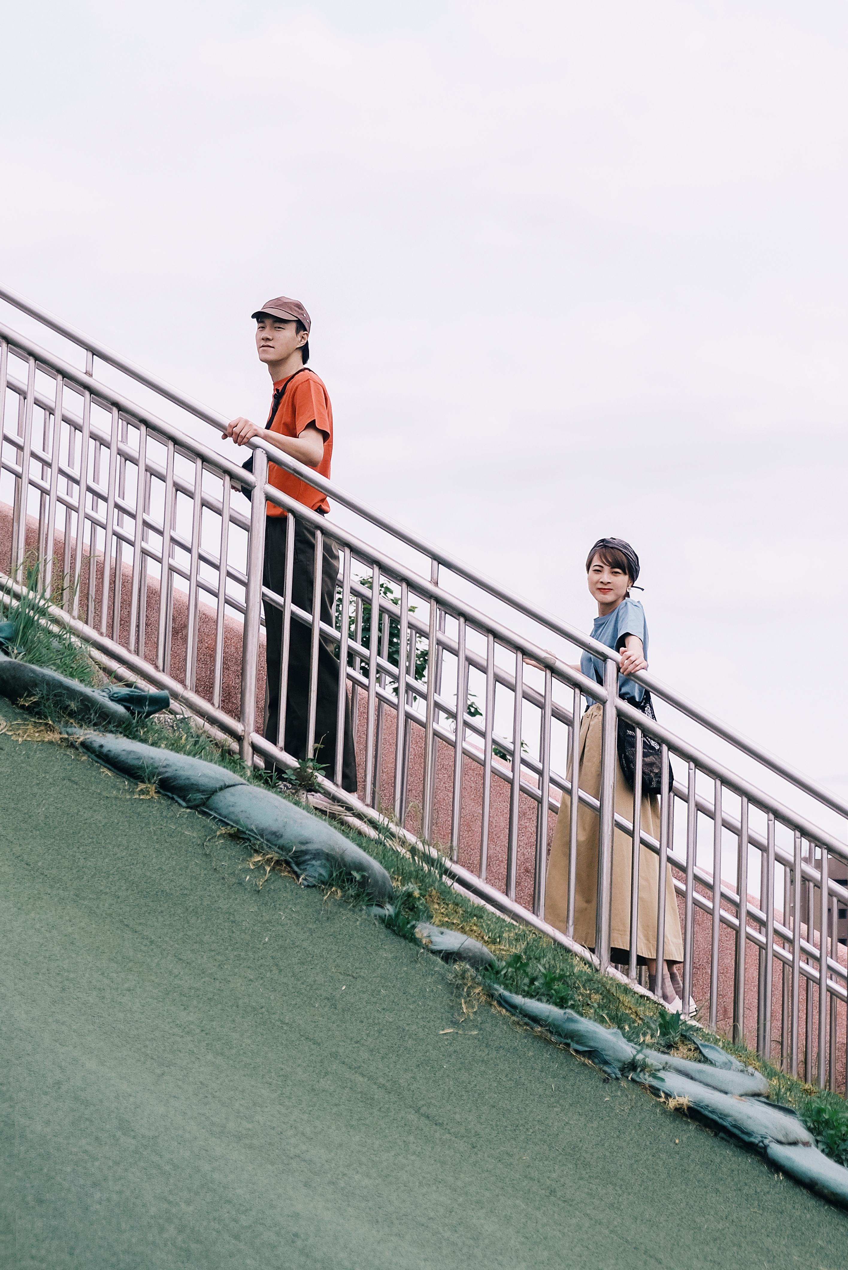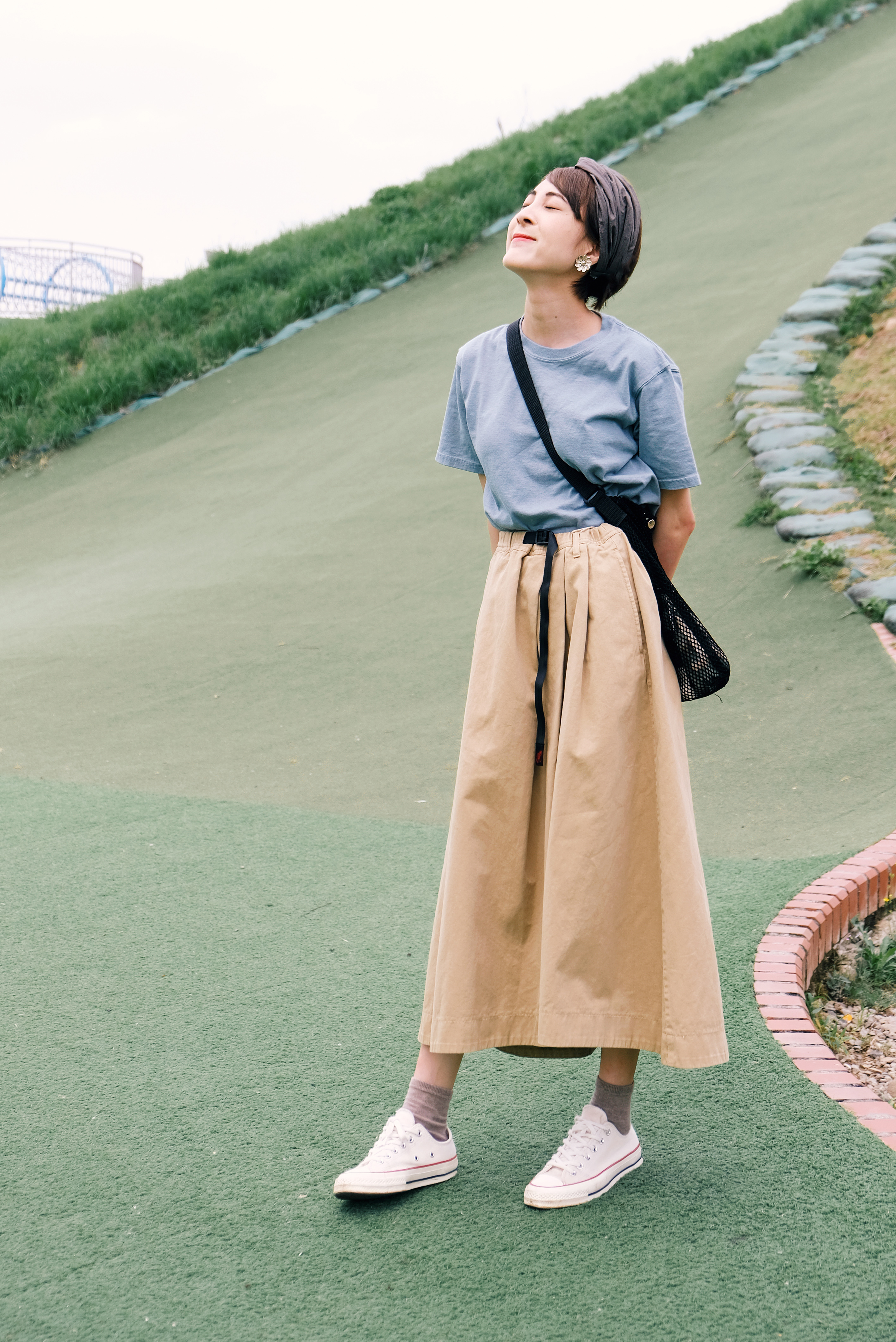 在前往超長的滑梯前,必須要爬上這段綿長的樓梯。爬得時候一邊想著還要多久呢,一邊感受離天空越來越近的興奮感,;在此同時更深深了解──穿搭除了好看,材質果然很重要!