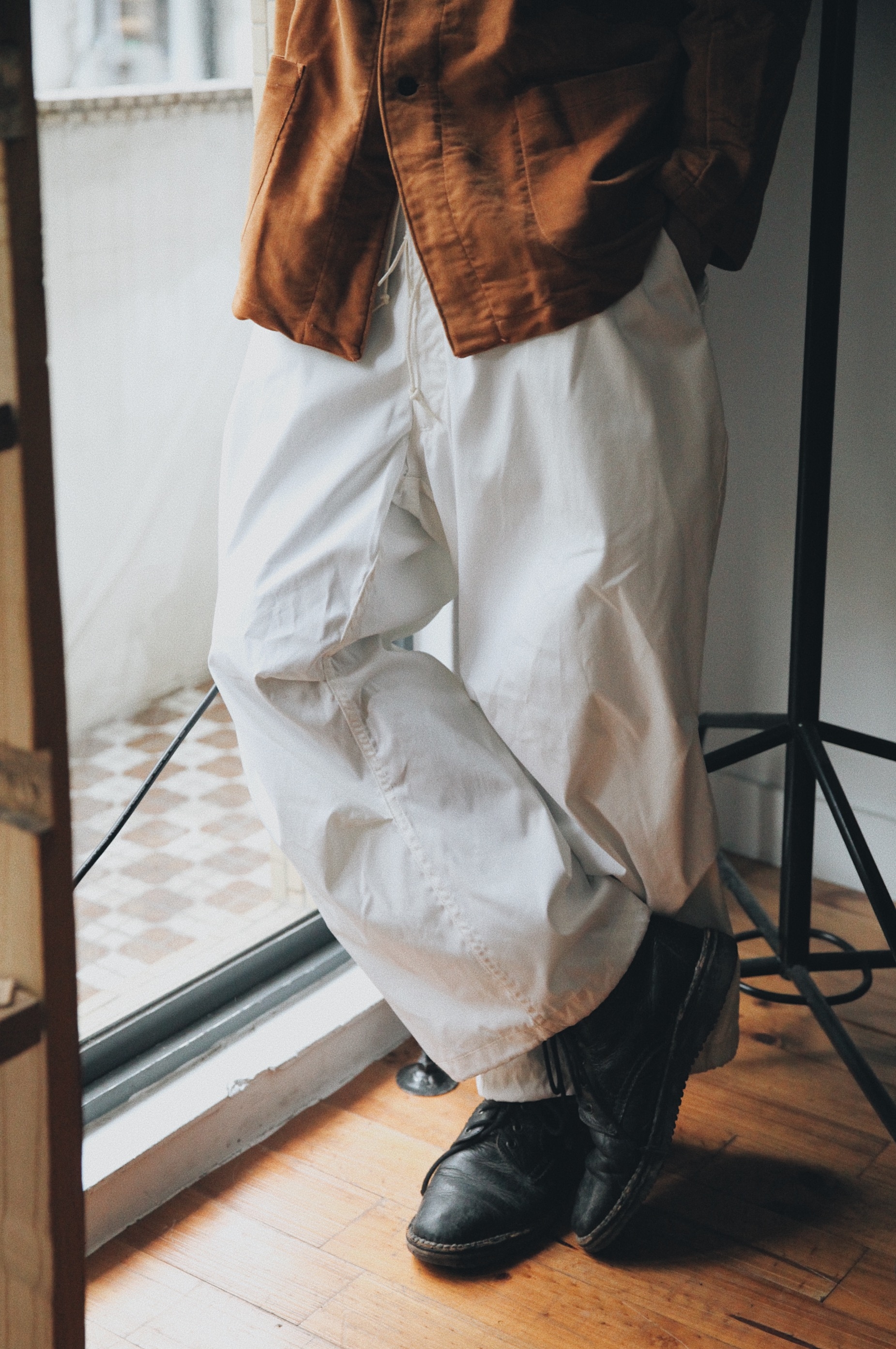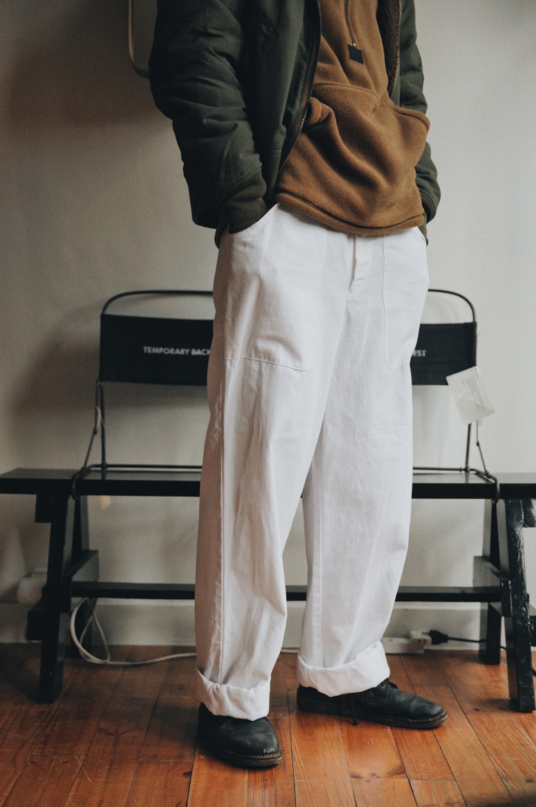 這款庫存新品的美軍公發雪褲,原本是軍人在雪中的外罩褲,除了以雪白色作為保護色外,更有防風防水的機能。膝蓋兩側的打摺設計點綴出立體感,我們更特別加上可以自行調整的腰部鬆緊帶,並在原口袋開縫處縫上了口袋,讓原本僅作為外罩的褲款可以直接著用。