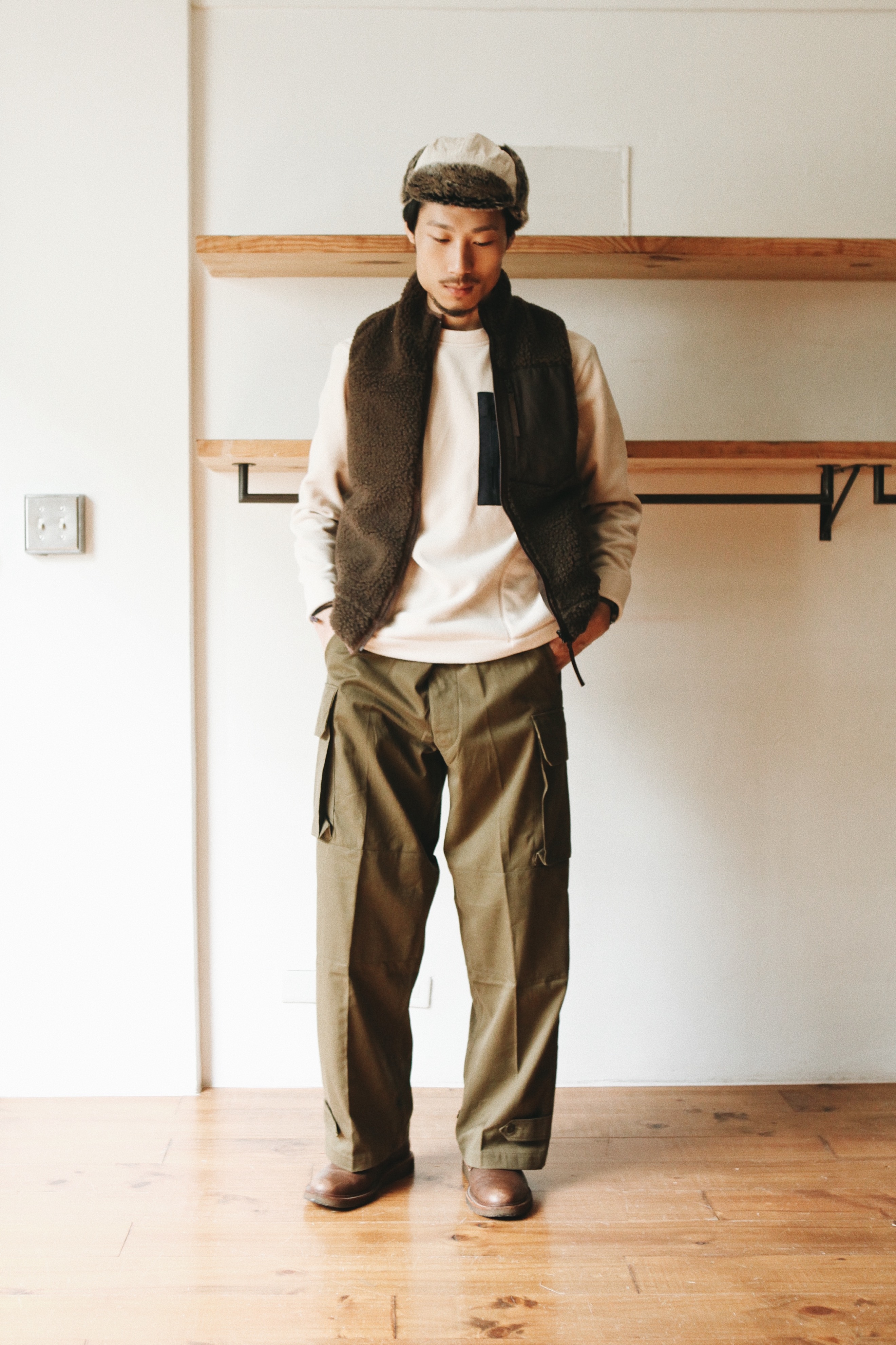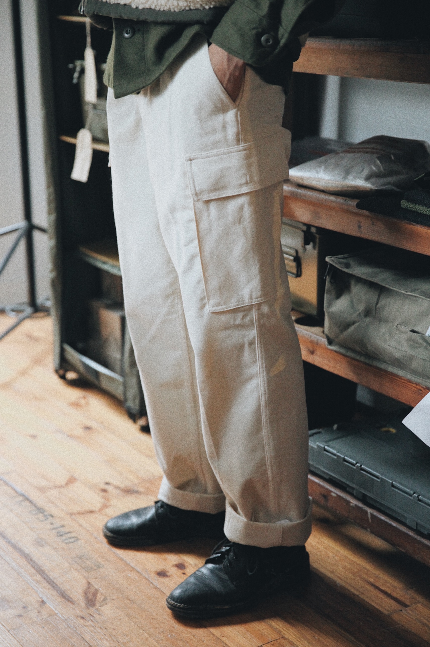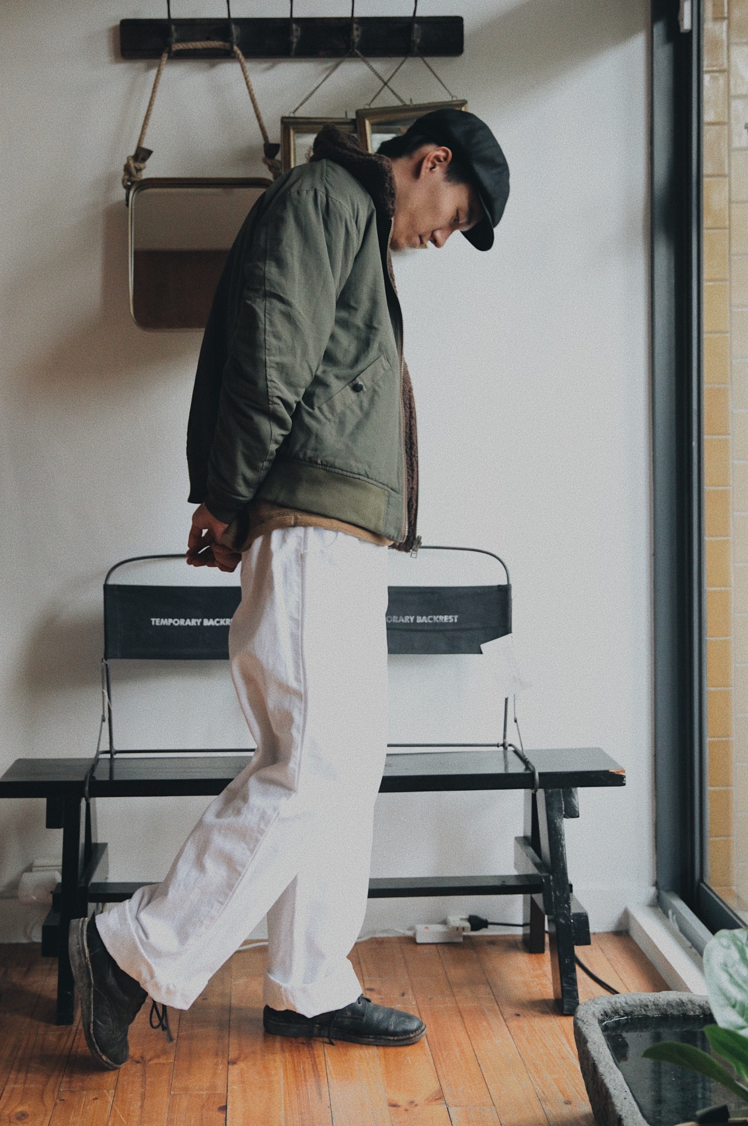 如果鍾愛俐落的褲款,也務必試試同樣是難能可貴的庫存新品──德軍米白色長褲。採用厚實、保暖的moleskin面料,筆直硬挺的版型更能聚焦在結實的輪廓上,形塑經典雅緻的氣息,兩側的大口袋也透露著細膩的巧思,讓整體穿搭躍上更有氣勢的層次。