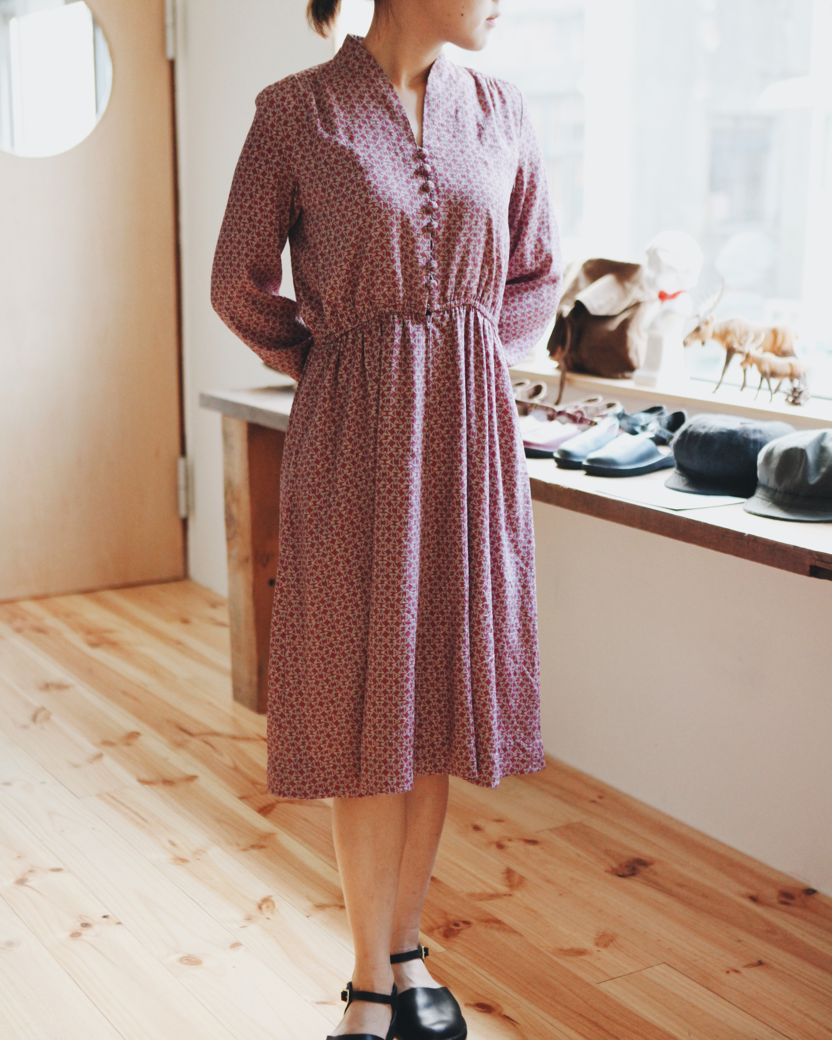 除了不計成本的用料與作工,Vintage洋裝在悠遠的時間輪迴中,四處散落,經過不同時代店家的蒐集,每款洋裝幾乎都是獨一無二的(幾年下來只有一兩件曾看過雷同的)。每次店內新上架洋裝,自己最習慣的儀式便是從衣桿的這端一件件翻閱Vintage洋裝到彼端,仔細端詳每款的樣式與剪裁。每件洋裝自成一格,領口有尖領、圓領、方領、披巾領(shawl collar)或繫成蝴蝶結等等的樣式;前襟有的垂直或橫向打摺;下擺呈現傘狀、百摺、垂直、或大A裙襬;花紋又分素色、圓點、碎花、幾何、蕾絲等等,這些元素彼此組合相乘,呈現出成千上百種變化,在浩瀚的Vintage汪洋中,想找到一模一樣的雙胞胎實在不容易。