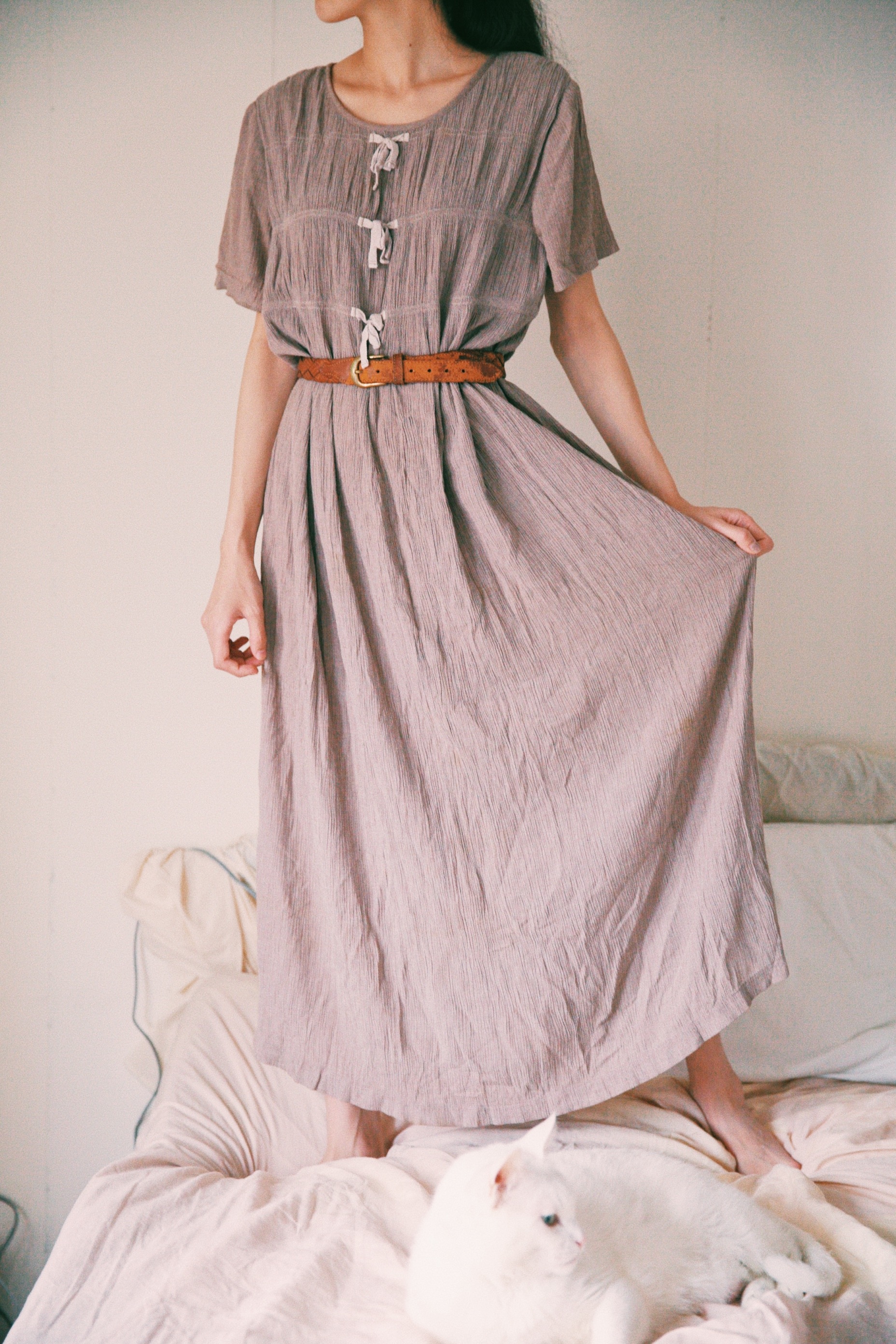 整理新蒐集到的古著總是像打開藏寶箱那樣有趣,永遠無法預測雙手拎起的下一件會是什麼樣式。這批異材質古著洋裝,更是驚喜中的驚喜,觸感不同於棉質,手感更加乾燥,質地輕薄,充滿彈性的抓皺,令人聯想到三宅一生著名的皺褶服裝系列。
