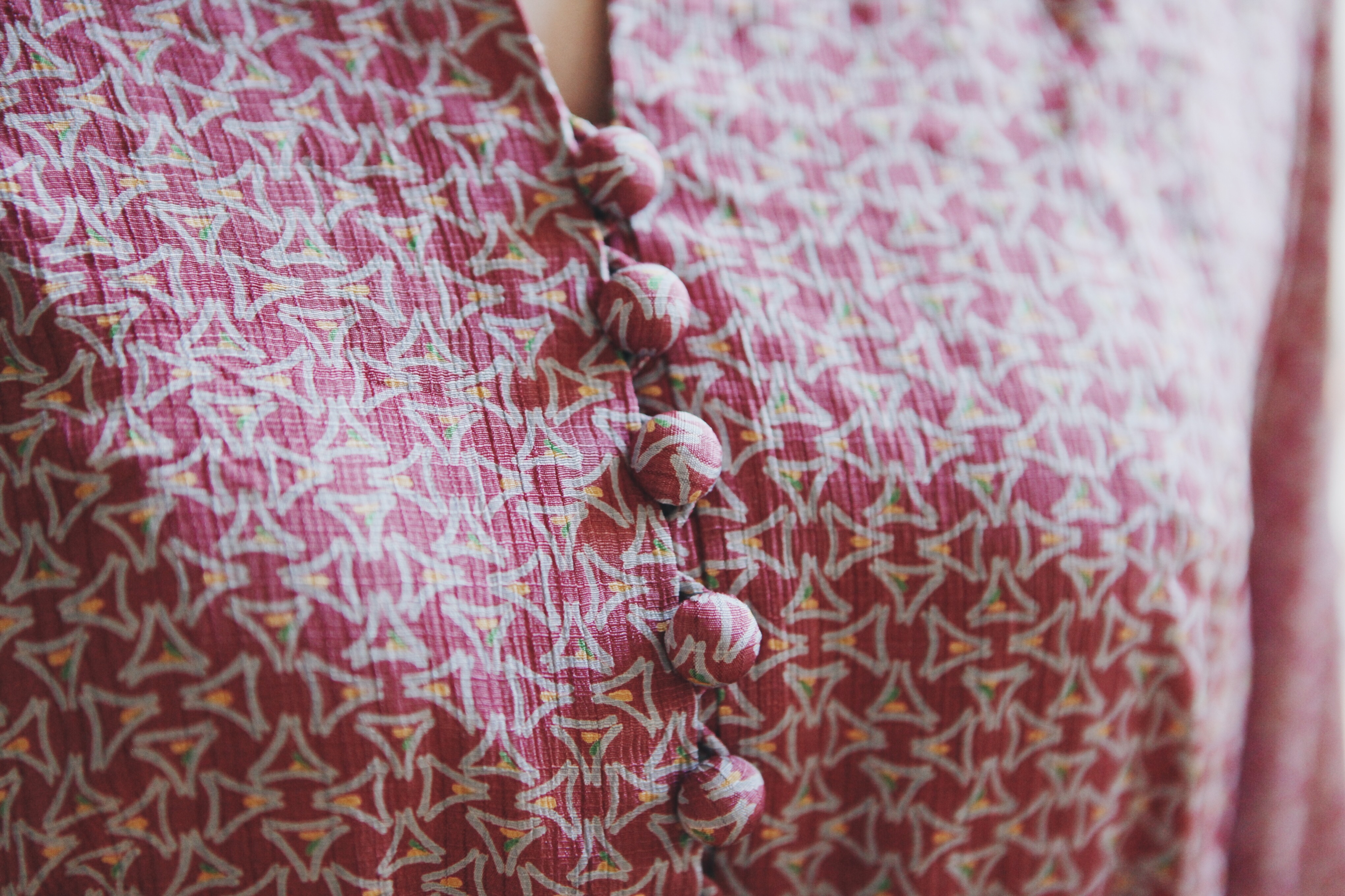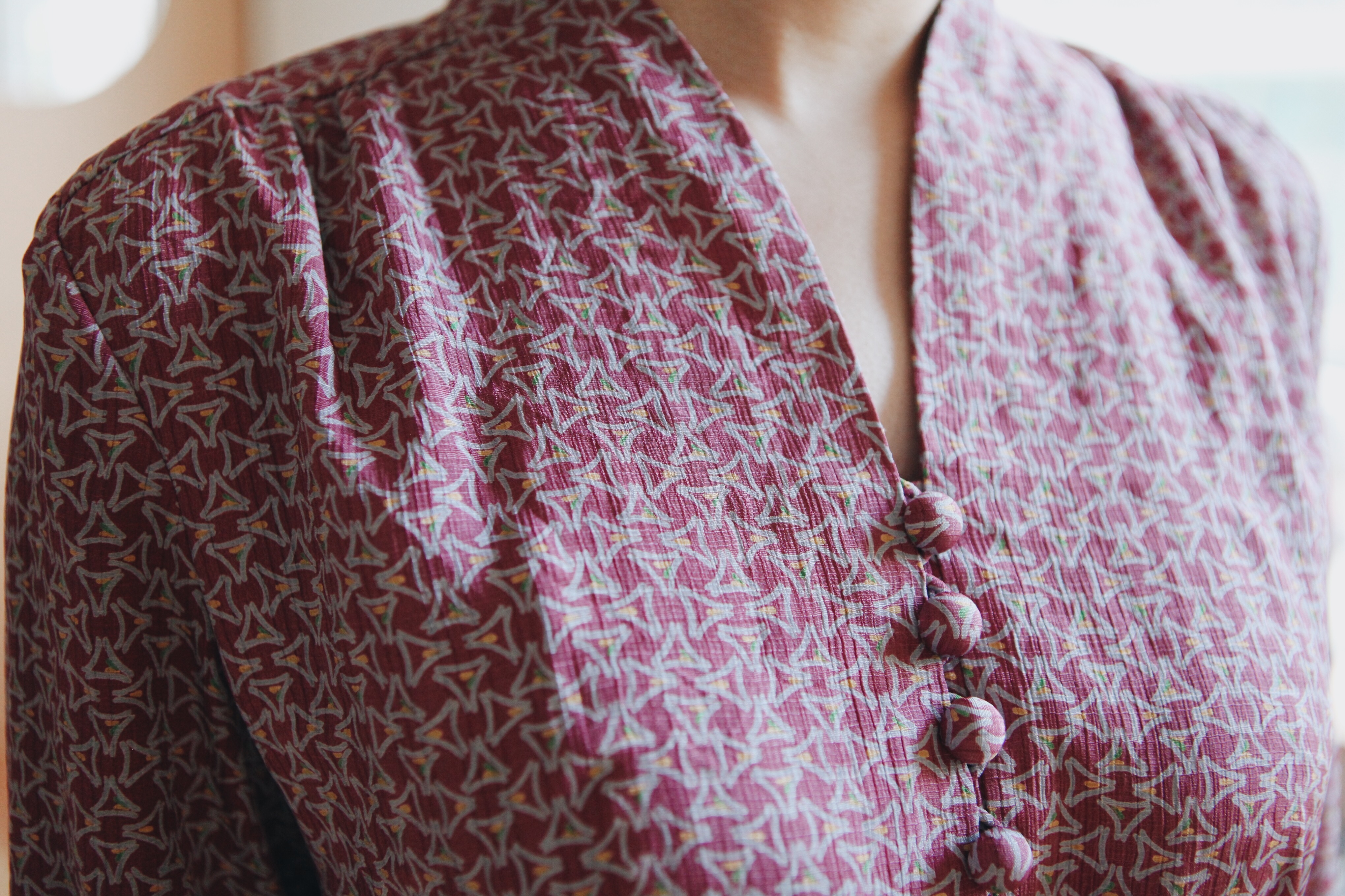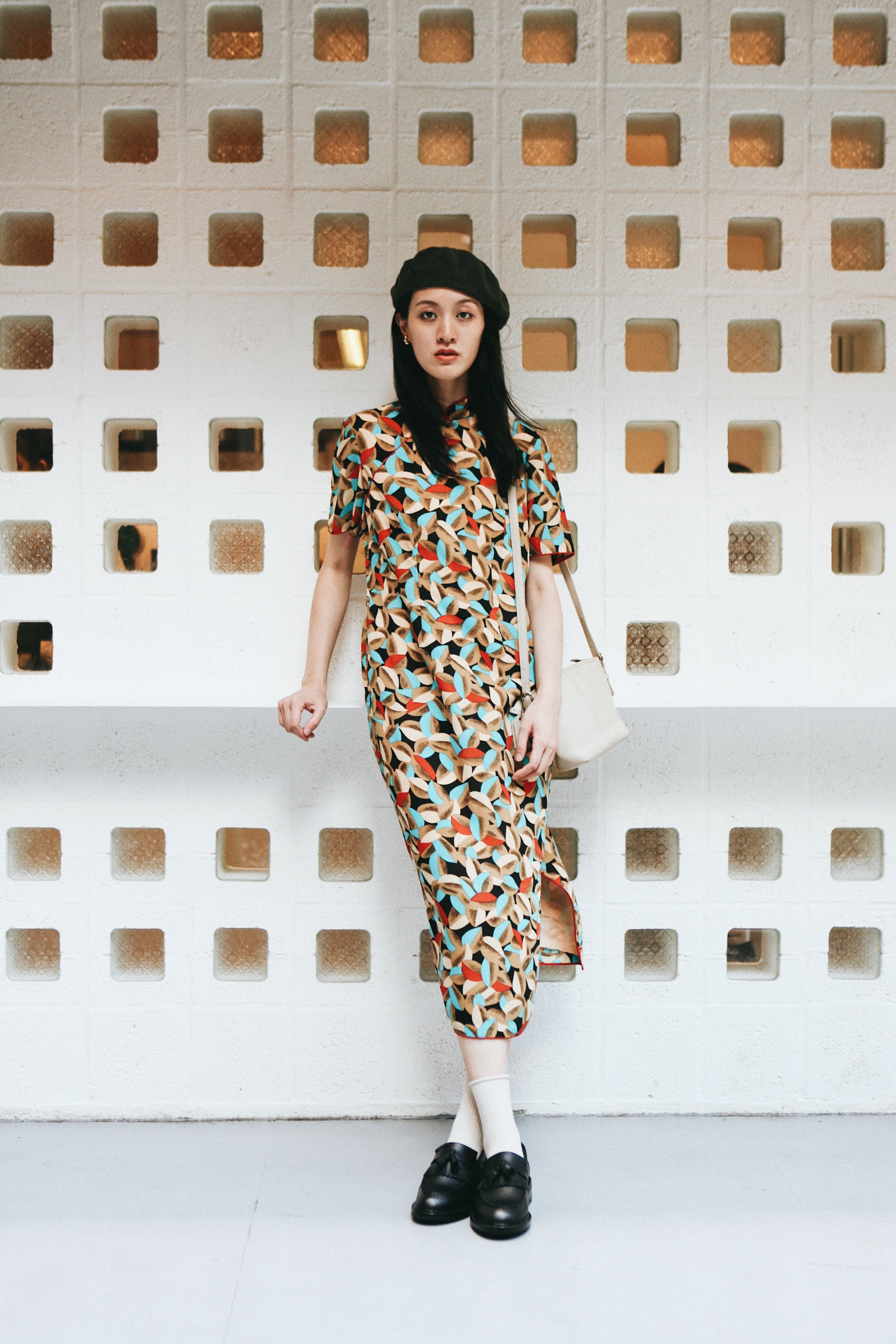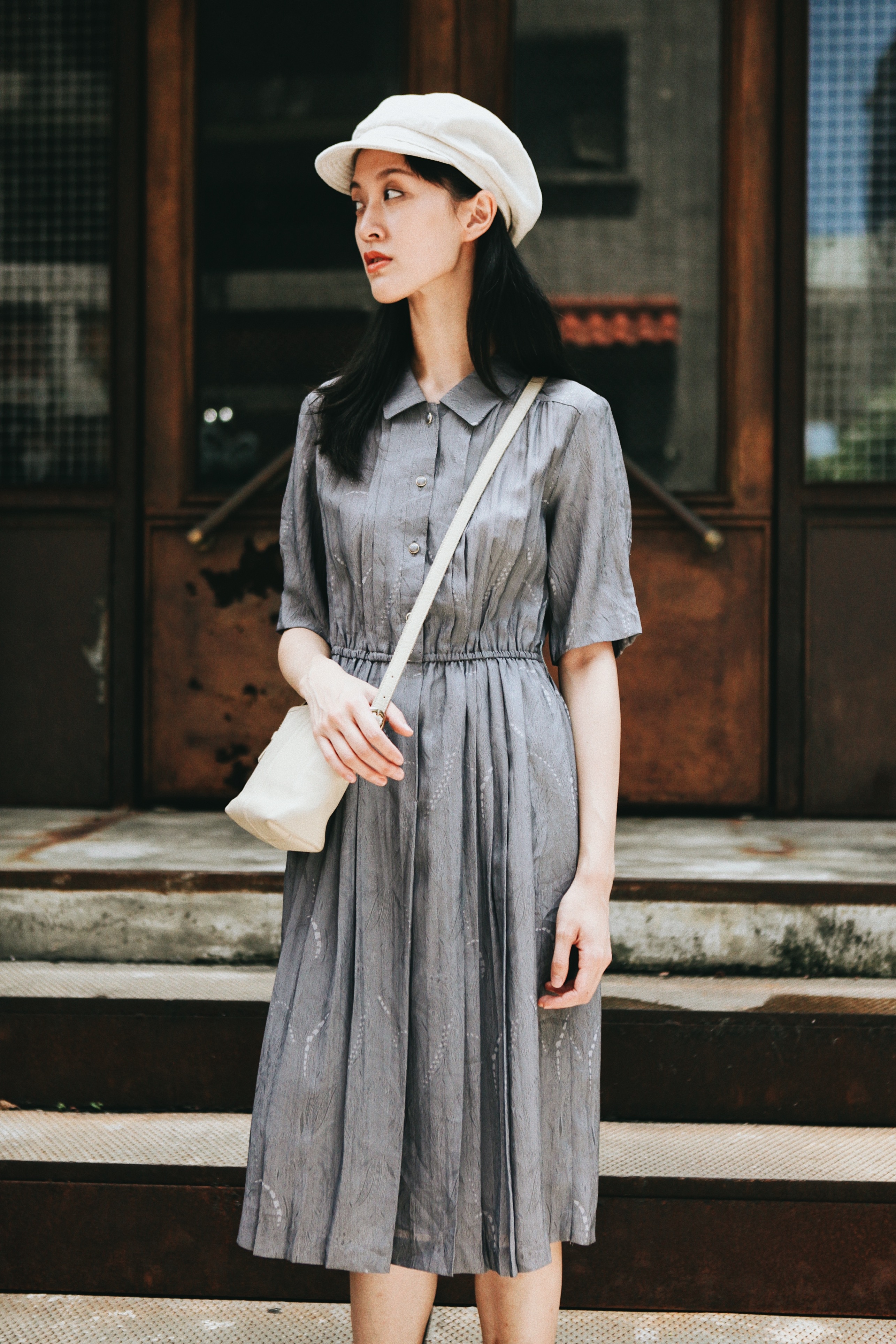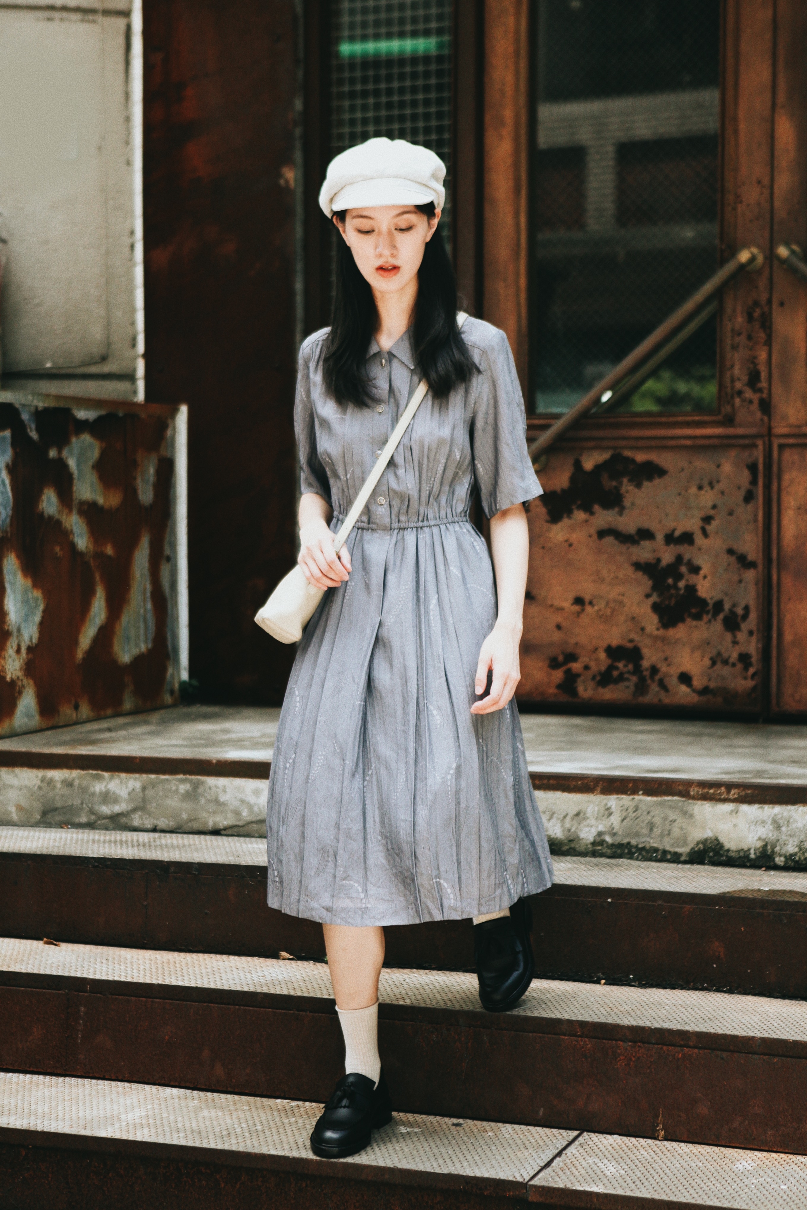 請她分享自己最喜歡的一件古著洋裝,是一件國外買到的洋裝,整件版型是優雅的小立領、與俐落的A型裙擺,前襟由與布料同色的圓釦組成,包袖微微抓澎使肩部顯瘦,洋裝材質是帶有點亮度的緞面質地,滿版的三角紋路使洋裝帶有優雅活潑的女孩風情。