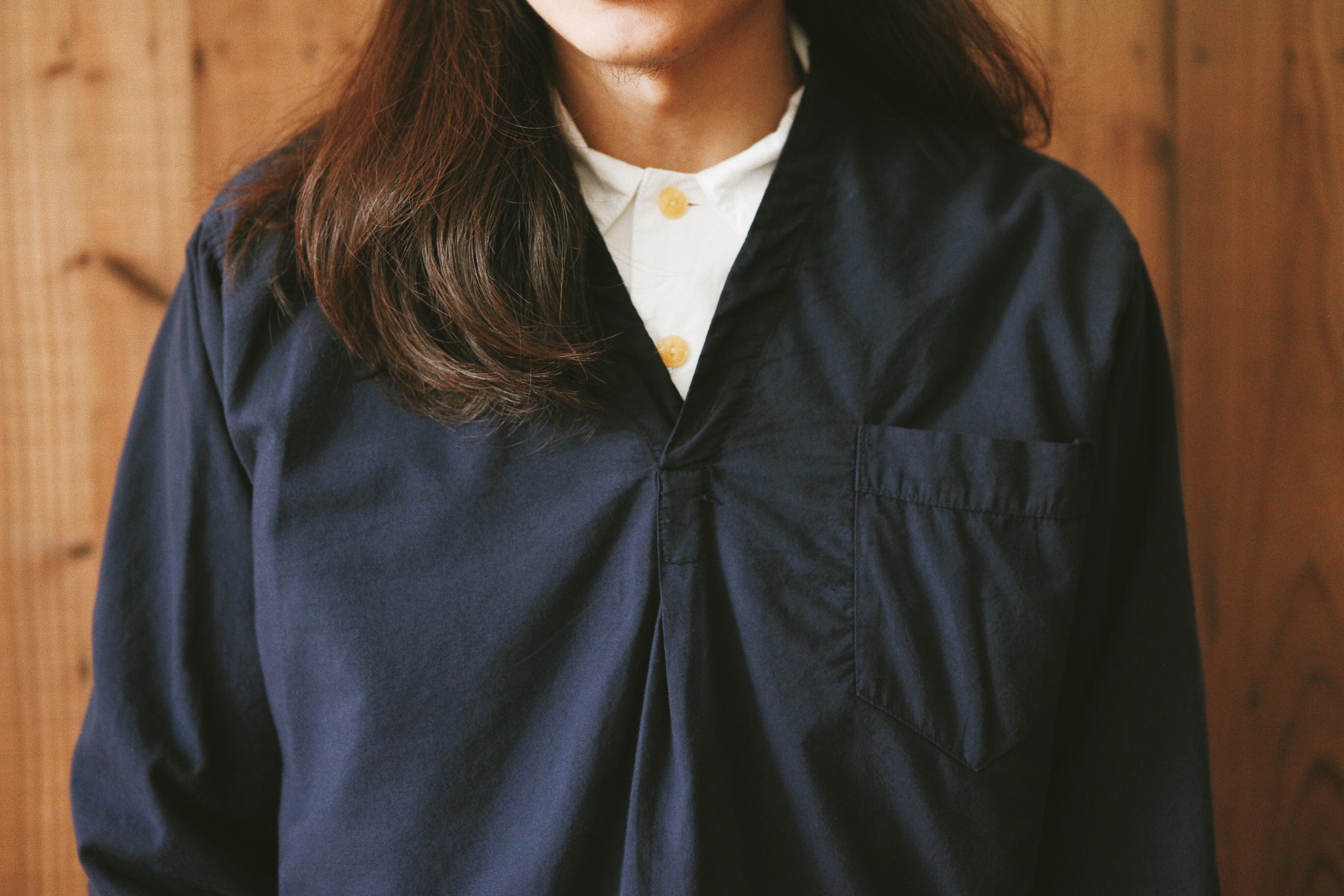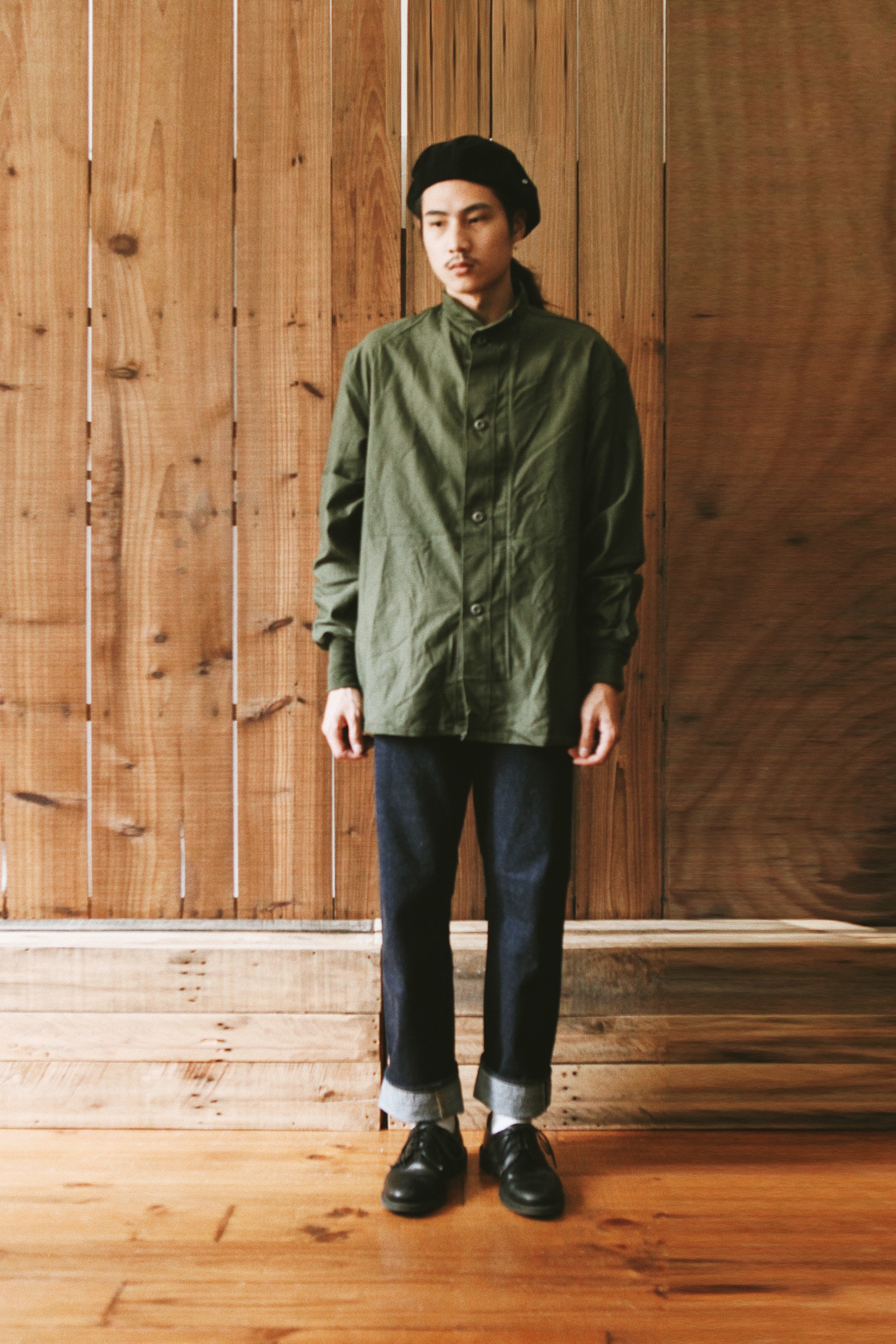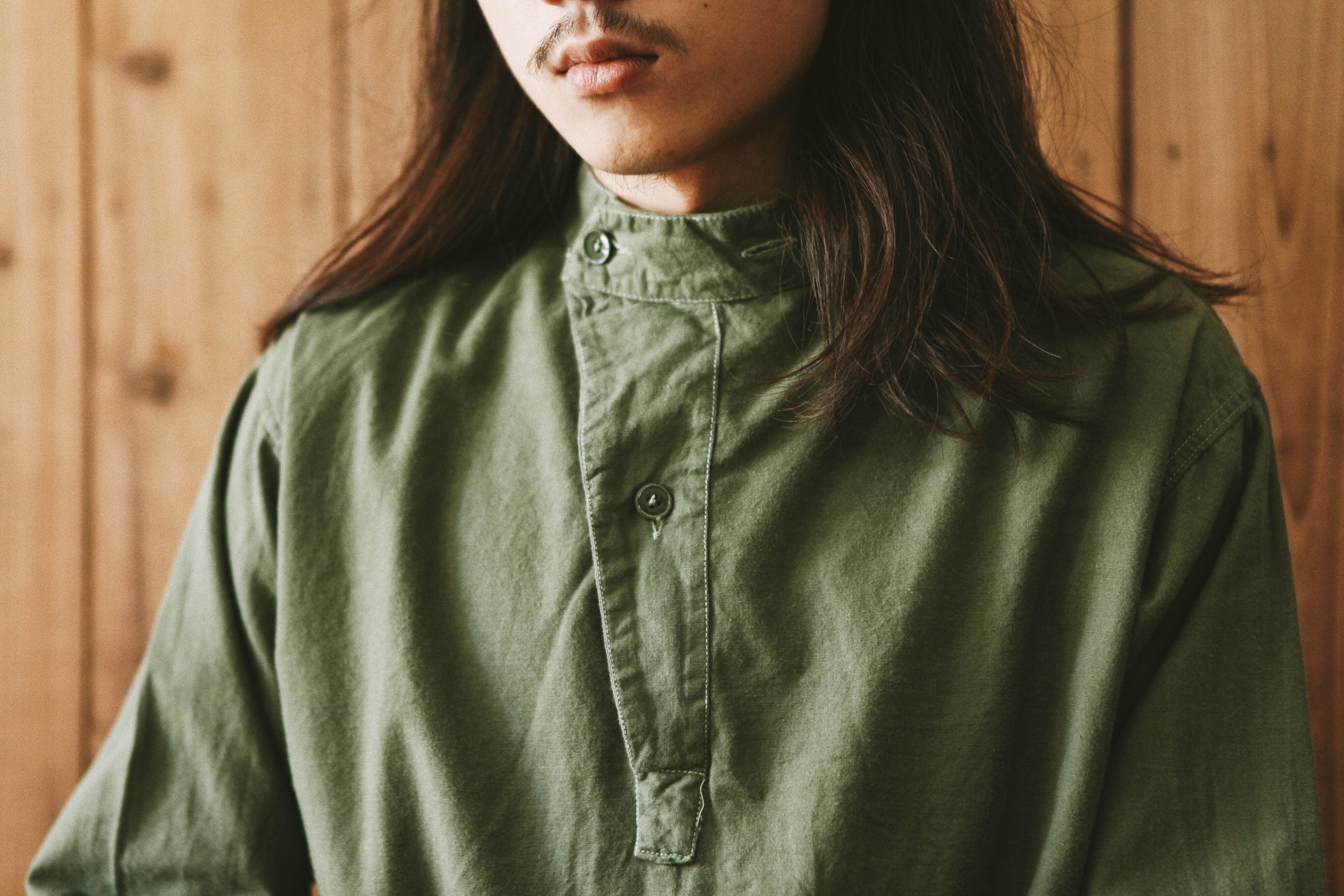 這款無領襯衫為美軍二戰穿著的睡衣,戰後則配給予醫療兵所使用,辦公室冷氣開太強、微涼的春秋季節,輕薄布料正適合帥氣的披上禦寒,冬季則內搭在大衣中呈現層次,氣質設計在粗獷的美軍軍品中相對特別,經染製成深藍色、棕色後,更必須將它納入衣櫃。