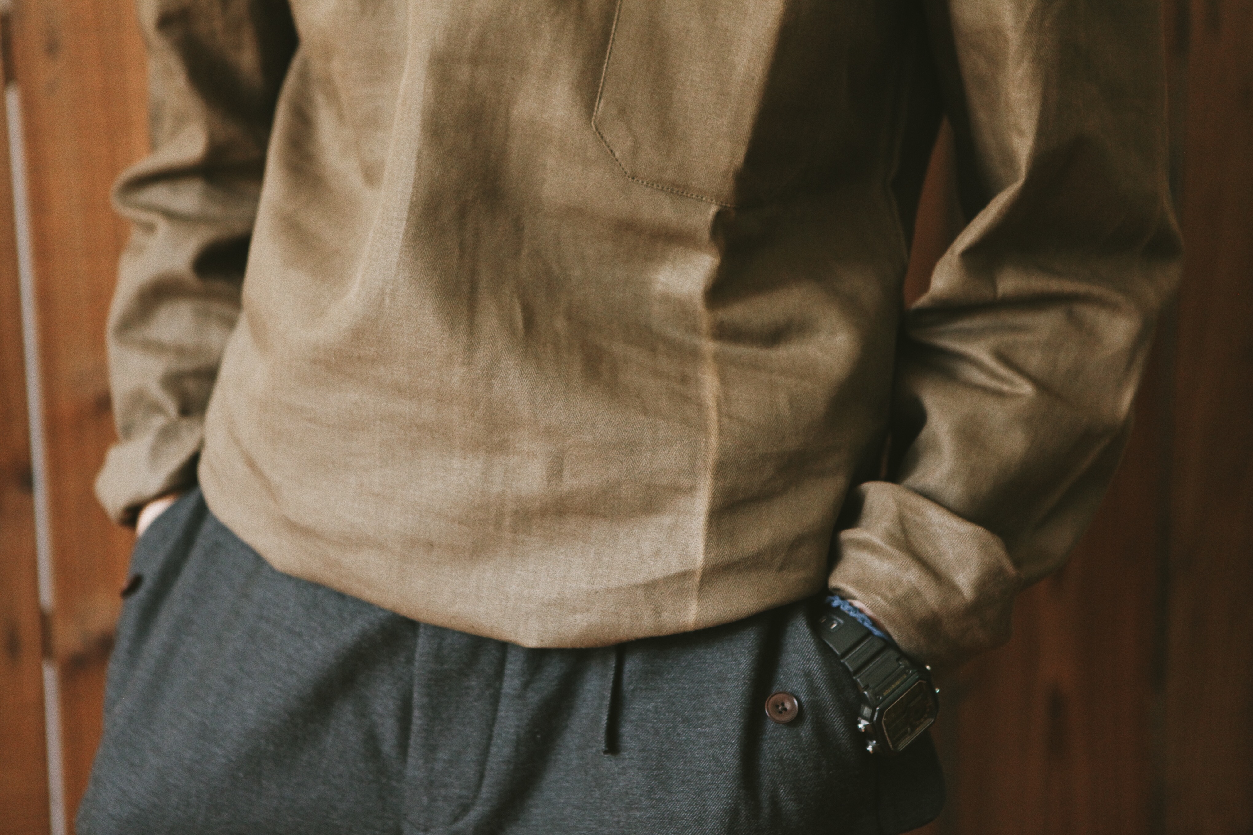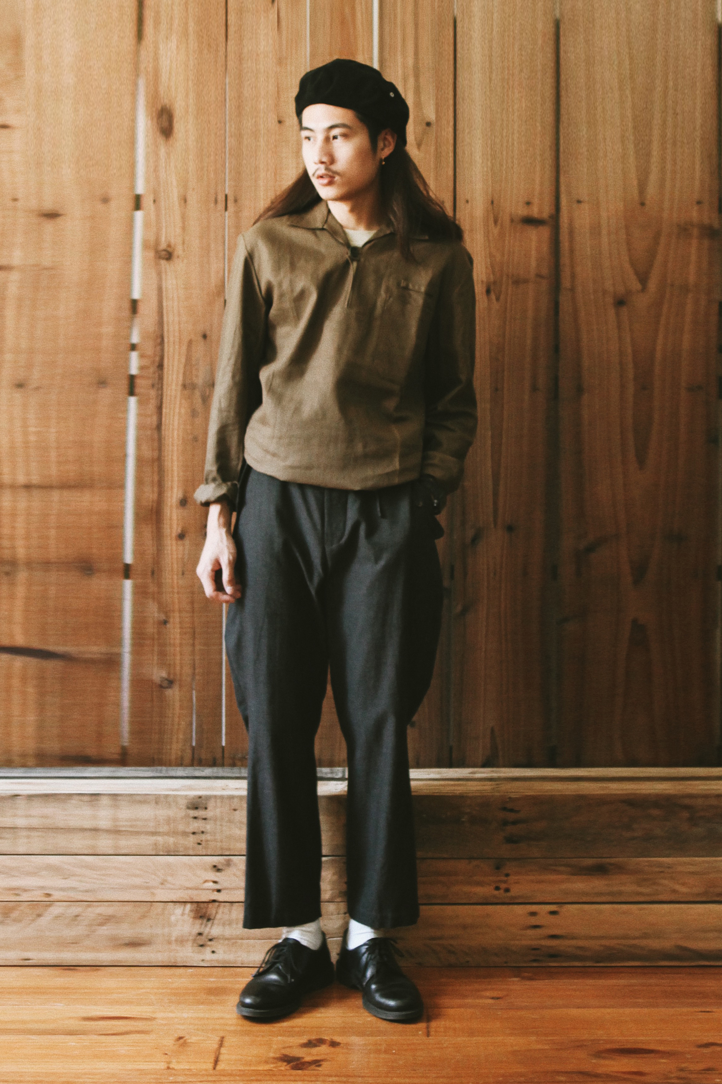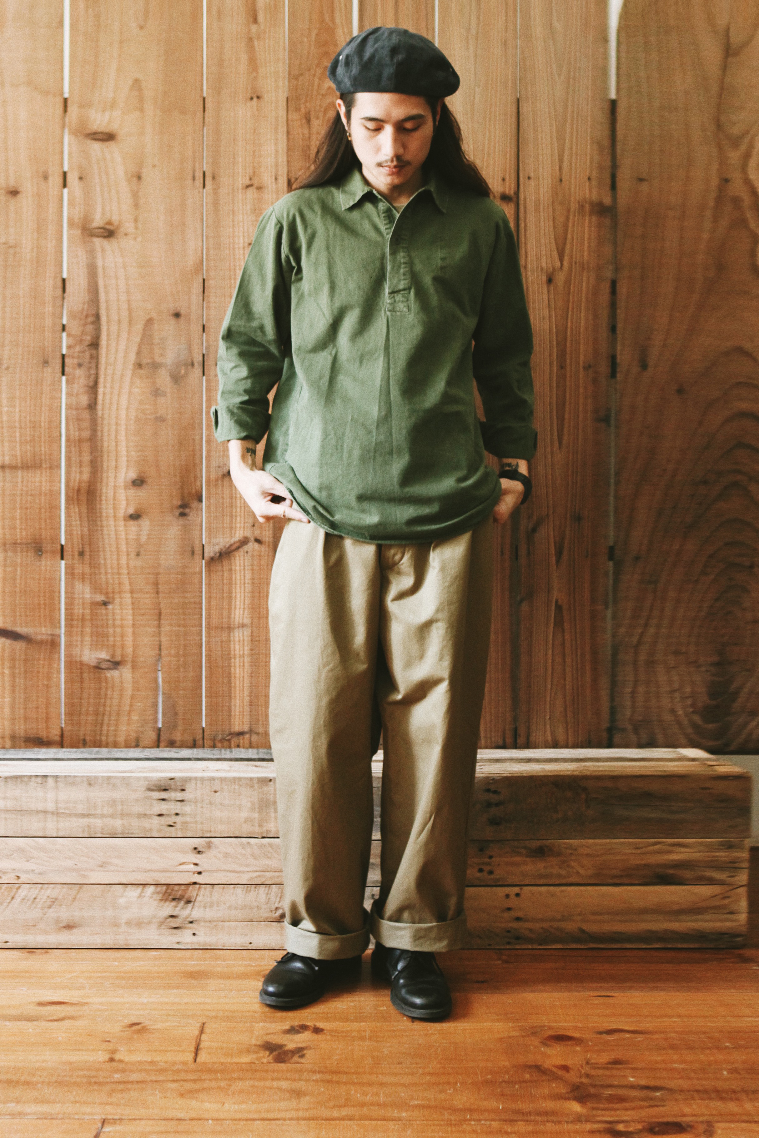 捷克軍用套頭上衣,布料具有相當挺度、胸前具單邊口袋,輕薄HBT布料適合春、秋換季穿著。寬身版型,袖口縮口設計防止寒風灌入,它不像瑞典pullover那樣休閒,帶點工裝的粗獷感,方便耐穿的設計,一週能穿上好幾回。