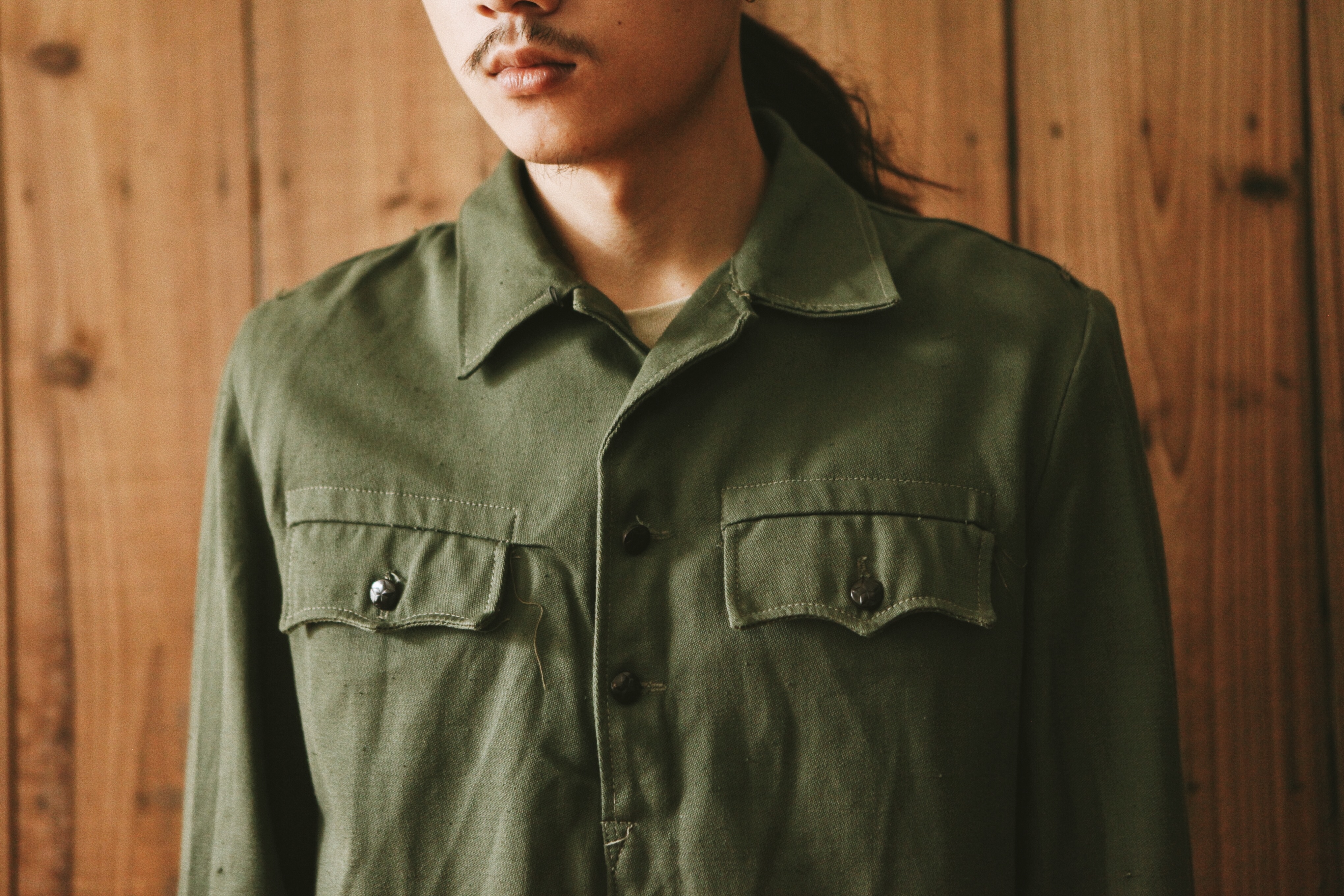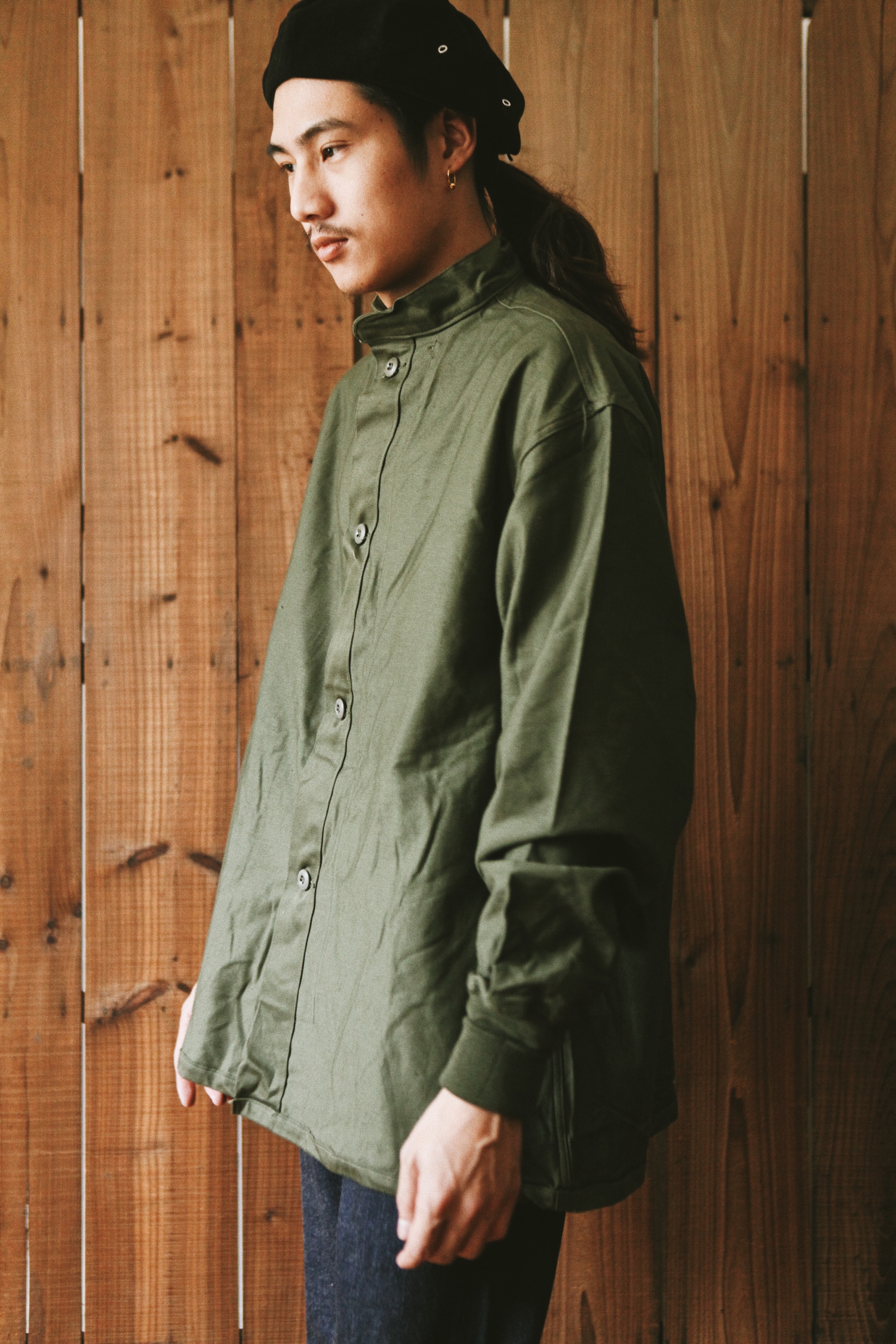 這款70年代的美軍化學兵防護襯衫,雖然由化學兵使用,但是材質是一點都不化學單純的棉質,蒐集到的版型稍微偏大寬身,正面為附扣的立領,扣子解開裡面還有一層防風,袖口為有彈性的螺紋縮口,是一款實用簡單的軍用襯衫。