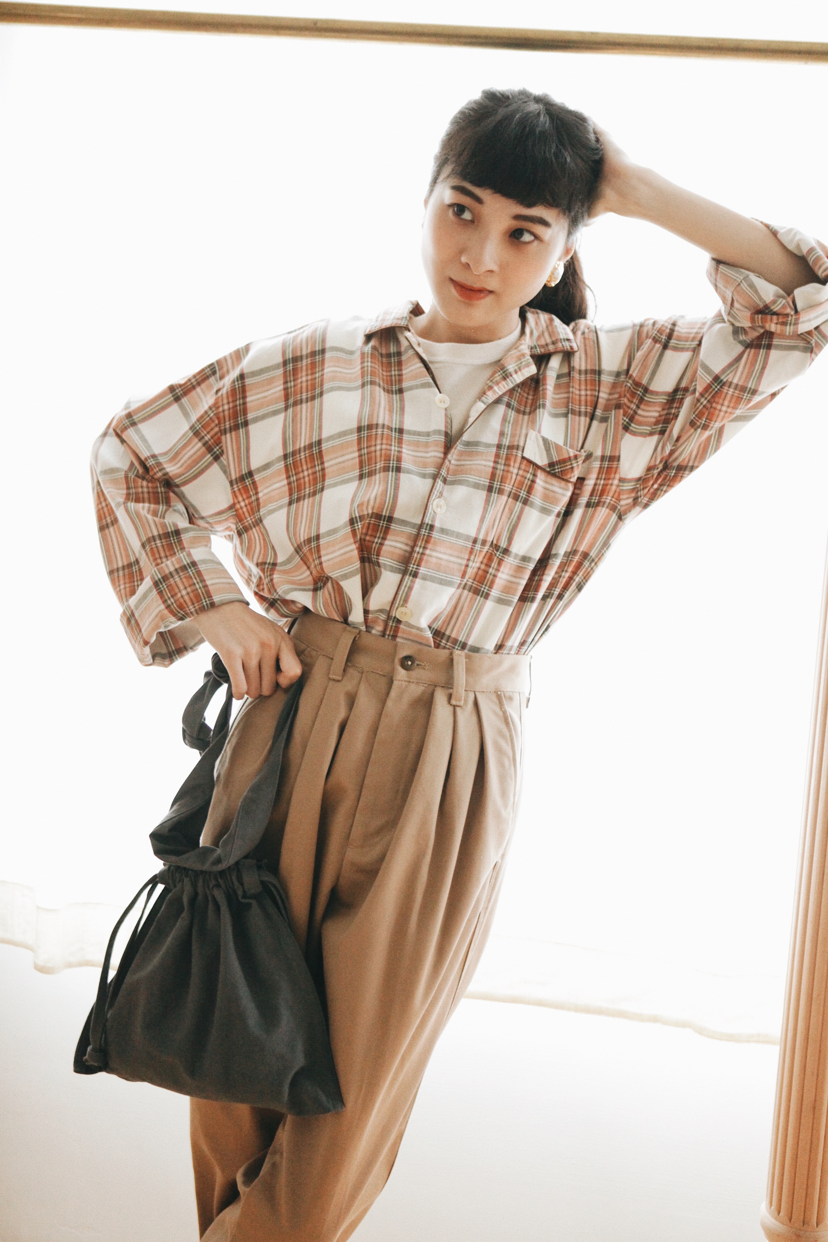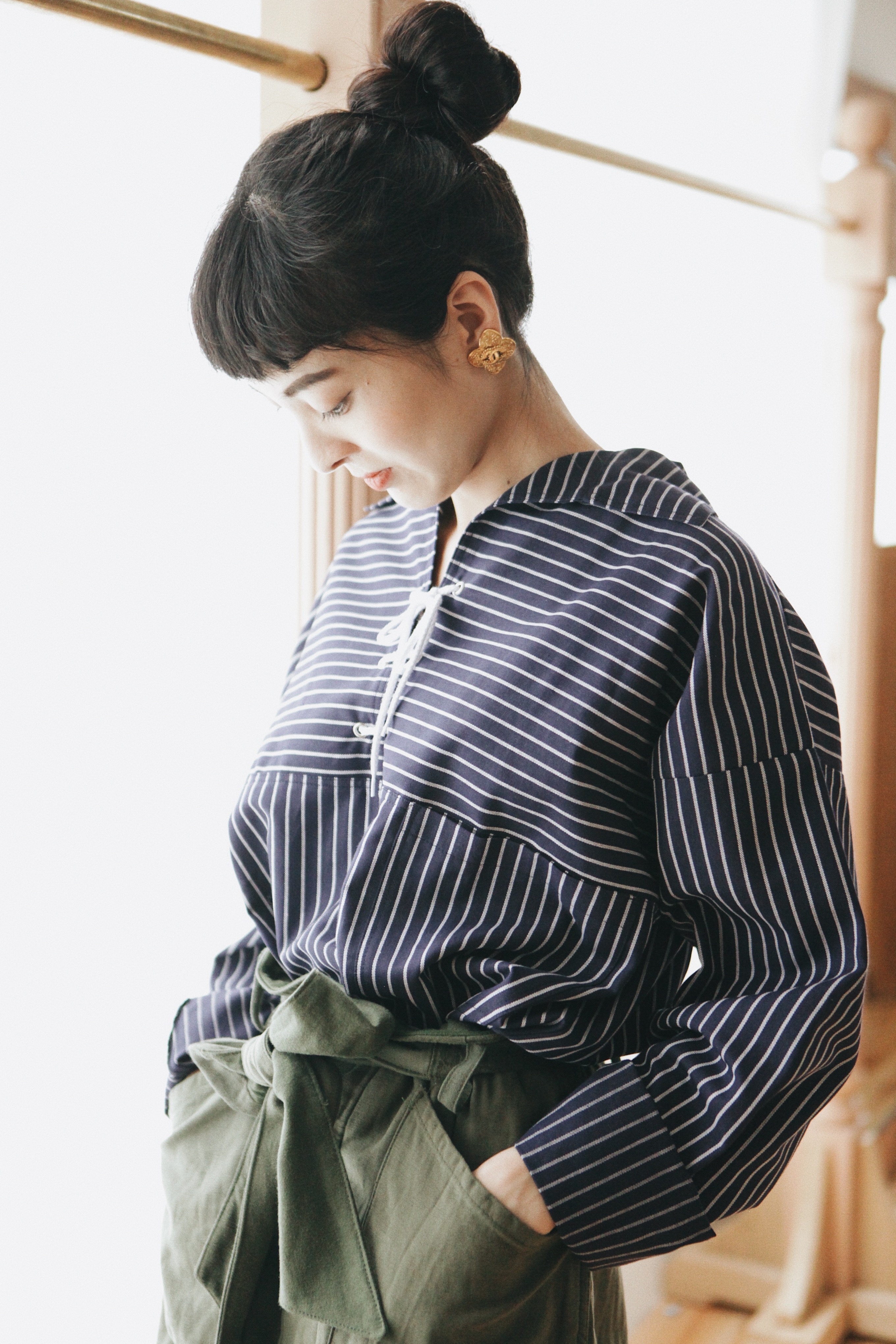 先是想到在腰部抓出打褶,再內加米色抽繩做出腰線,也能自然放鬆呈現中性輪廓。