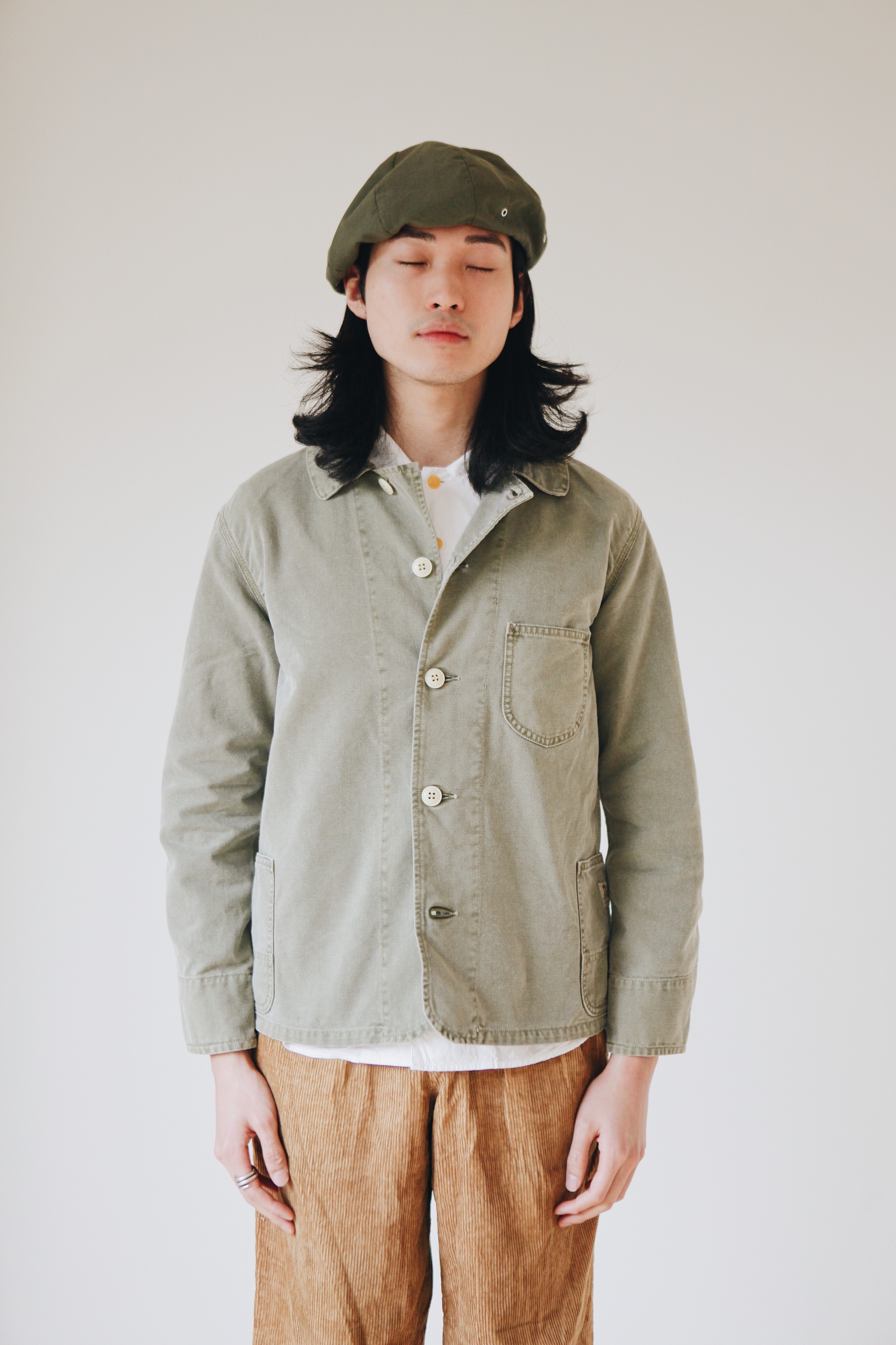 這款工裝外套具有早期美式工裝的諸多特色,簡約的版型、實用的四個方正口袋、寬鬆剪裁等。其中左胸口袋保留早期工人方便插筆的隔層設計,鈕扣使用印有品牌字樣的金色甜甜圈鈕扣。布料使用堅韌的T/C斜紋布料,斜紋布織出的織紋為斜向的紋路,比一般平織布厚且更為耐用。為了克服斜紋布透氣性問題,誕生了T/C斜紋布,透過35%的綿與65%的聚脂纖維混紡,保有斜紋布的耐磨性與聚脂纖維的透氣性,亦是Dickies等知名工裝品牌常用的布料。