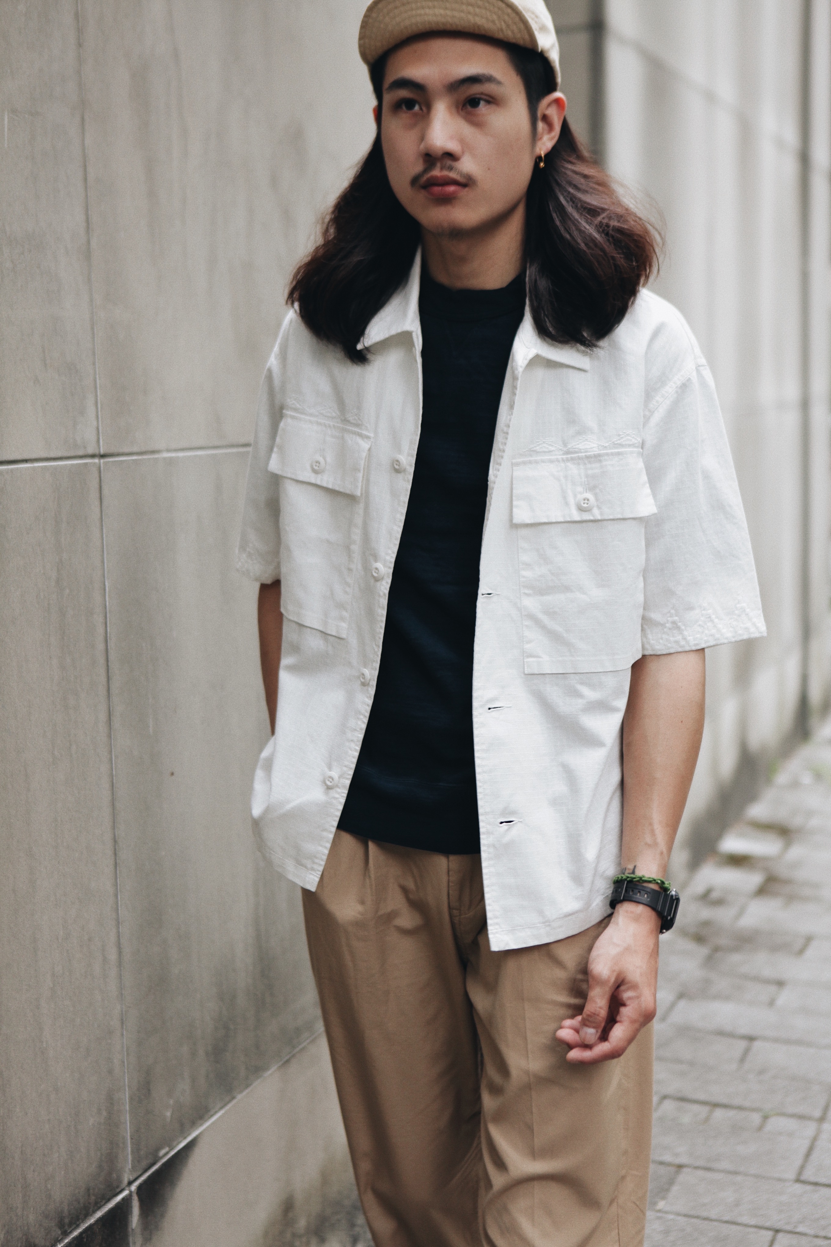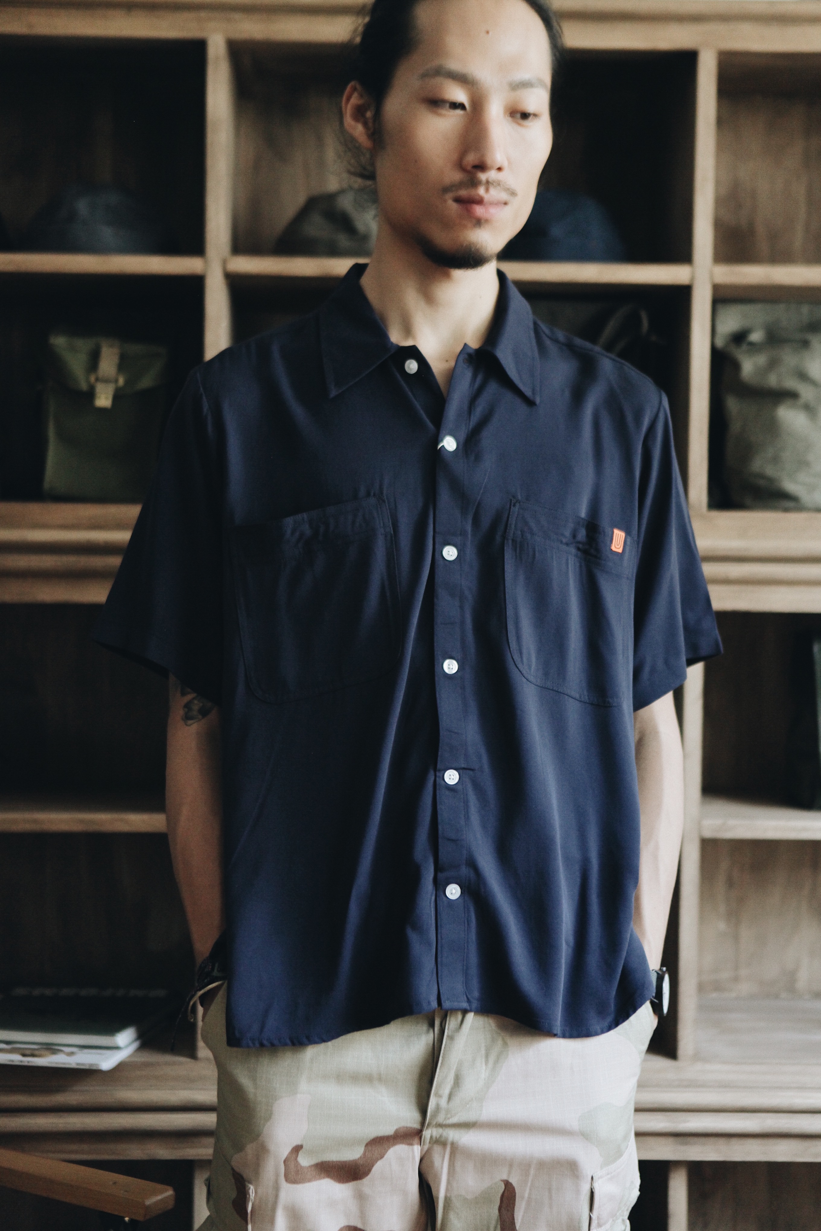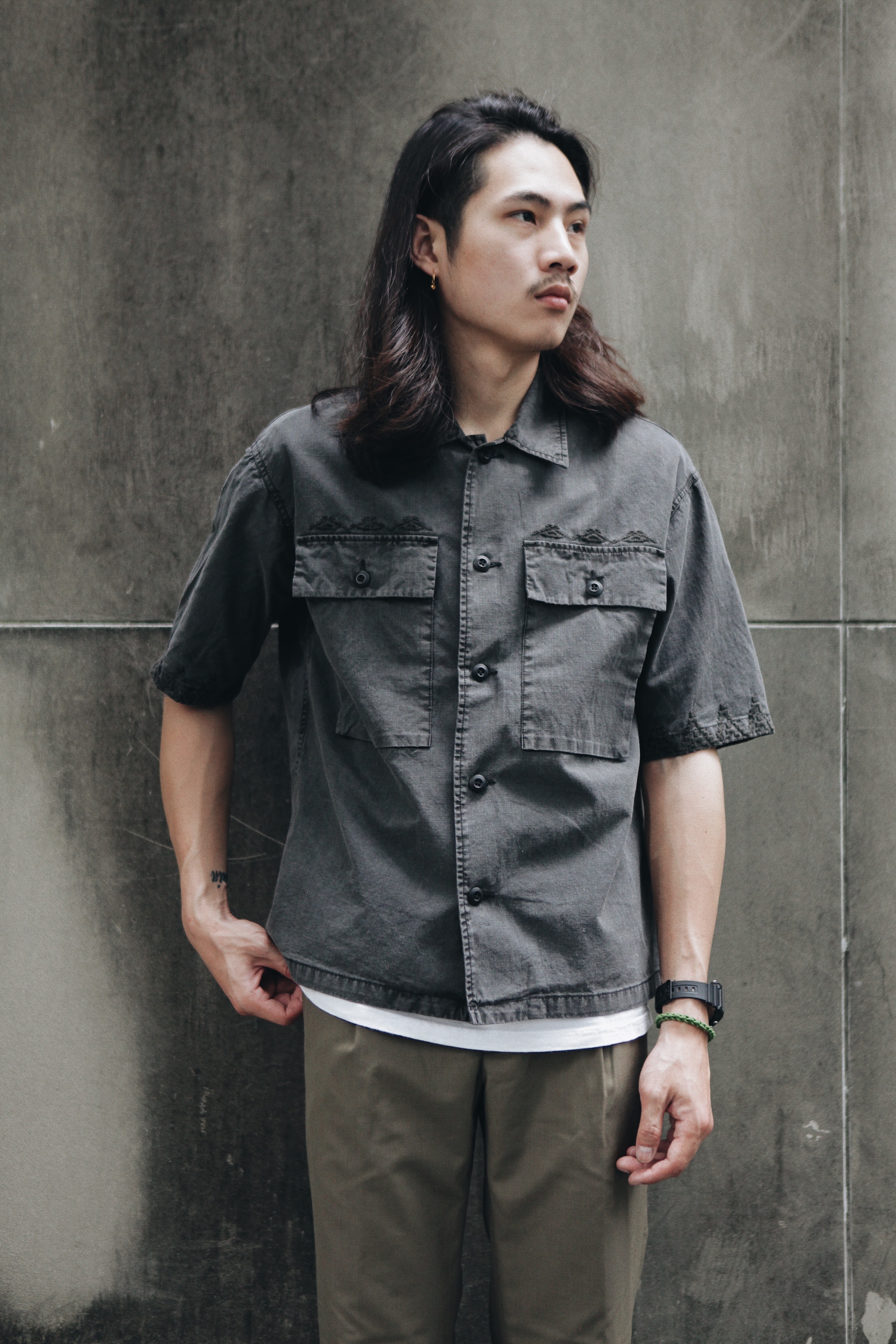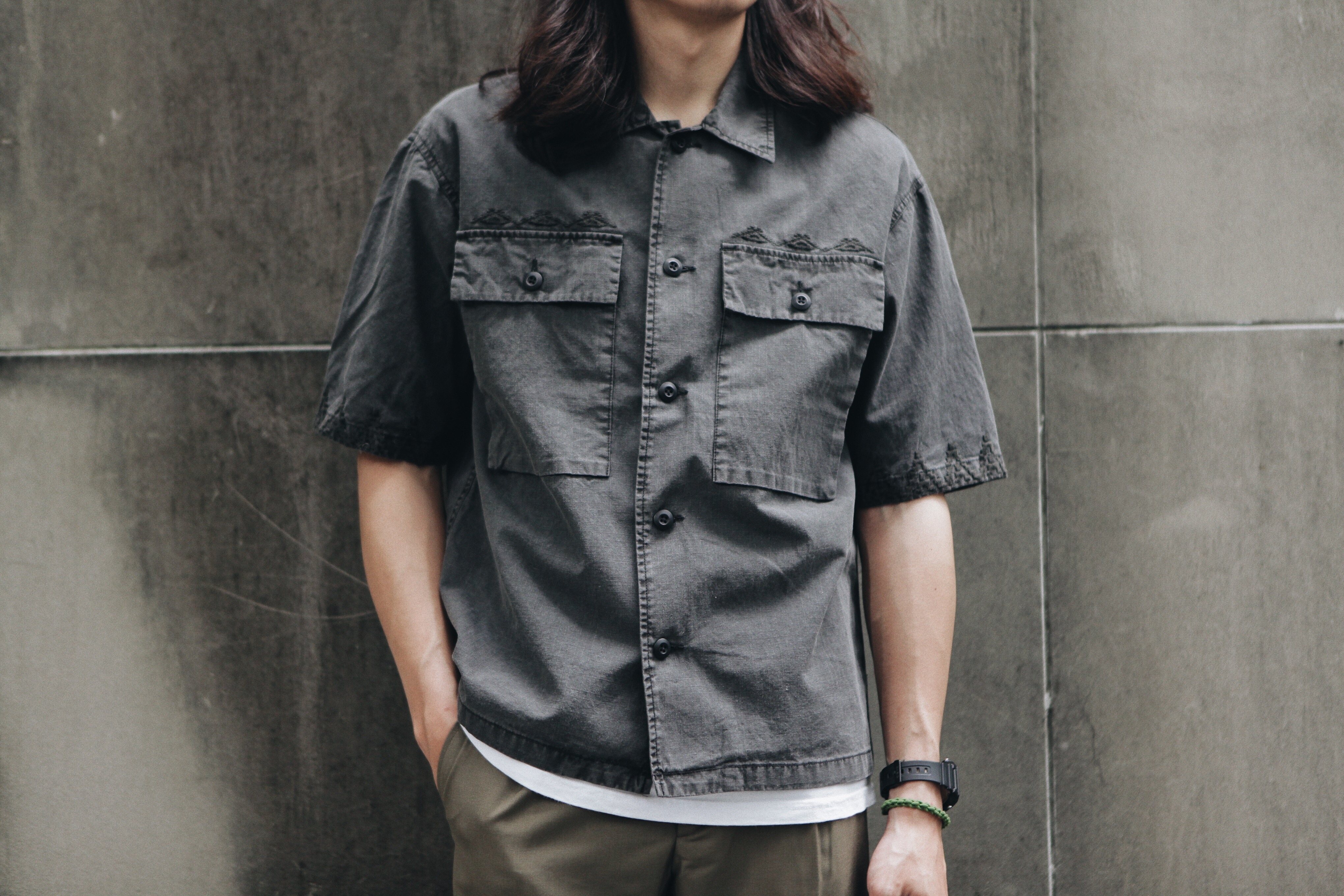 這款短袖襯衫版型寬身透氣舒適,袖子稍長、胸前獨立兩個立體的大口袋,口袋上方與袖口精細的刺繡增添復古氣息,同時蘊含軍裝的粗獷感。材質使用軍事BDU布料(Rip-Stop material十字紋布料,能抗撕裂、材質輕盈透氣),並混合了涼爽的亞麻及棉料,硬挺布料能在夏天掩護你不受汗水影響帥氣。