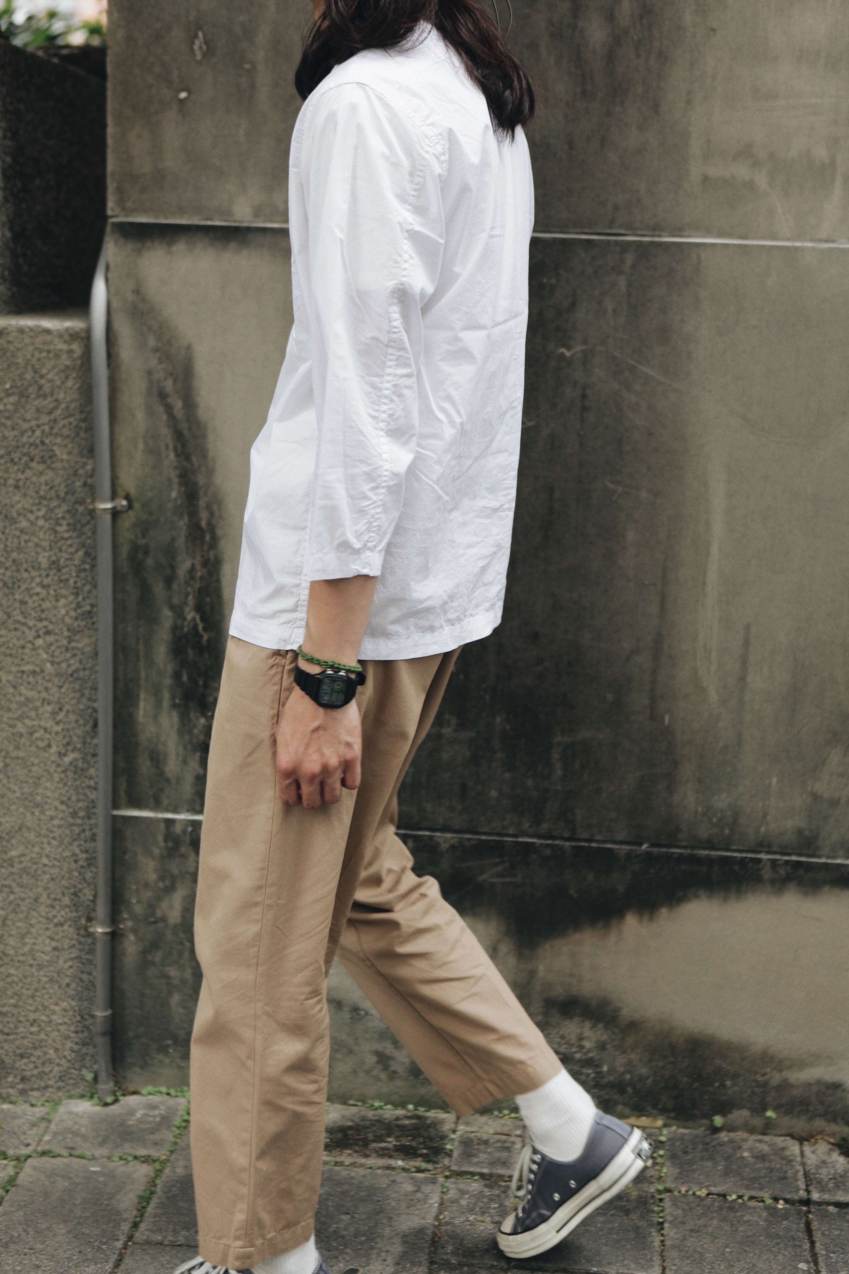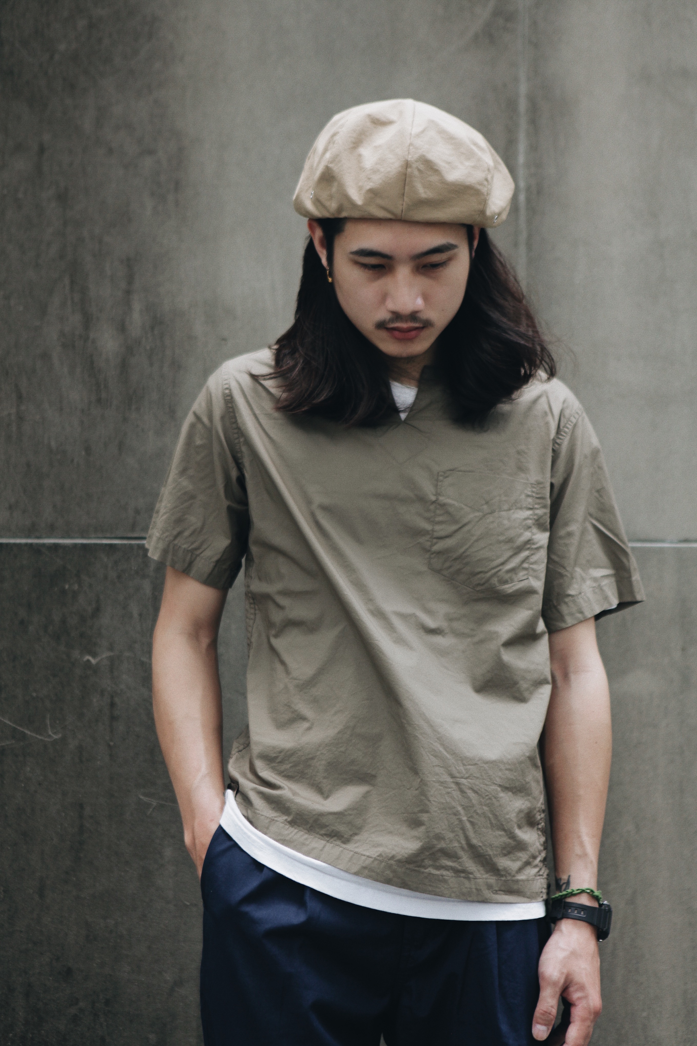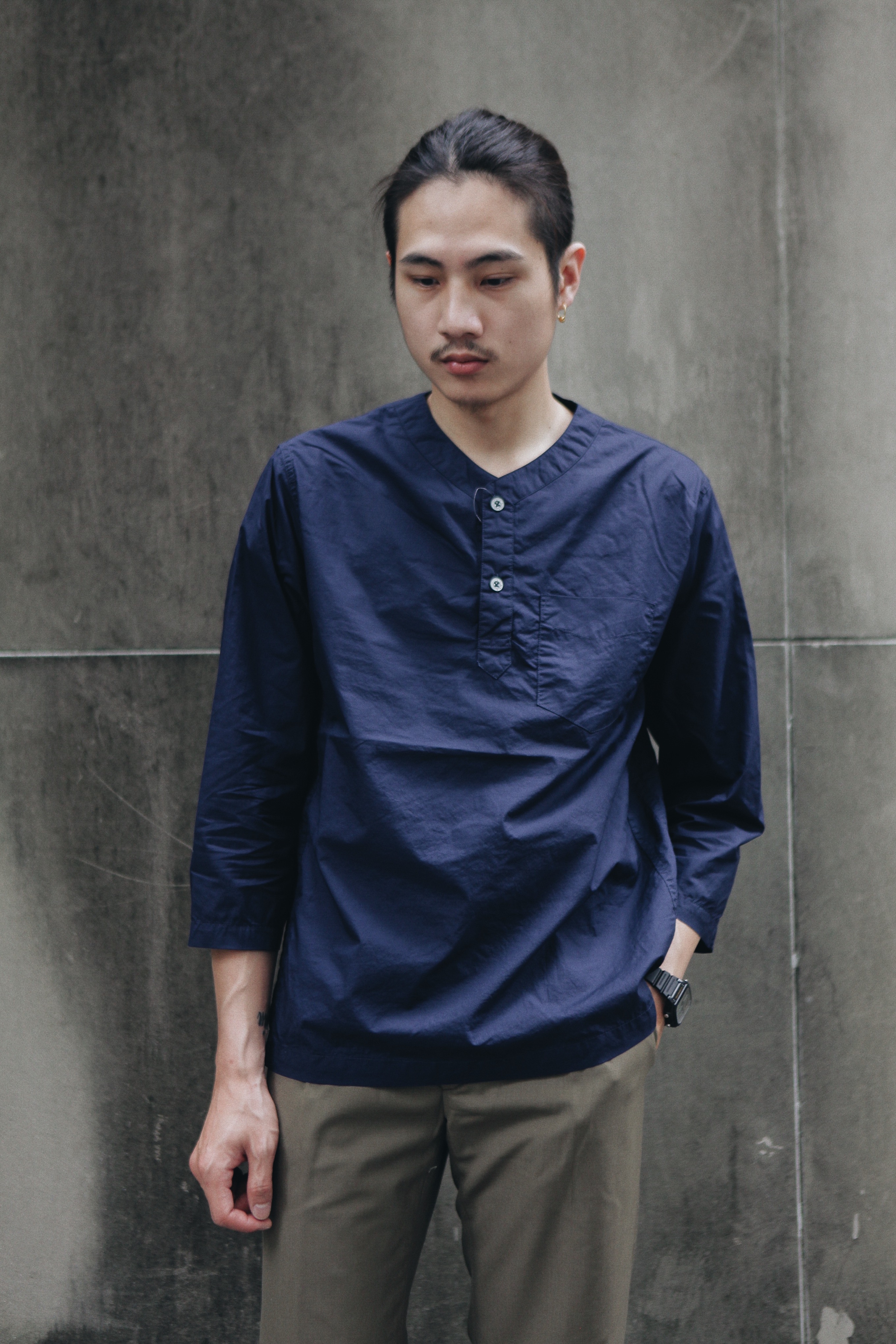這款上衣靈感便來自軍用睡衣,領口的鐵扣承襲早期軍品元素,面料使用純棉製作,類似棉麻材質,非常適合夏季的輕薄透氣舒適度。九分袖長及寬身的版型,帶點休閒感,且能在正式場合中穿著得宜。