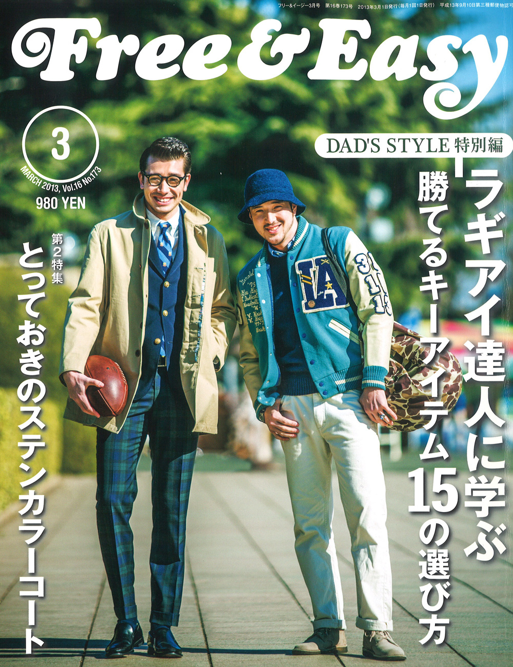 專門介紹Rugged & American Traditional的硬派雜誌《Free&Easy》創刊於1998年,主打休閒粗獷成熟風格,在崇尚年輕、漂亮男孩的主流雜誌圈裡樹立了獨樹一格的道路。《Free&Easy》致力於推廣Vintage文化,除了古著以外,熟男有興趣的汽機車、唱片、腕錶也是話題之一;甚至是產品的製作方式、產品開發的歷程、工廠直擊等幕後故事也是著墨點。可惜《Free&Easy》在2016年宣告休刊,現有的刊物也更顯收藏價值。