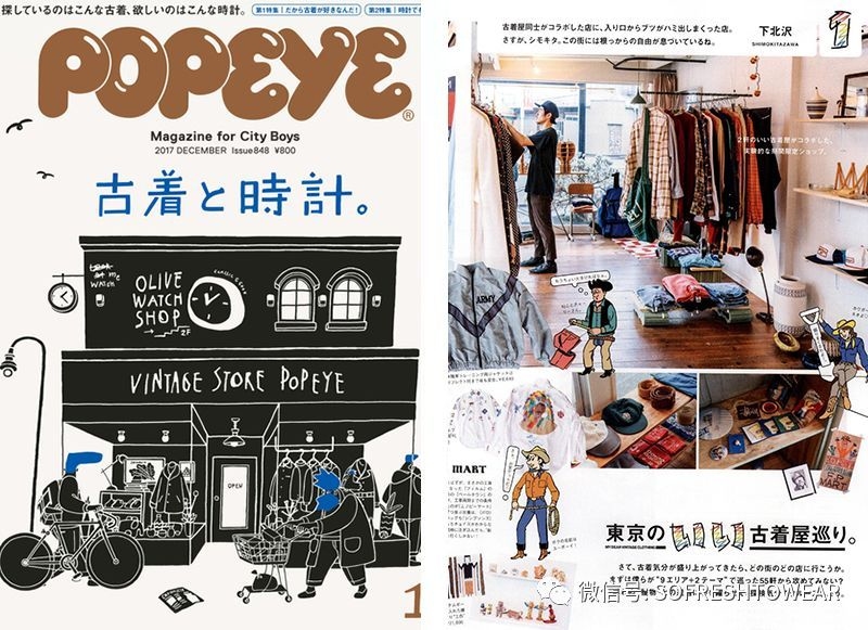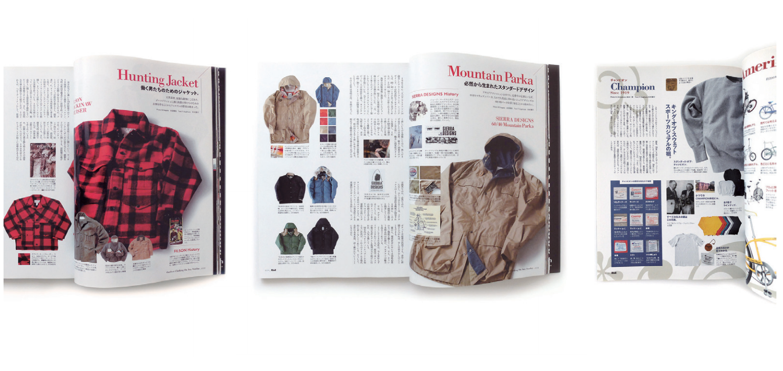 可以說,一開始的古著文化源於日本年輕人對美式生活、美式服裝的嚮往渴求,這個文化的推手之一是《made in U.S.A.》、《popeye》雜誌的總編輯木滑良久和他的團隊們。木滑良久、石川次郎想引介美國的生活方式給早期資訊封閉、出國昂貴不易的日本國人們。他們將在美國各處考察的結果集結成一本蒐集美國物品的型錄—《made in U.S.A.》雜誌。這本1975年上市的雜誌大獲日本年輕人好評,封面上的鈕扣式Levi's 501牛仔褲、Red Wing工作靴至今是古著裡的主力。年輕人在一般商店買不到這類商品,只能到阿美橫町的小店尋找古著獵人從美國淘來的二手。《made in U.S.A.》頻頻介紹L.L. Bean獵鴨靴、法蘭絨襯衫、尼龍Aonrak套頭衫,帶起年輕人對美式風格的熱情。隨著《made in U.S.A.》的成功,木滑良久、石川次郎1976年推出《popeye》雜誌更是瞄準了美國西岸光明燦爛的美式生活,衝浪運動、converse帆布鞋、puma的休閒鞋、美國名校的棒球衫讓年輕人趨之若鶩,《popeye》成功帶起日本年輕人對世界時髦大城市流行的響往,這些單品也隨著年代越顯現出經典的價值與文化意義。