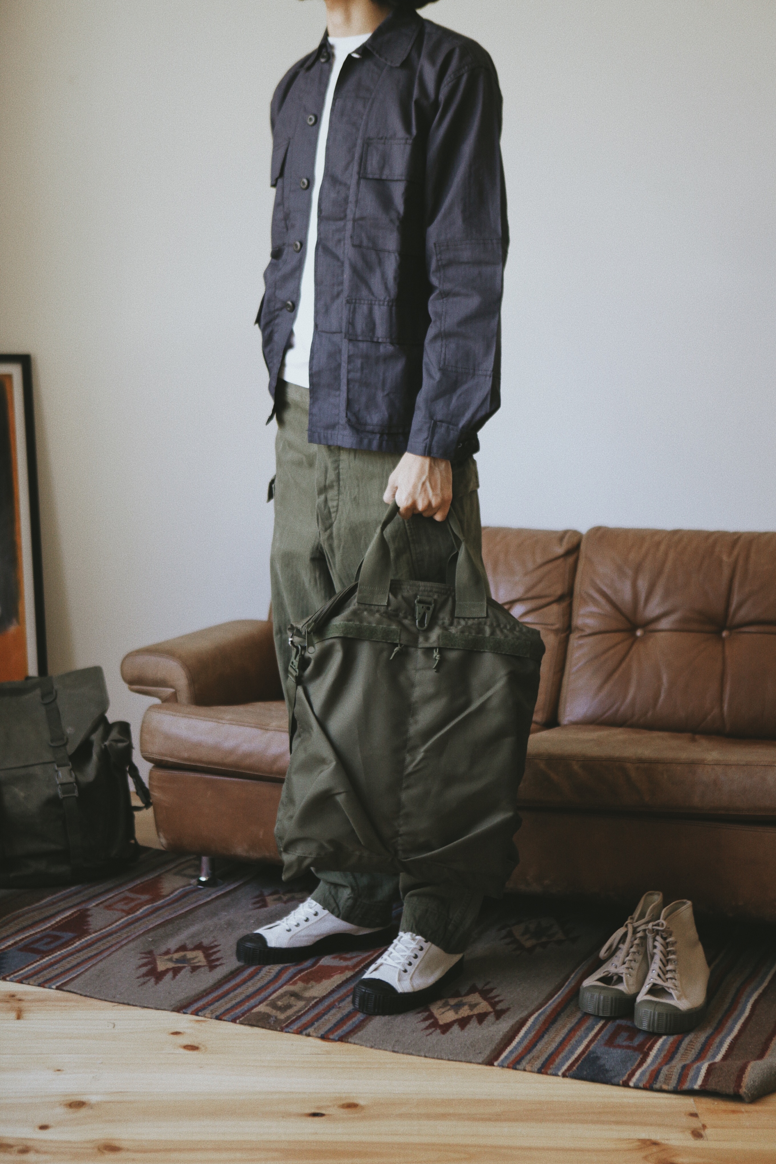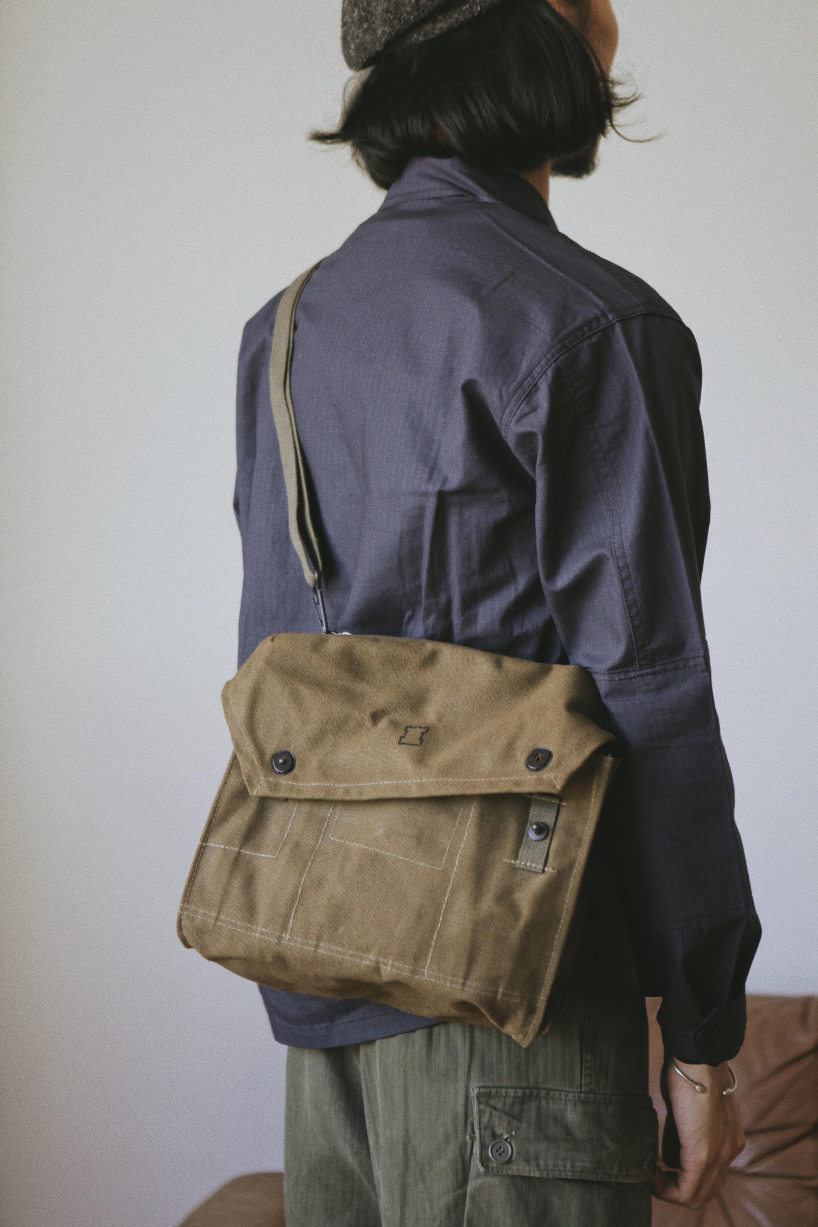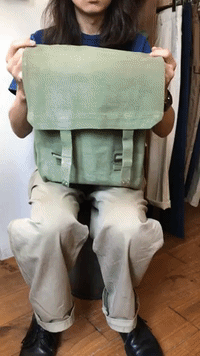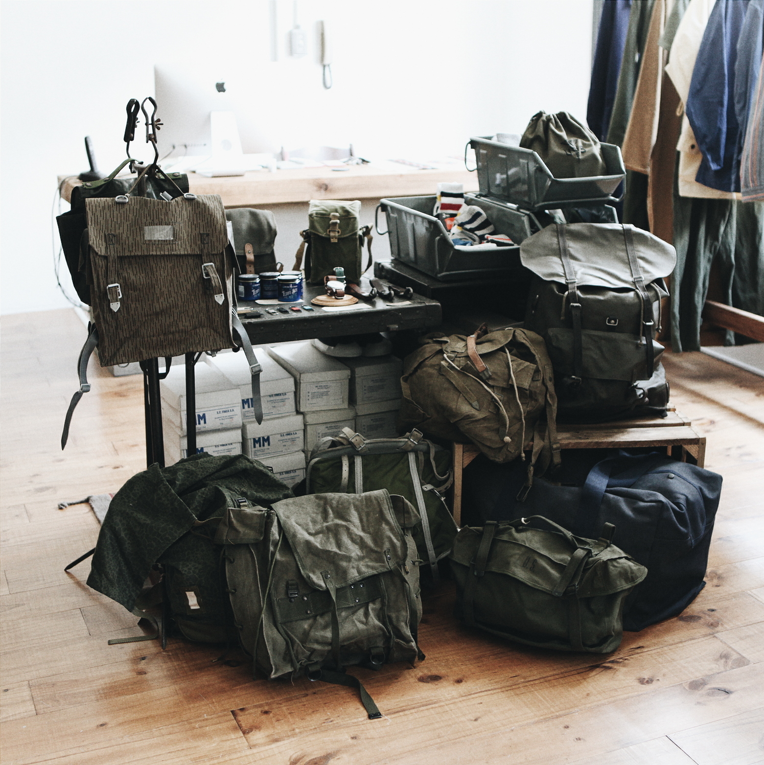 除了服裝之外,喜愛老品的客人一定不會忽略店內一顆顆外型獨特、實用且每個都有故事來歷的軍包們。這些年紀可能比各位還大的老包們,產出都有原始的用途,例如小型的圓筒、方形包包們,許多是兩次世界大戰時期的防毒面具包,當時使用化學武器為一種常態的交戰手段,因此出現許多裝放面具的包款,這些包包通常還有數個較小的隔層放置使用手冊、神經毒素解毒劑等物品,光是這樣的描述就可以感受到當時的歷史氛圍與老包的魅力;或是這顆Rolling on復刻的美國紅十字會小包,外型實屬罕見,在二戰時期這種小袋子兼有圍裙、收納、隨身背包三種用途,此時腦中已經可以幻想一個醫務兵快速的將背帶束帶解開綁成圍裙為傷患醫治的畫面。