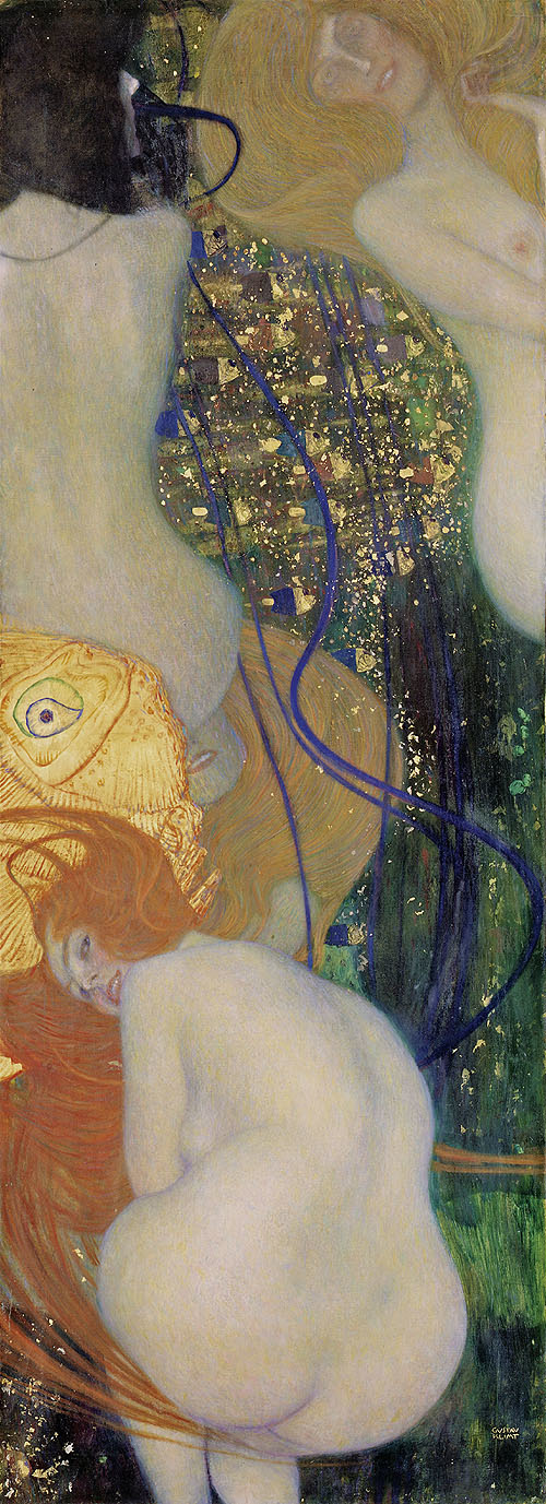 在狹長形的畫面上幾個裸體女子彷彿在流水中曲線流動、秀髮飄逸,下方女子大膽的對觀者撅起豐滿的臀部,並挑逗的回視觀眾,女人與水、鮮紅髮色是畫家表現魔性時喜用的符號。