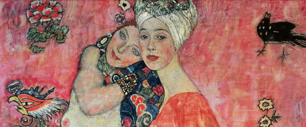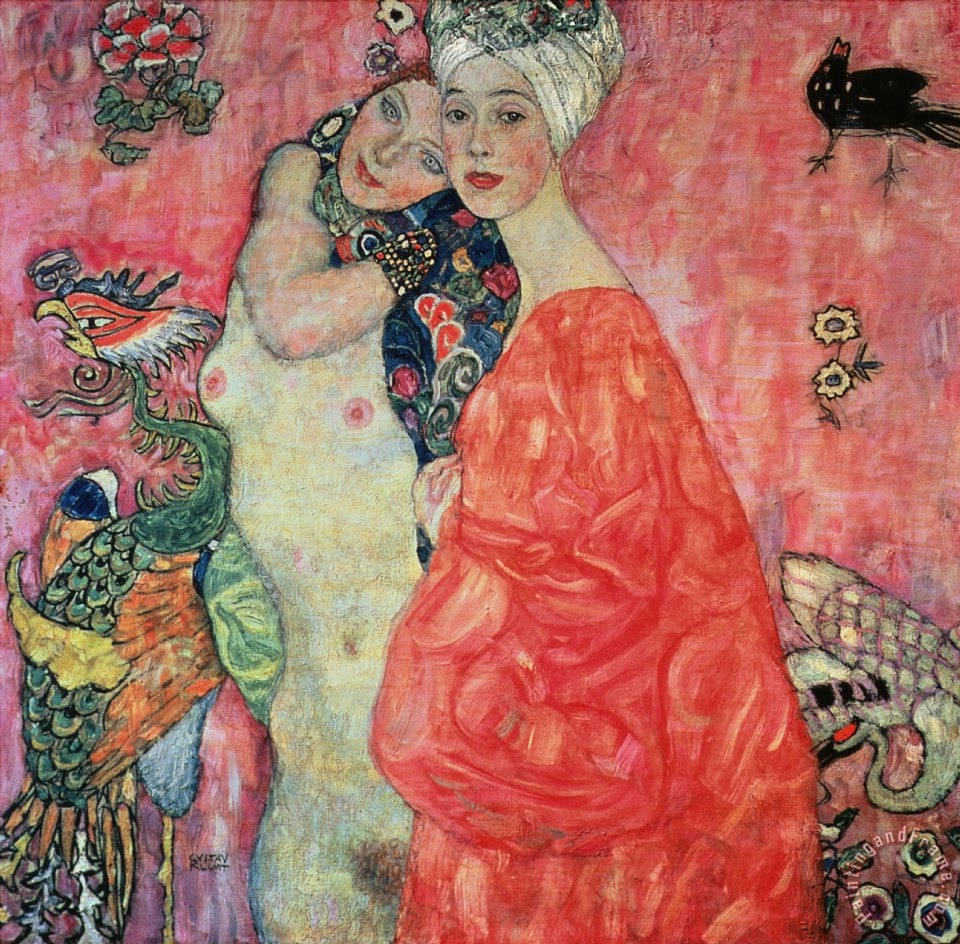 在這幅女朋友畫作中,他已放棄三維概念,畫面的裝飾達到完全的平面化,代表再生的鳳凰、華貴的牡丹、生命力的母雞環繞在周圍,而畫中的兩位女性親密的舉動暗示了同性戀的情誼。