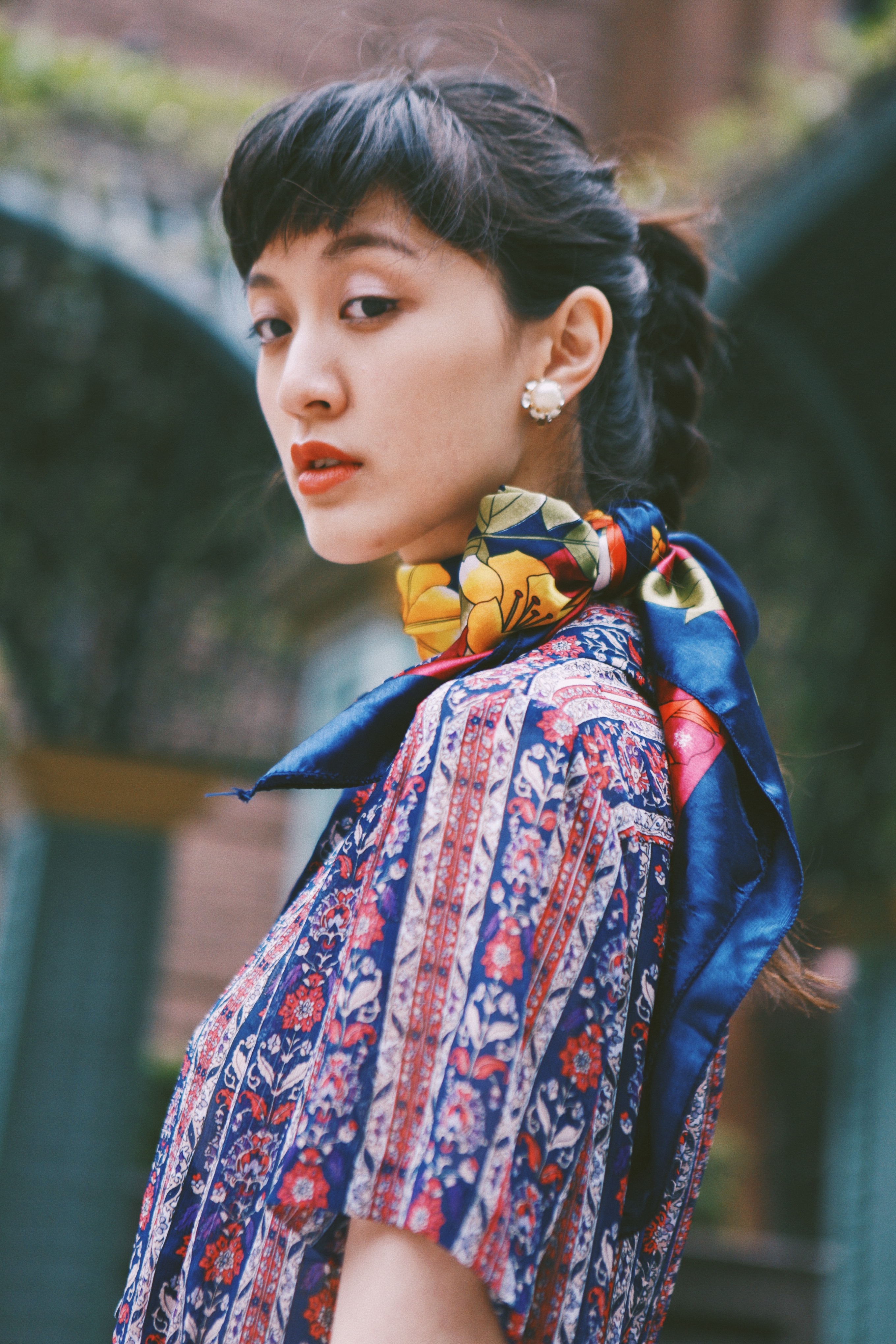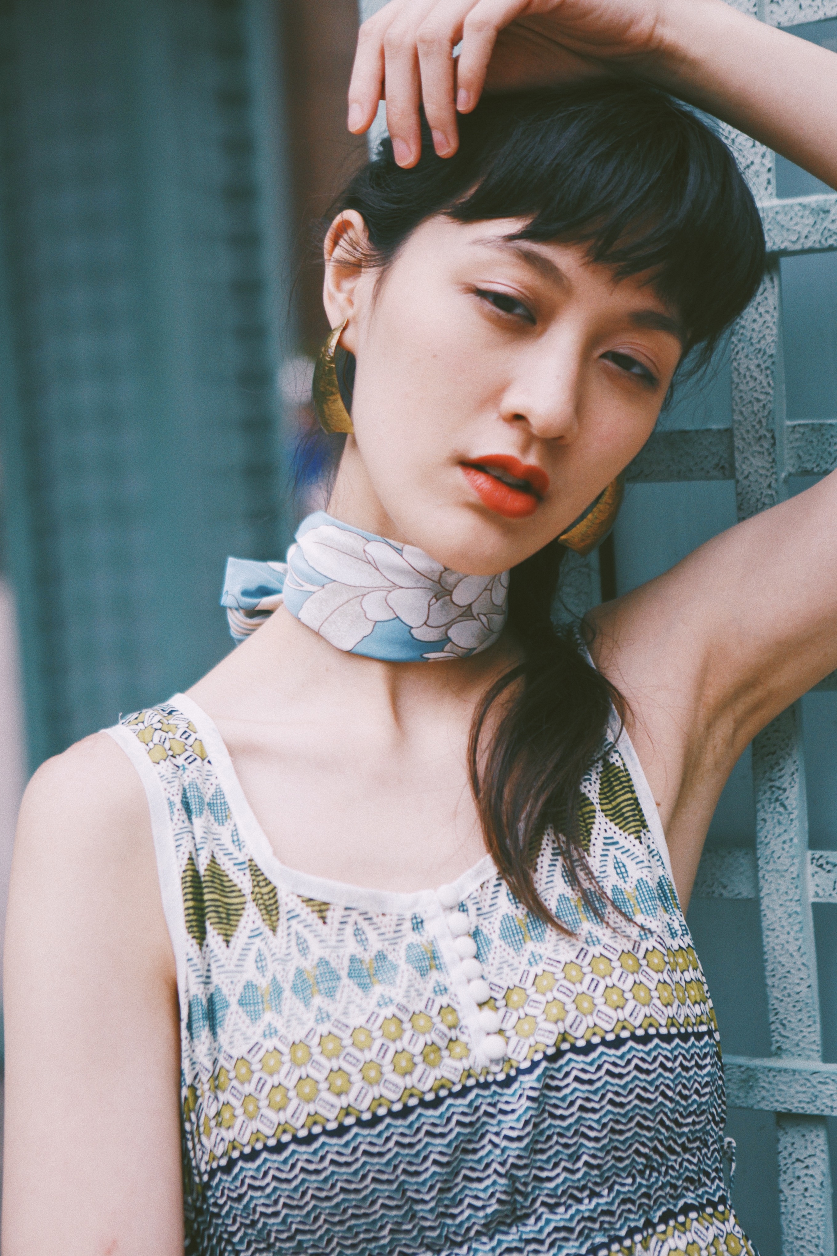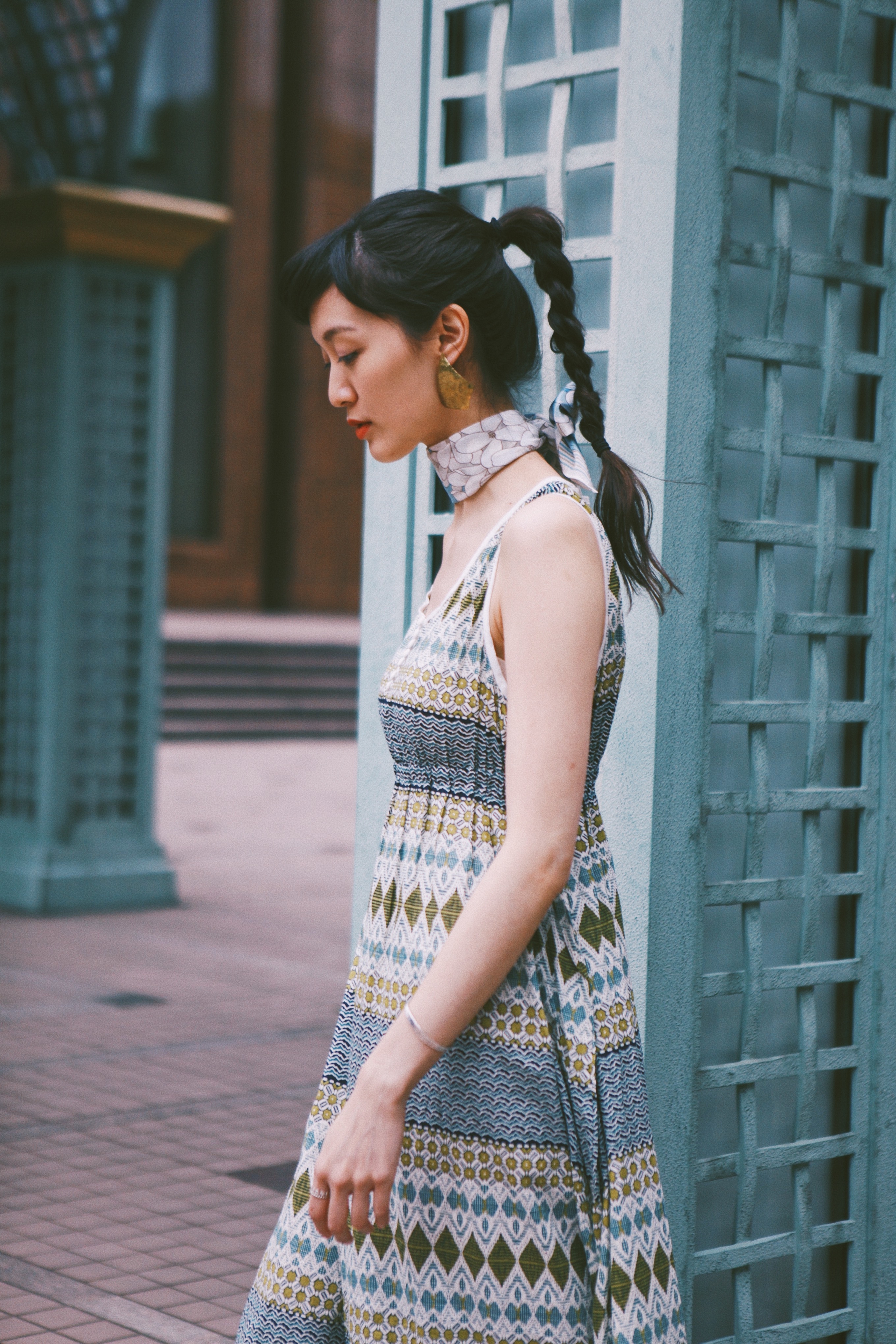 這幅畫作濃烈的東方意象在洋裝上同樣令人喜愛,紅綠色塊相間,裝飾性的花朵圖騰蜿蜒著。
