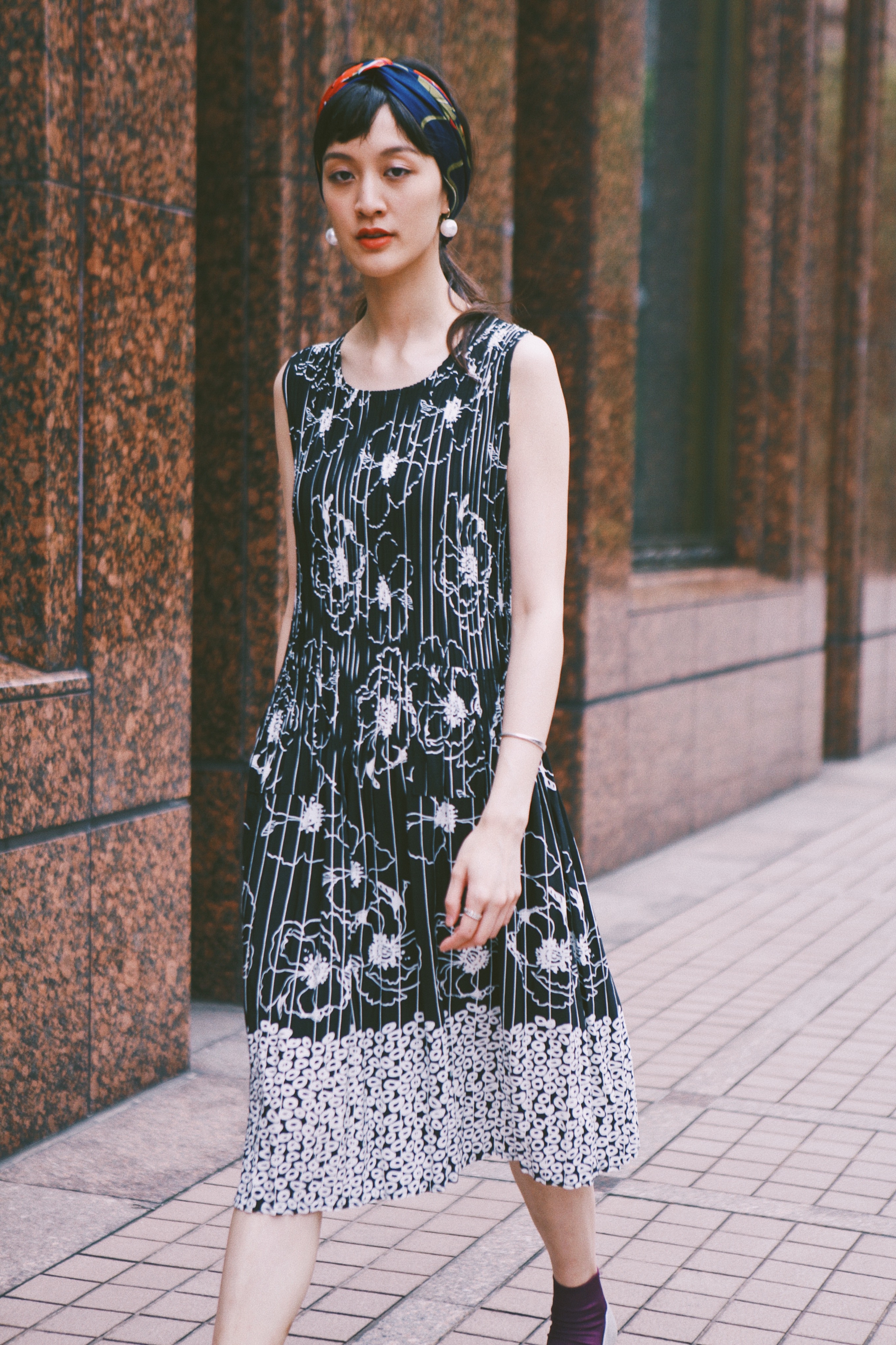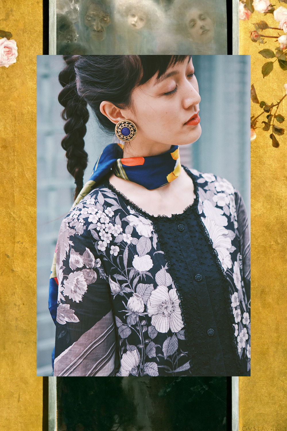 在洋裝上也可見到重複的牽牛花與漫舞的黃葉,展現浪漫的田園詩意。