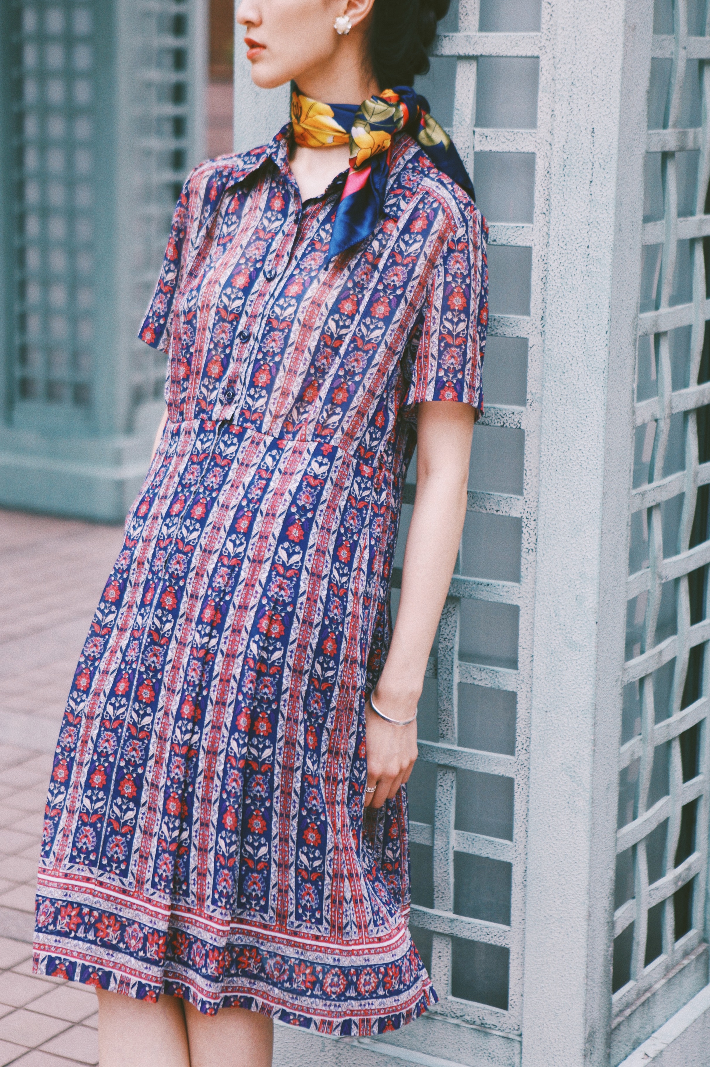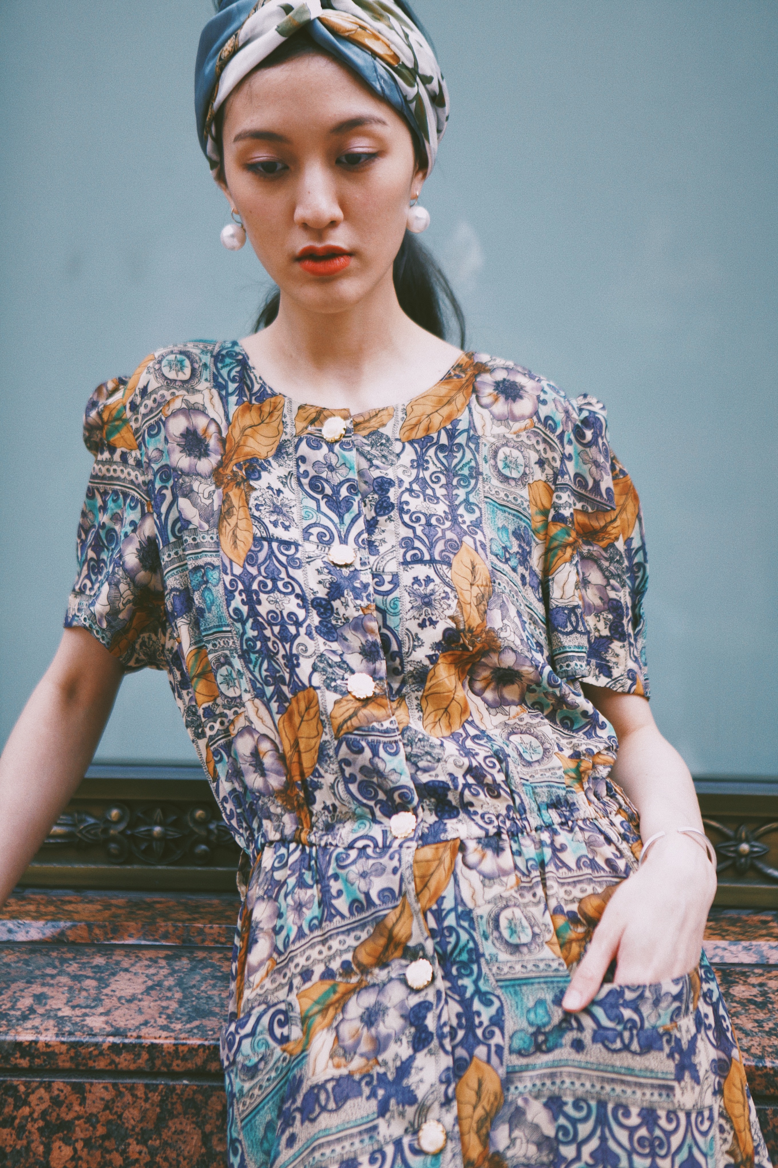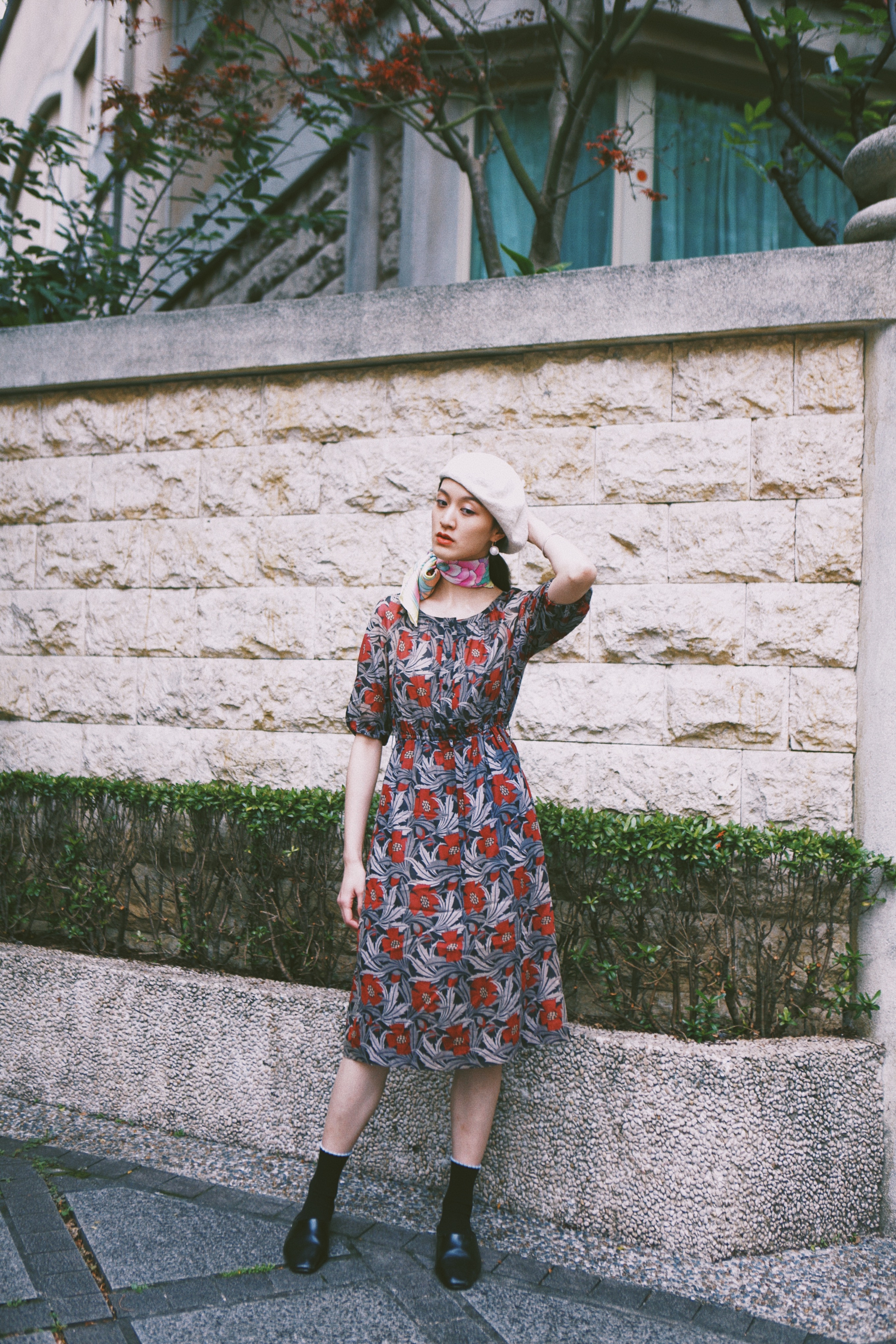 在Vintage上較少見到動物圖像,而這件洋裝則有滿滿與孔雀相似的鳥類,與花朵並列,非常特別少見。