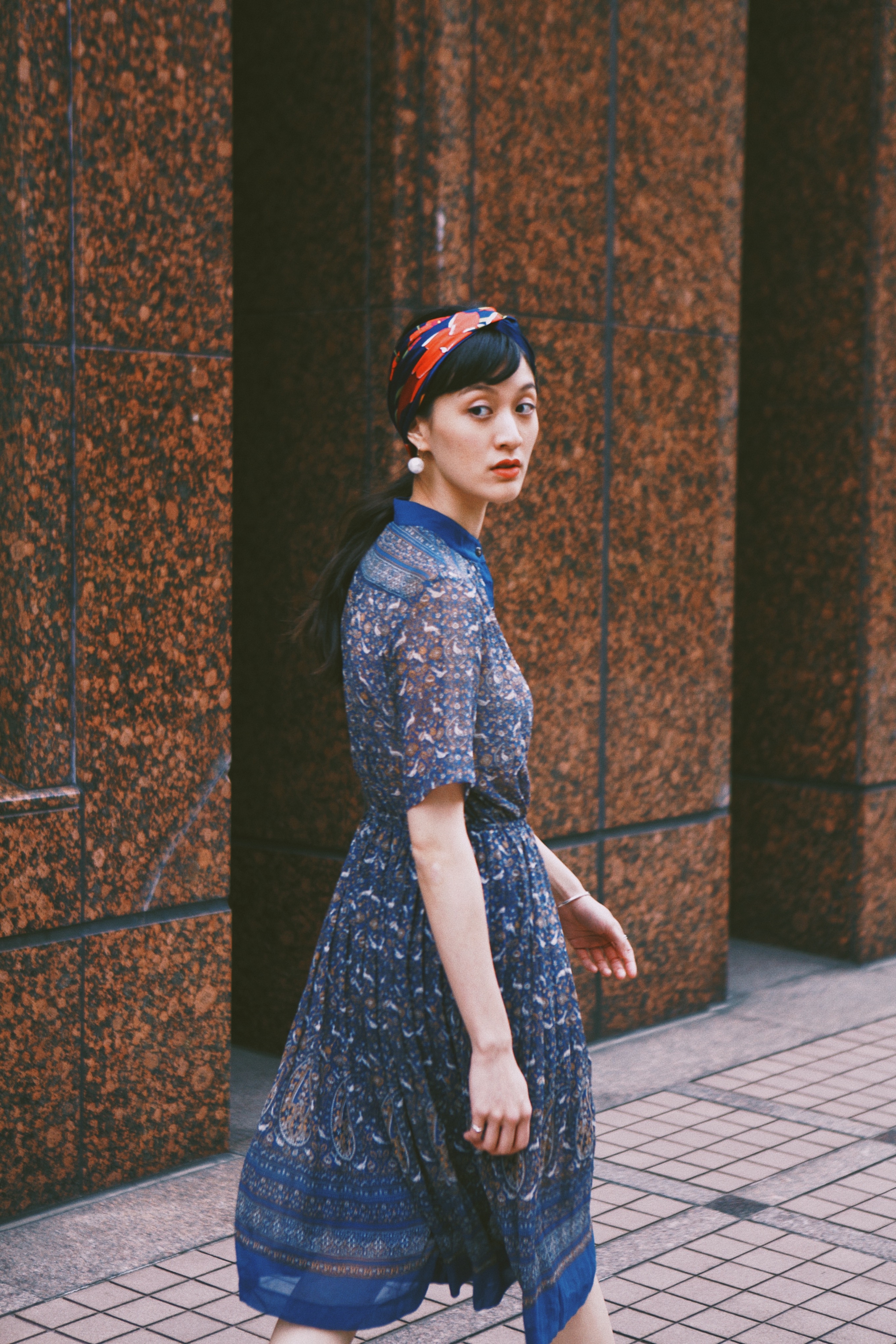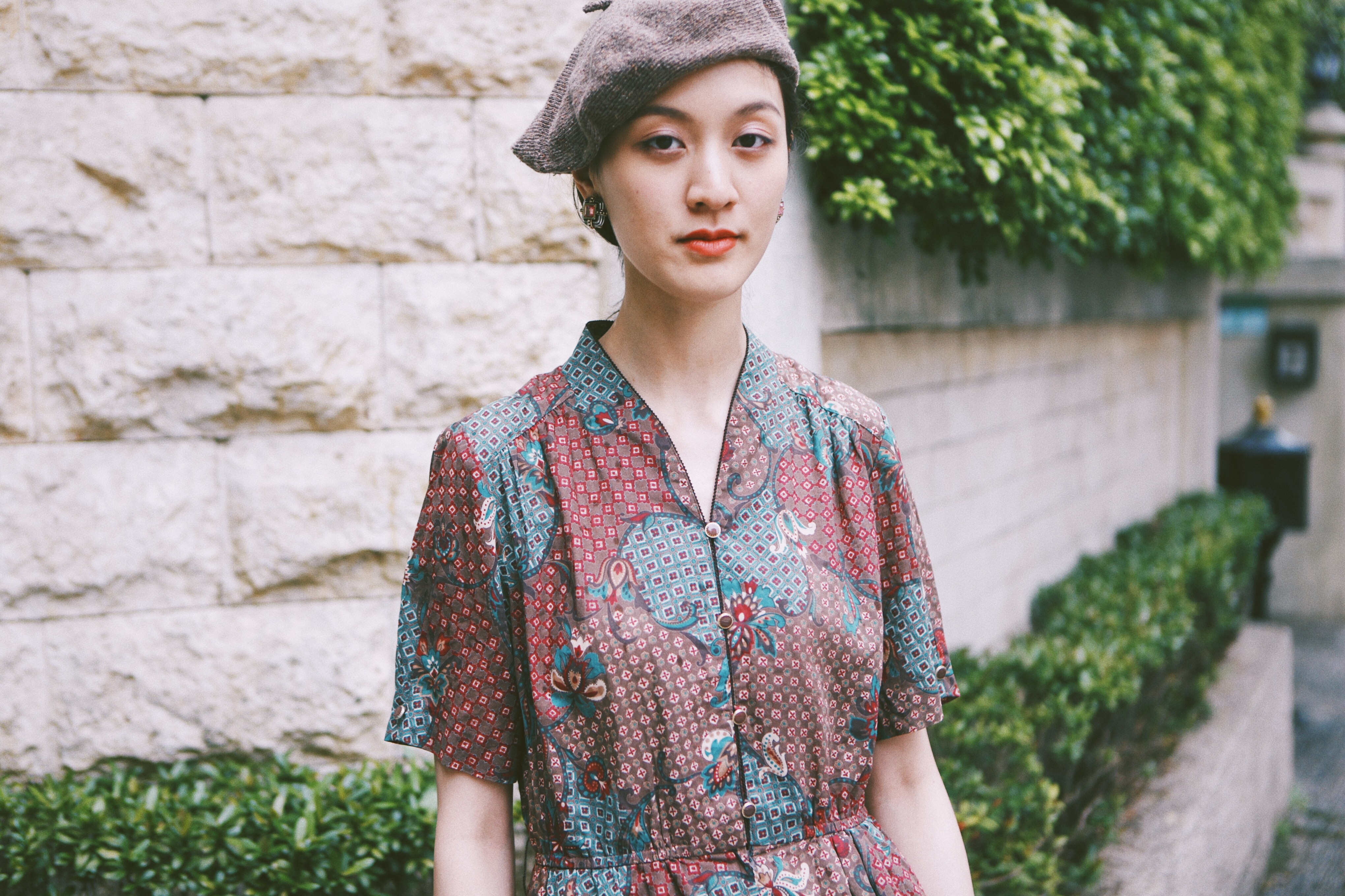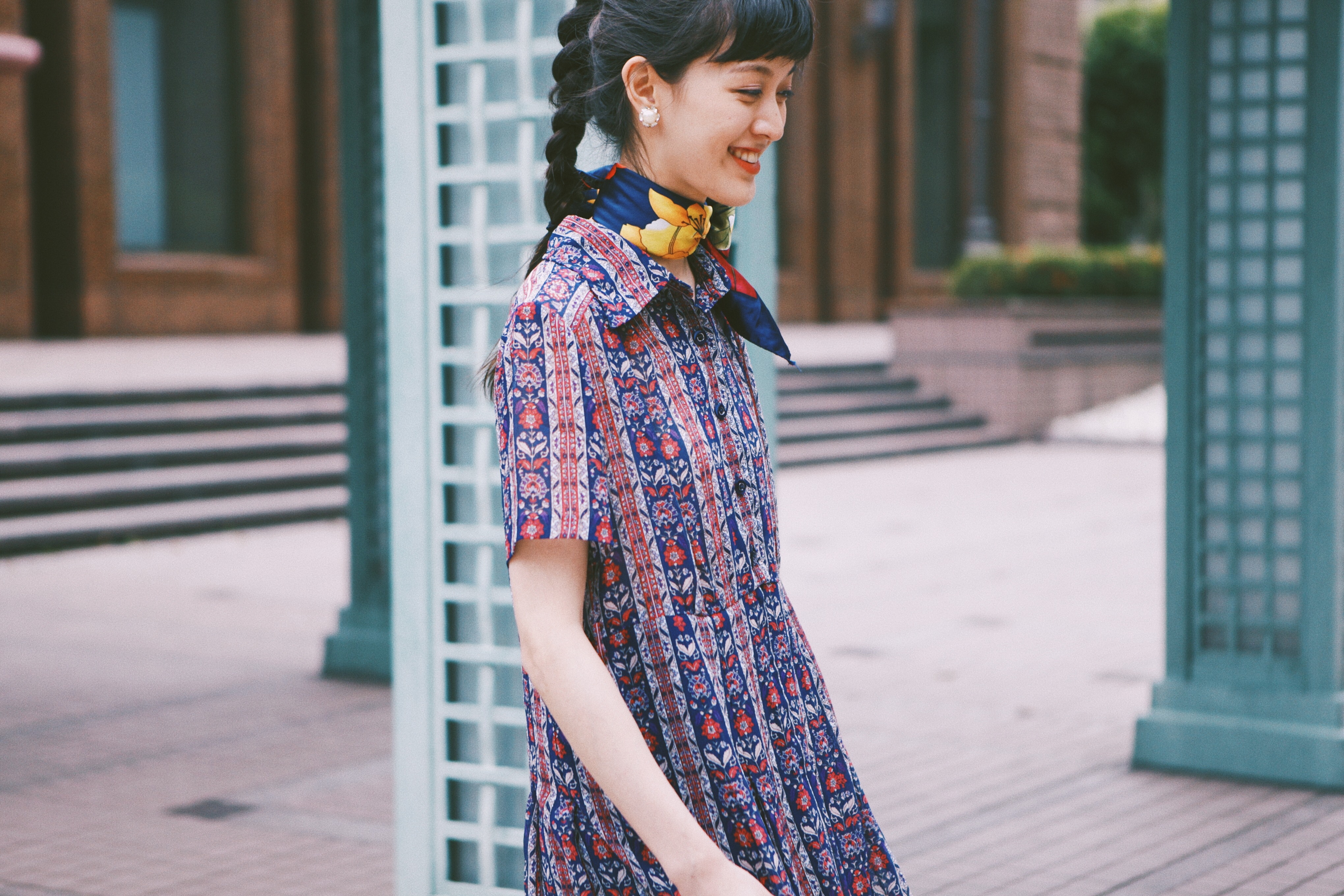 在Vintage上較少見到動物圖像,而這件洋裝則有滿滿與孔雀相似的鳥類,與花朵並列,非常特別少見。